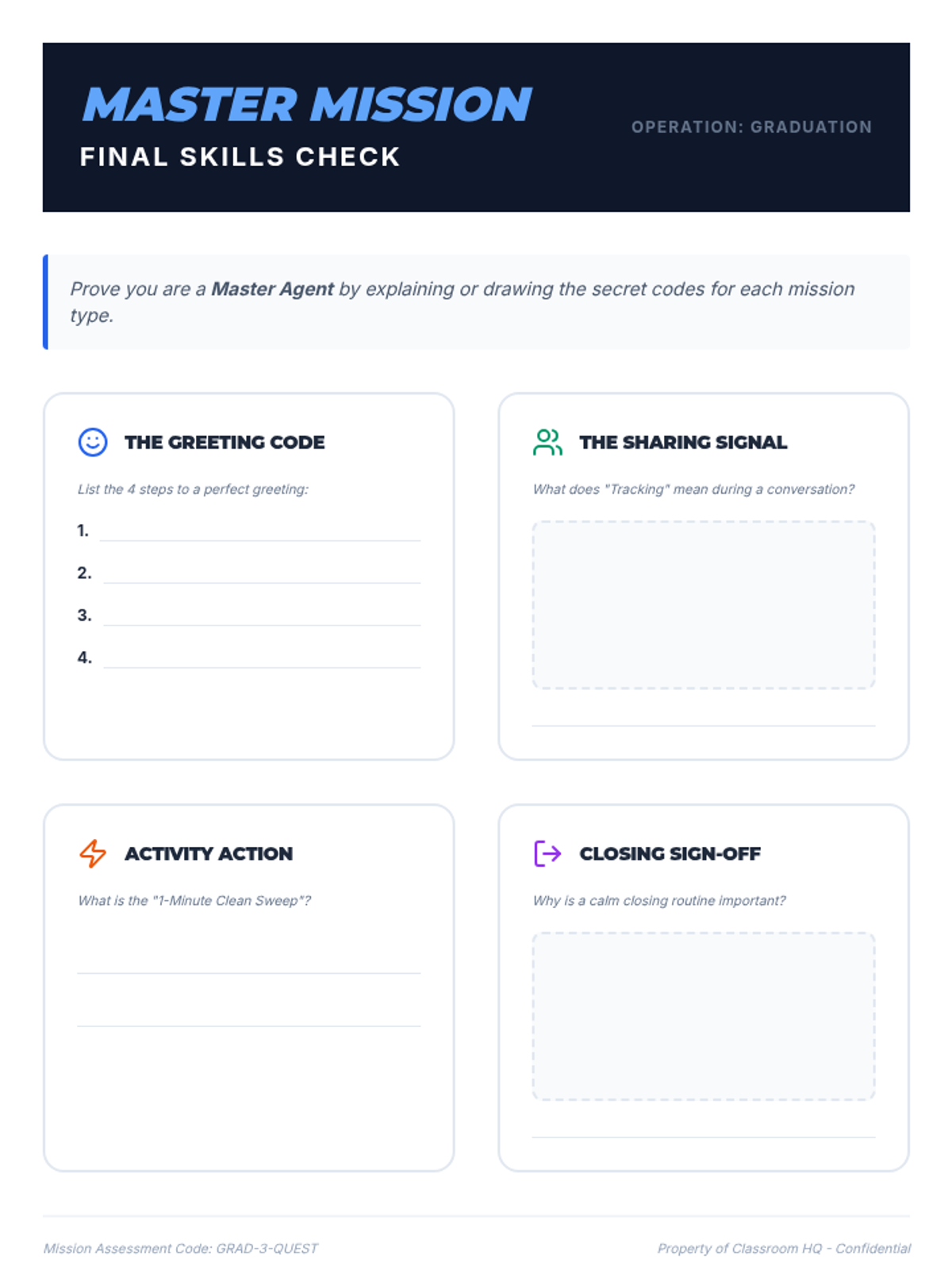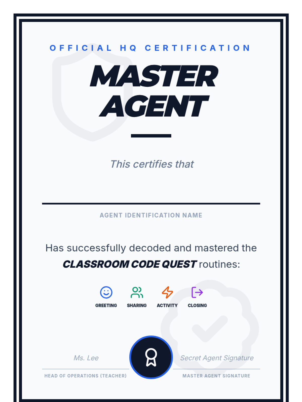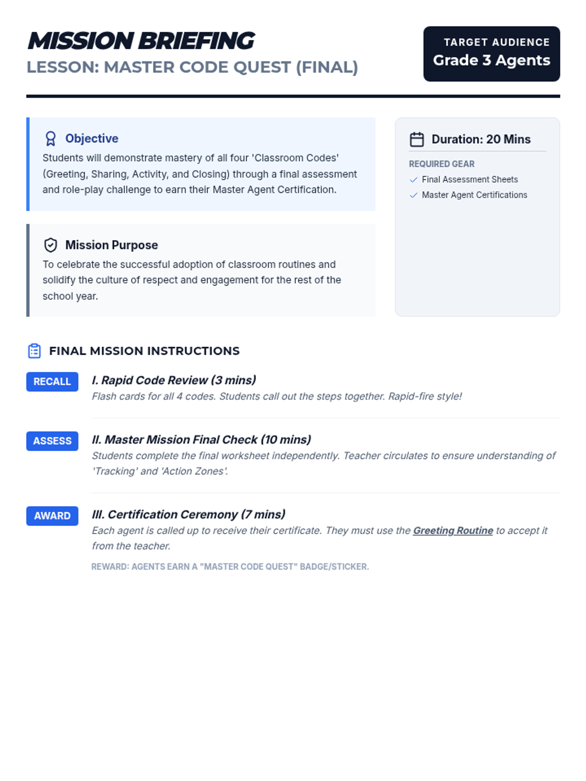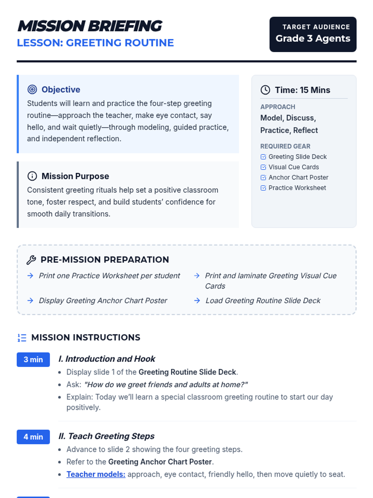 A five-session mini-lesson series where 3rd graders learn and practice classroom routines (greeting, sharing, activity, and closing) through a 'Secret Agent' theme. This Tier 1 program promotes respect, engagement, and consistency.