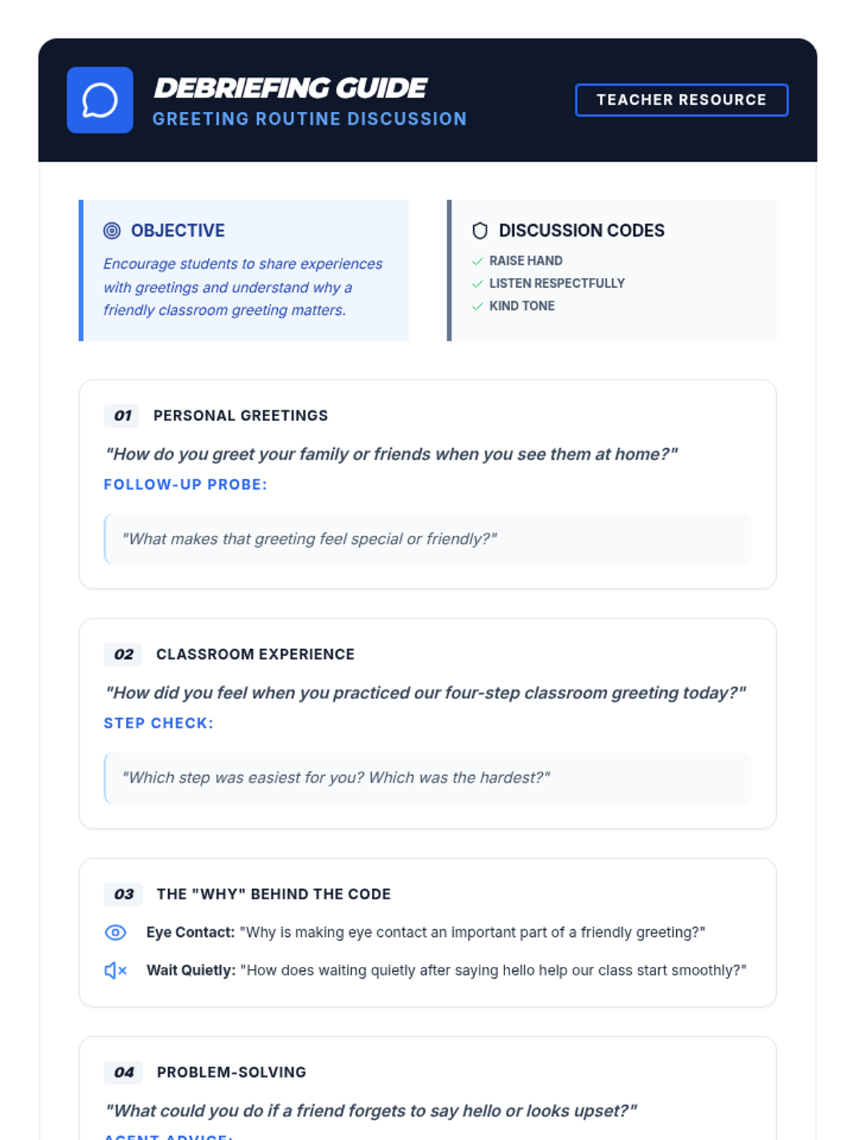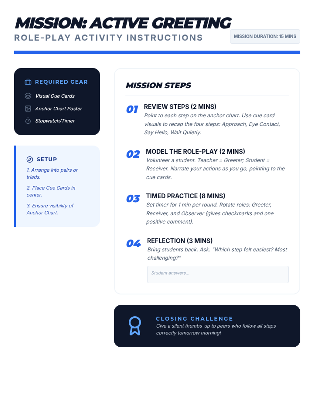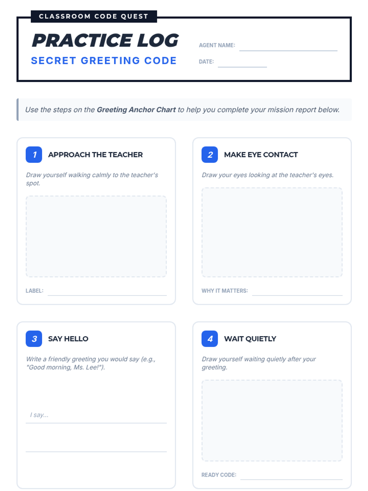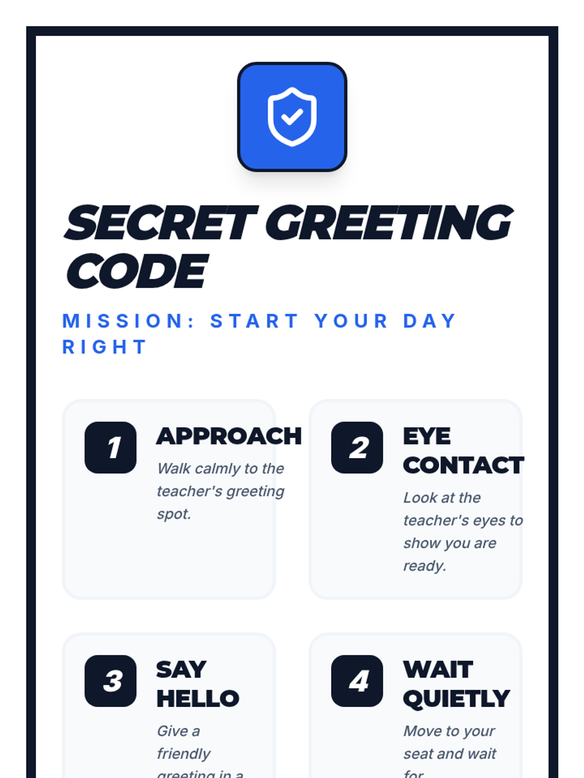 A five-session mini-lesson series where 3rd graders learn and practice classroom routines (greeting, sharing, activity, and closing) through a 'Secret Agent' theme. This Tier 1 program promotes respect, engagement, and consistency.