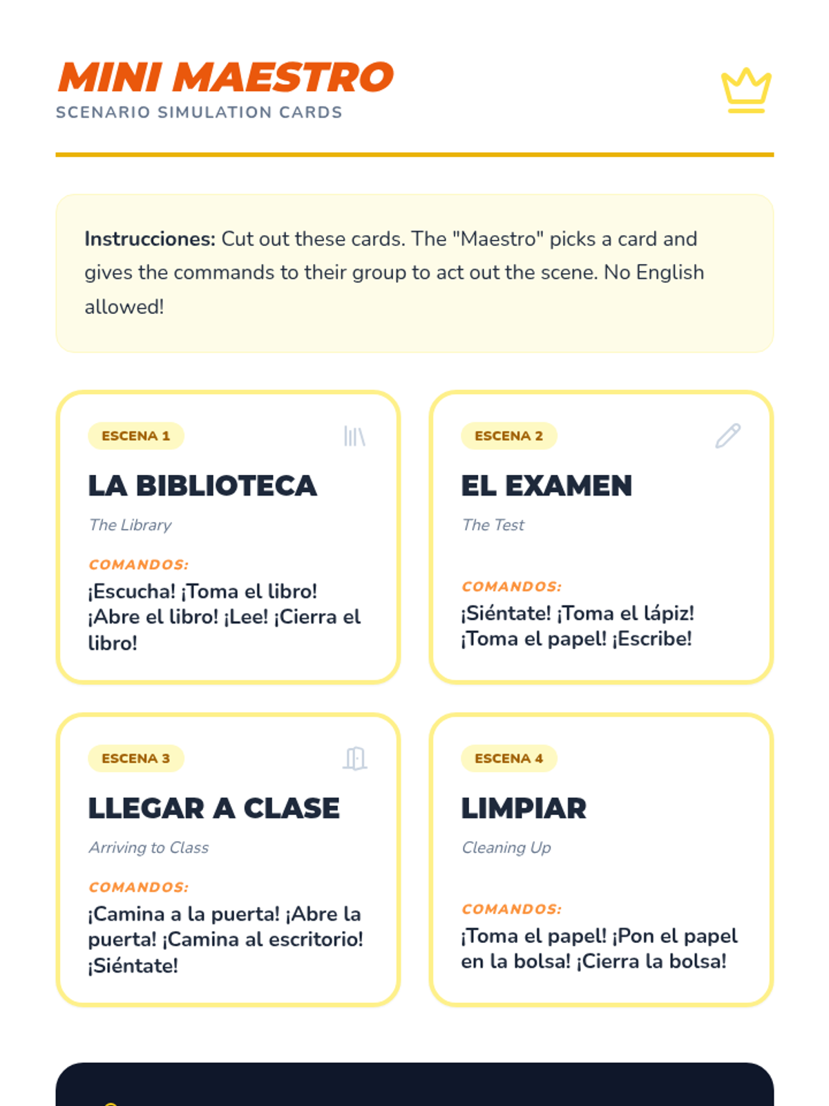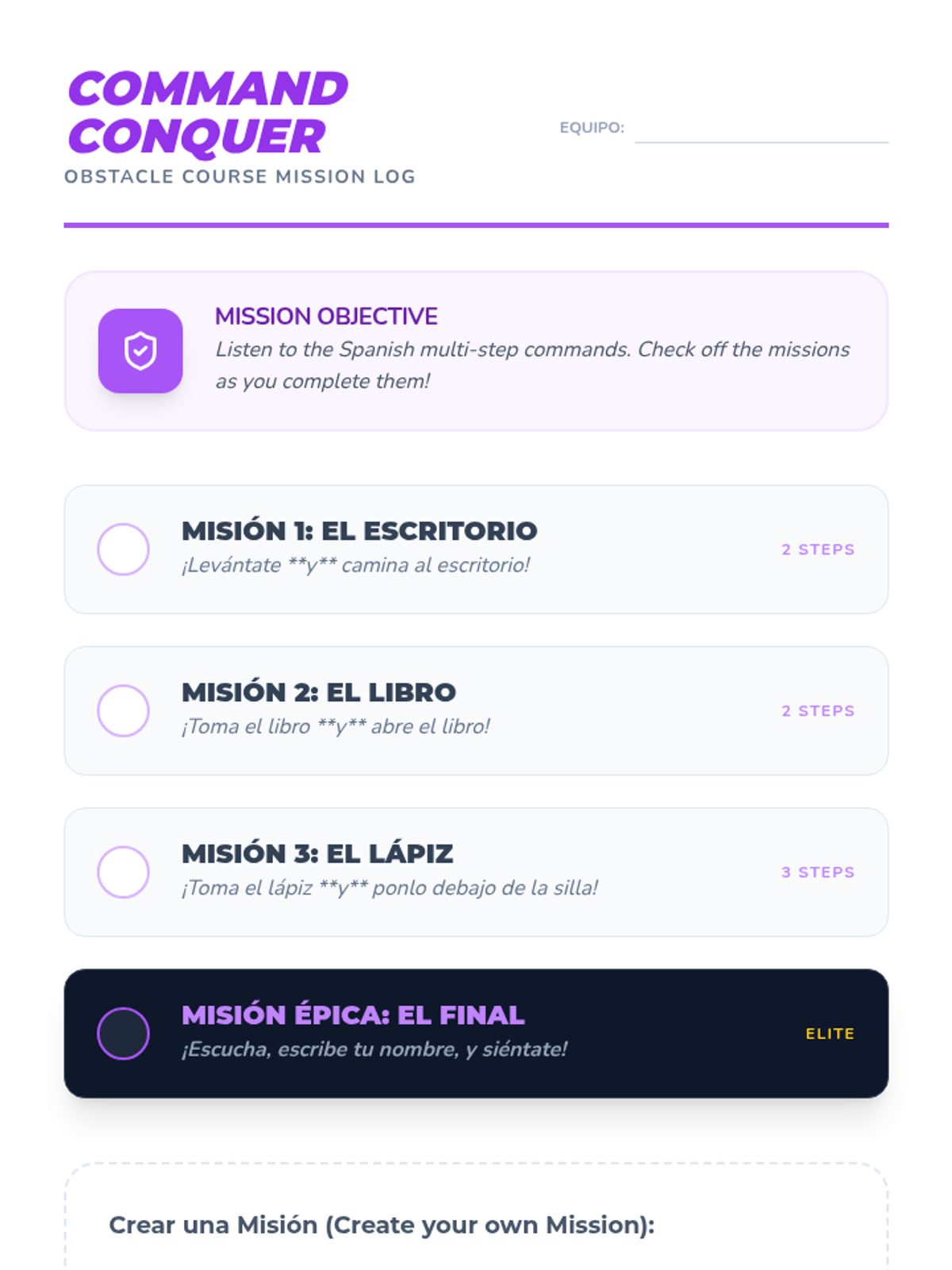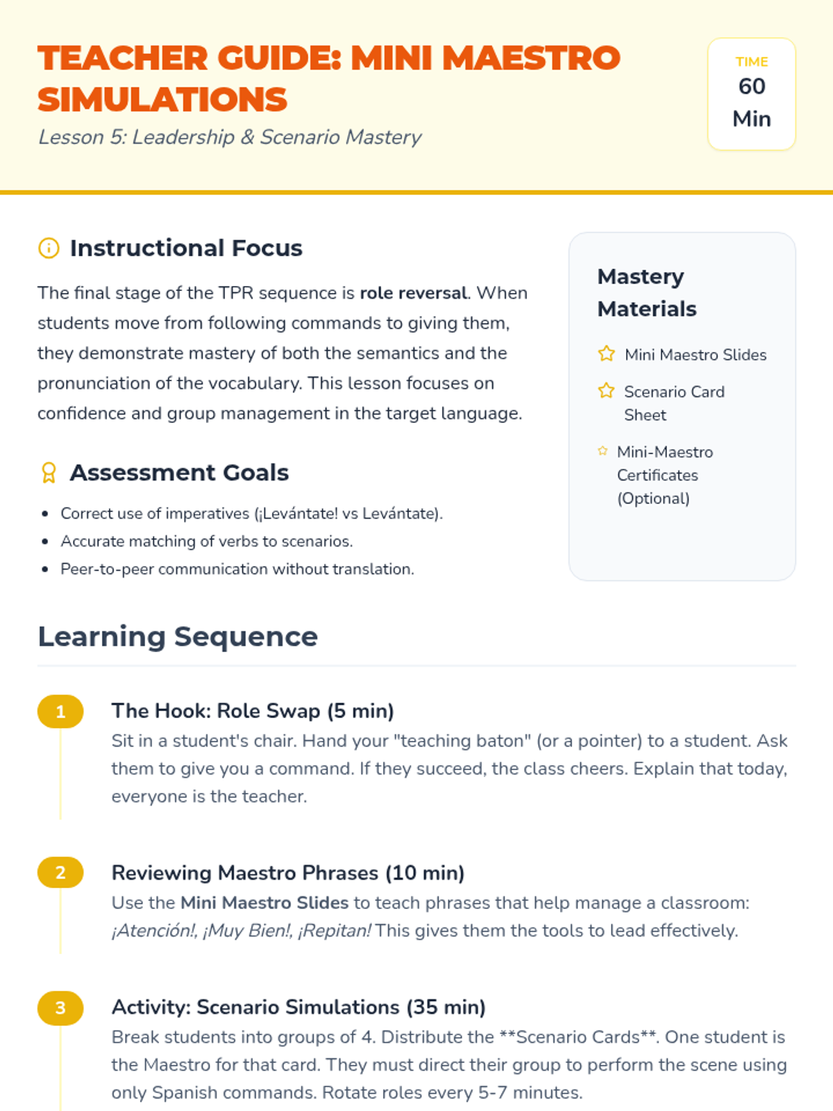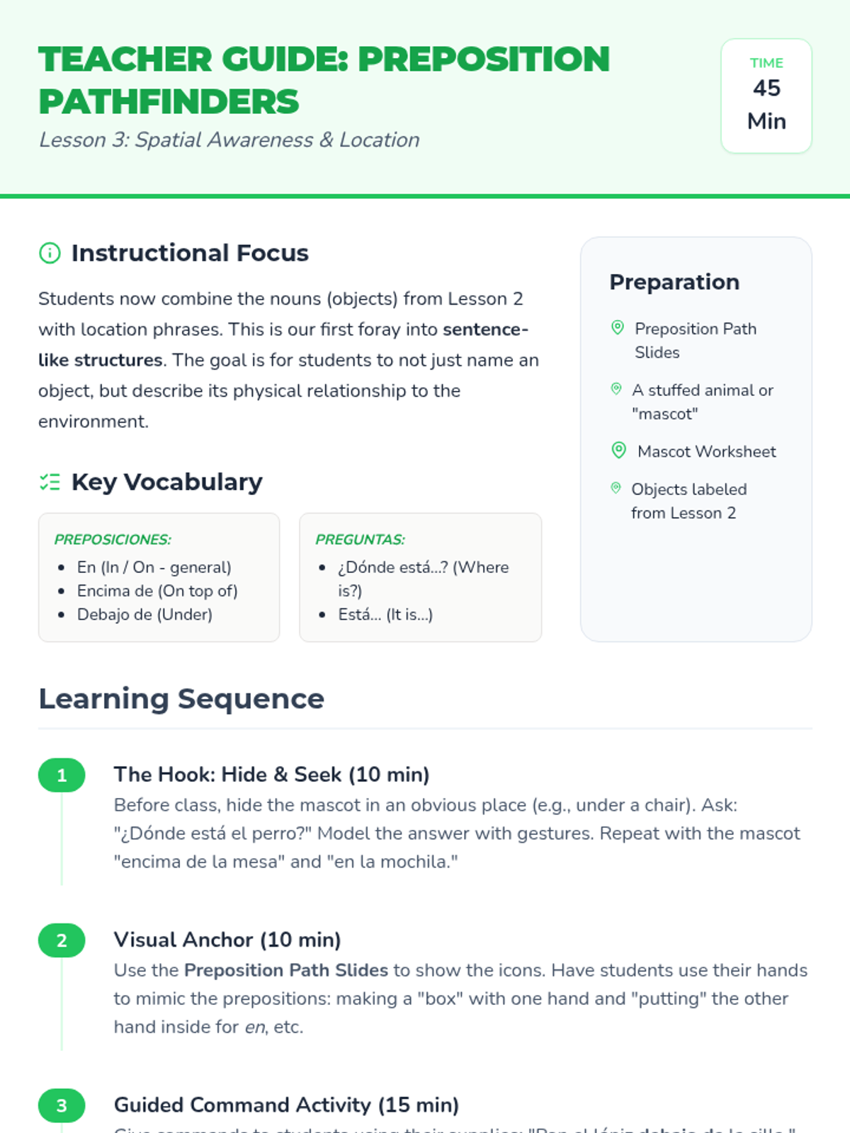 A 5th-grade Spanish immersion unit focusing on Total Physical Response (TPR) to master classroom commands, object identification, and spatial prepositions. Students move from listening to lead roles through interactive simulations and games.