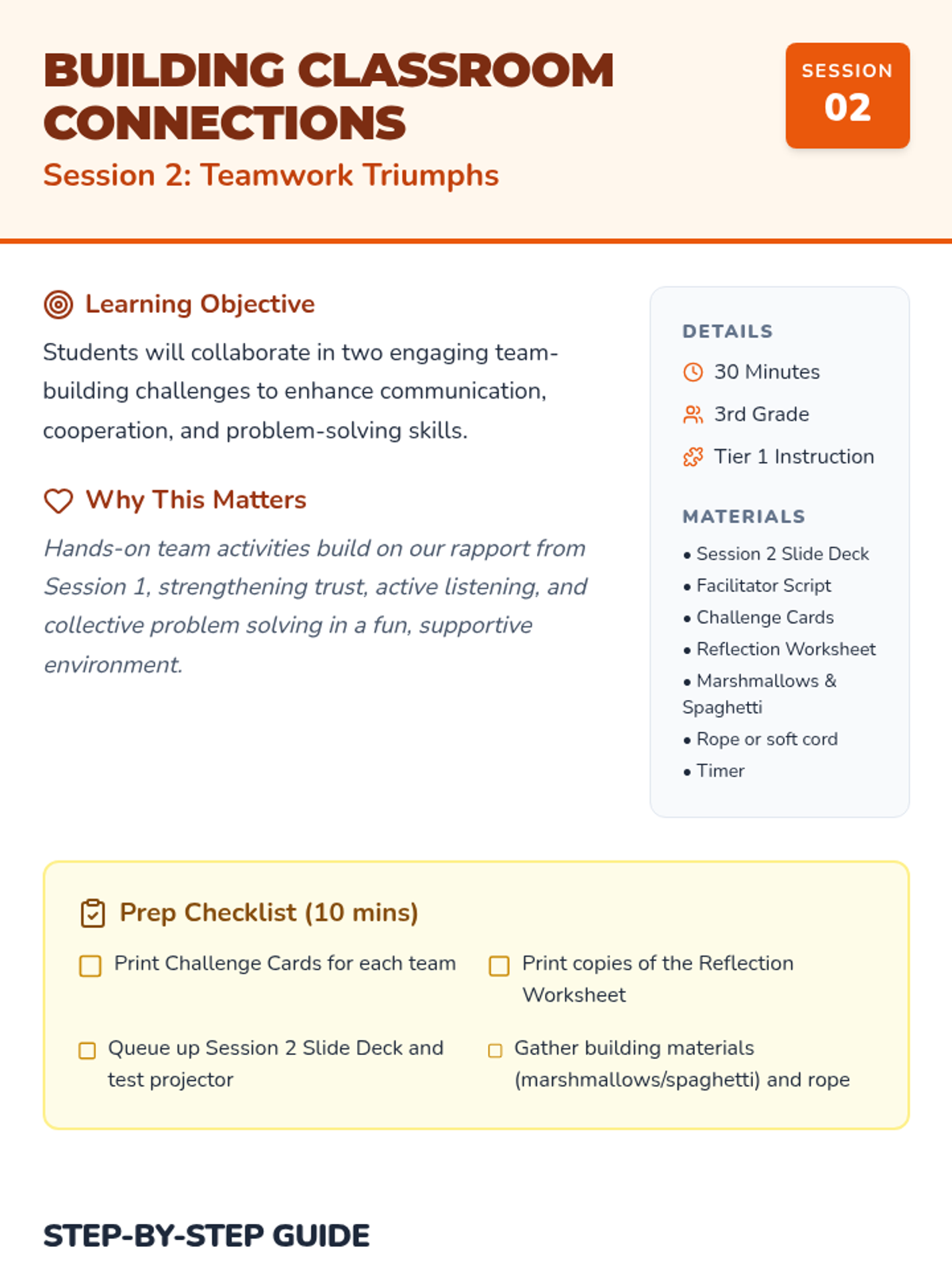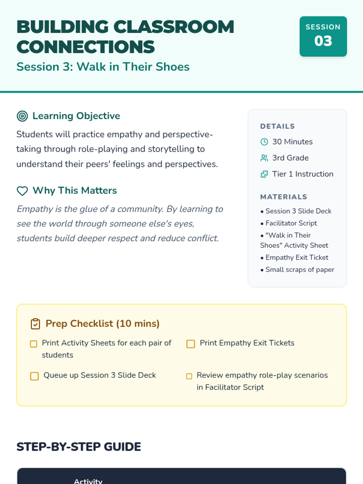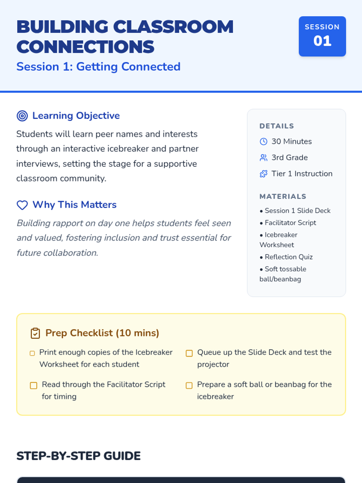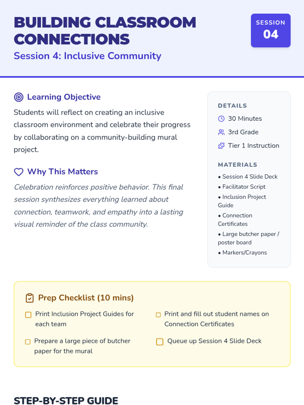 A 4-session series for third graders to build positive relationships through icebreakers, teamwork, and empathy, fostering a supportive classroom culture.