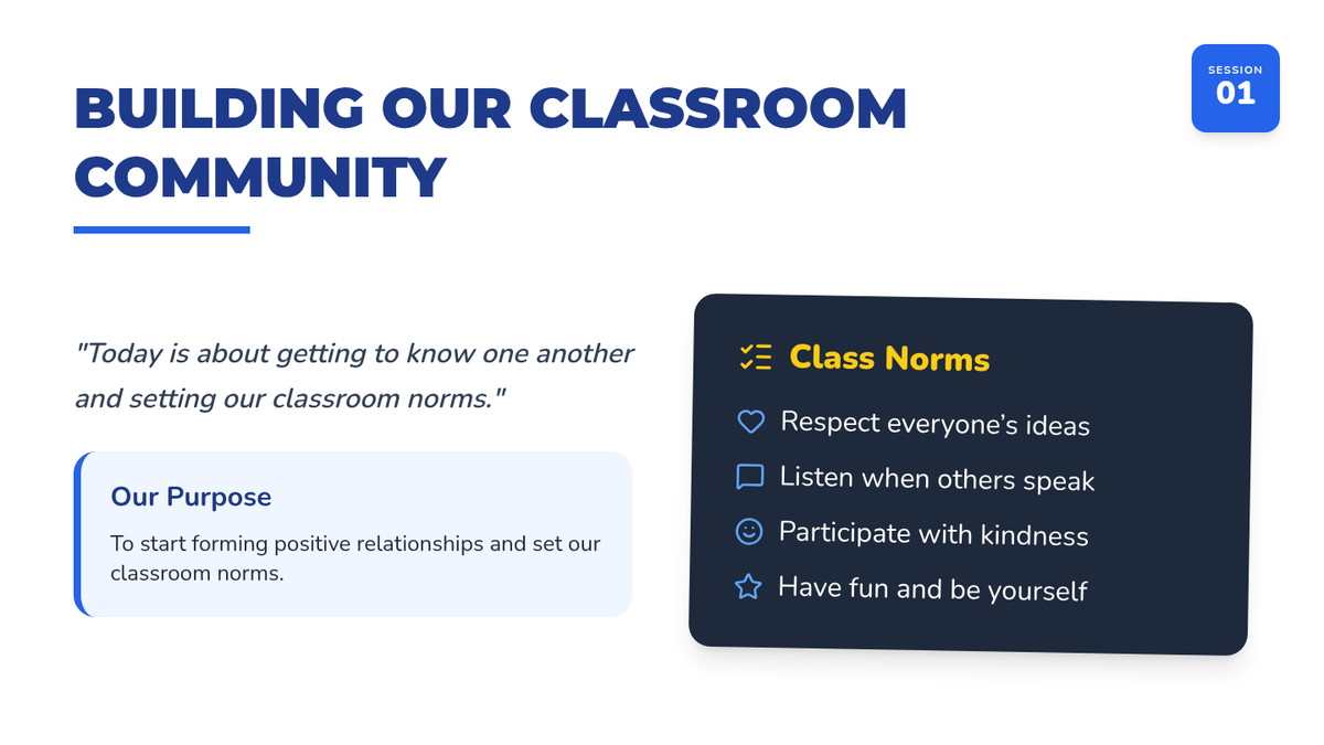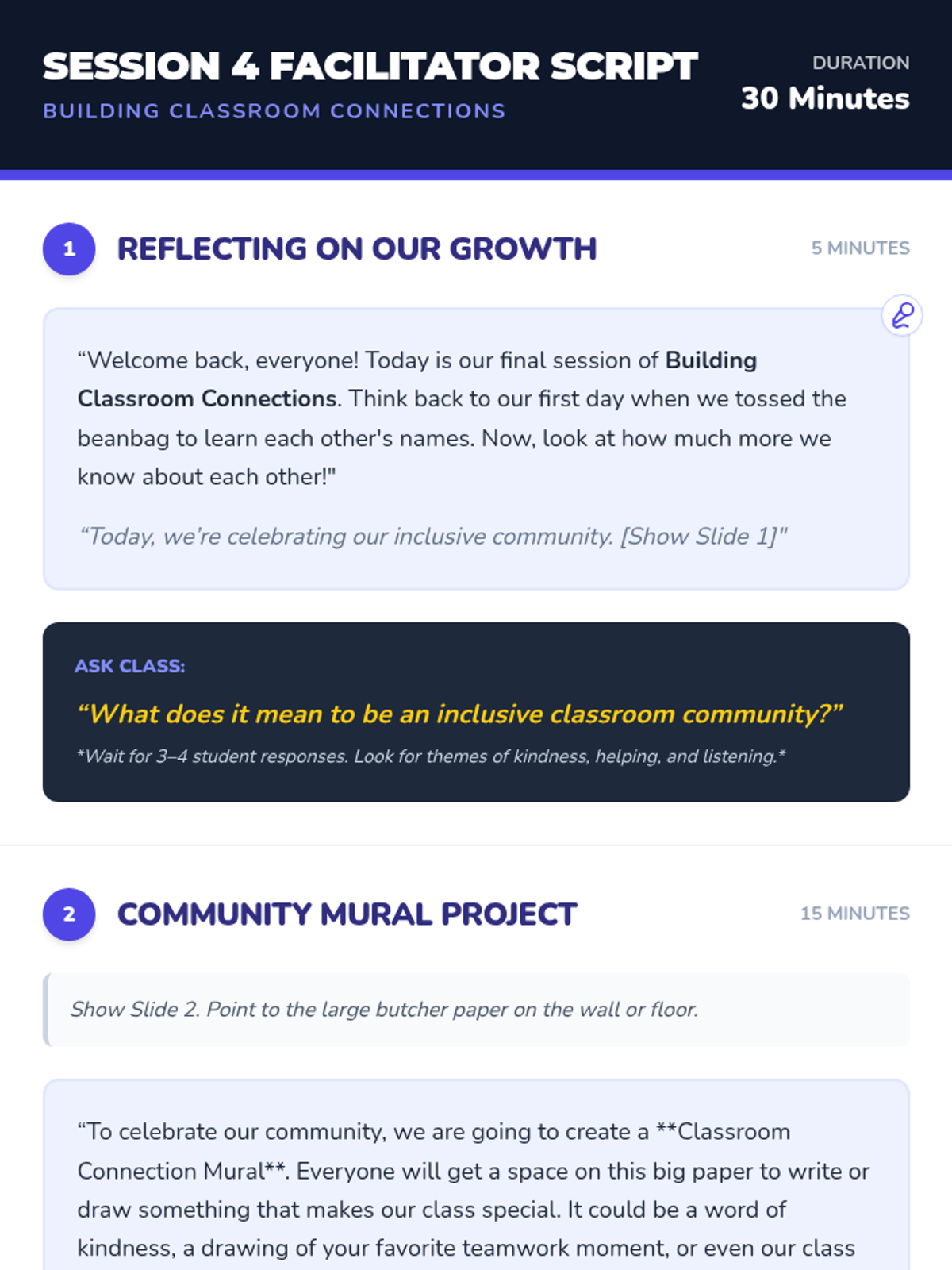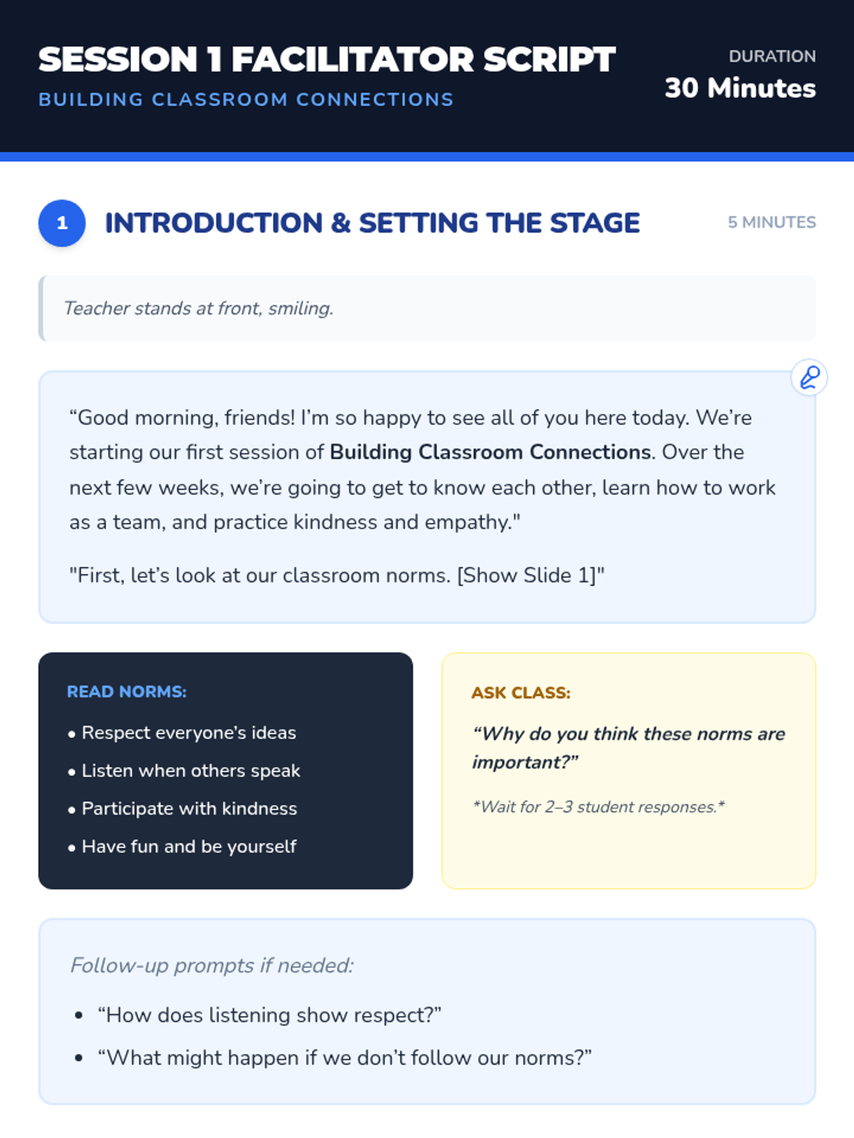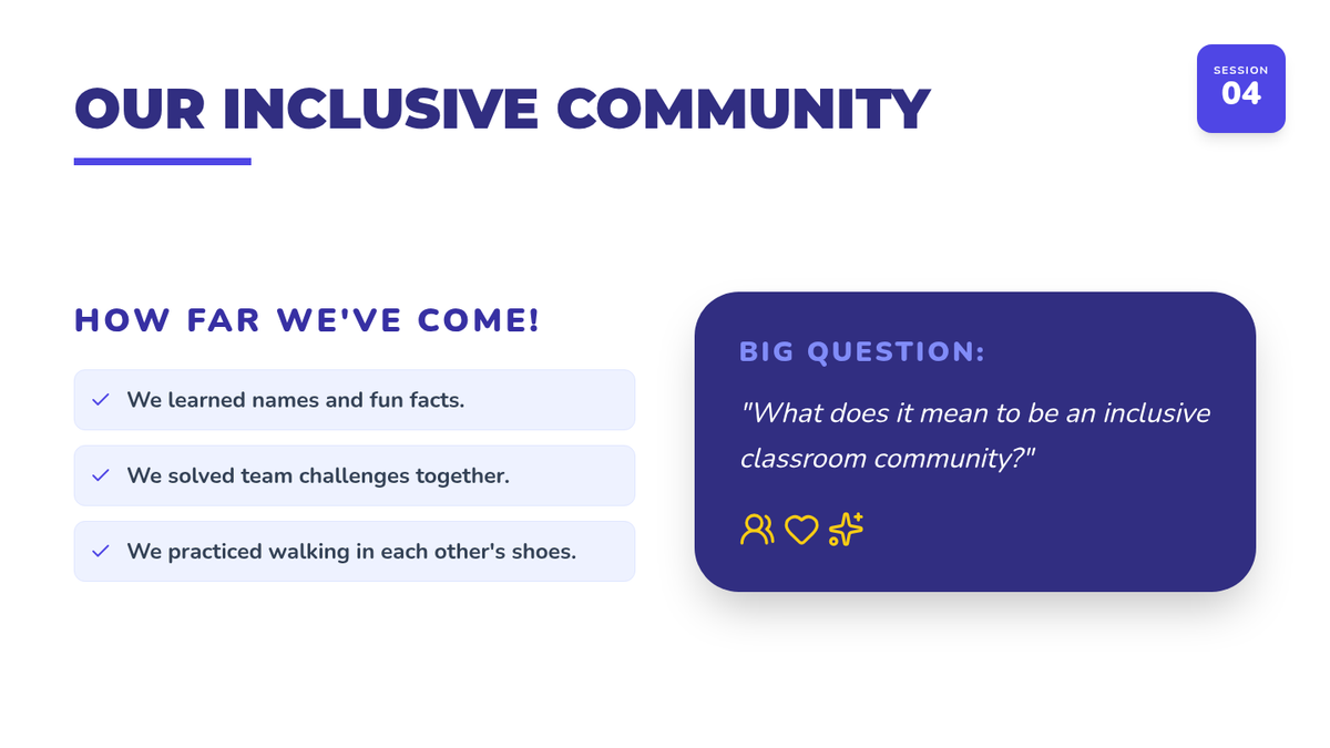 A 4-session series for third graders to build positive relationships through icebreakers, teamwork, and empathy, fostering a supportive classroom culture.