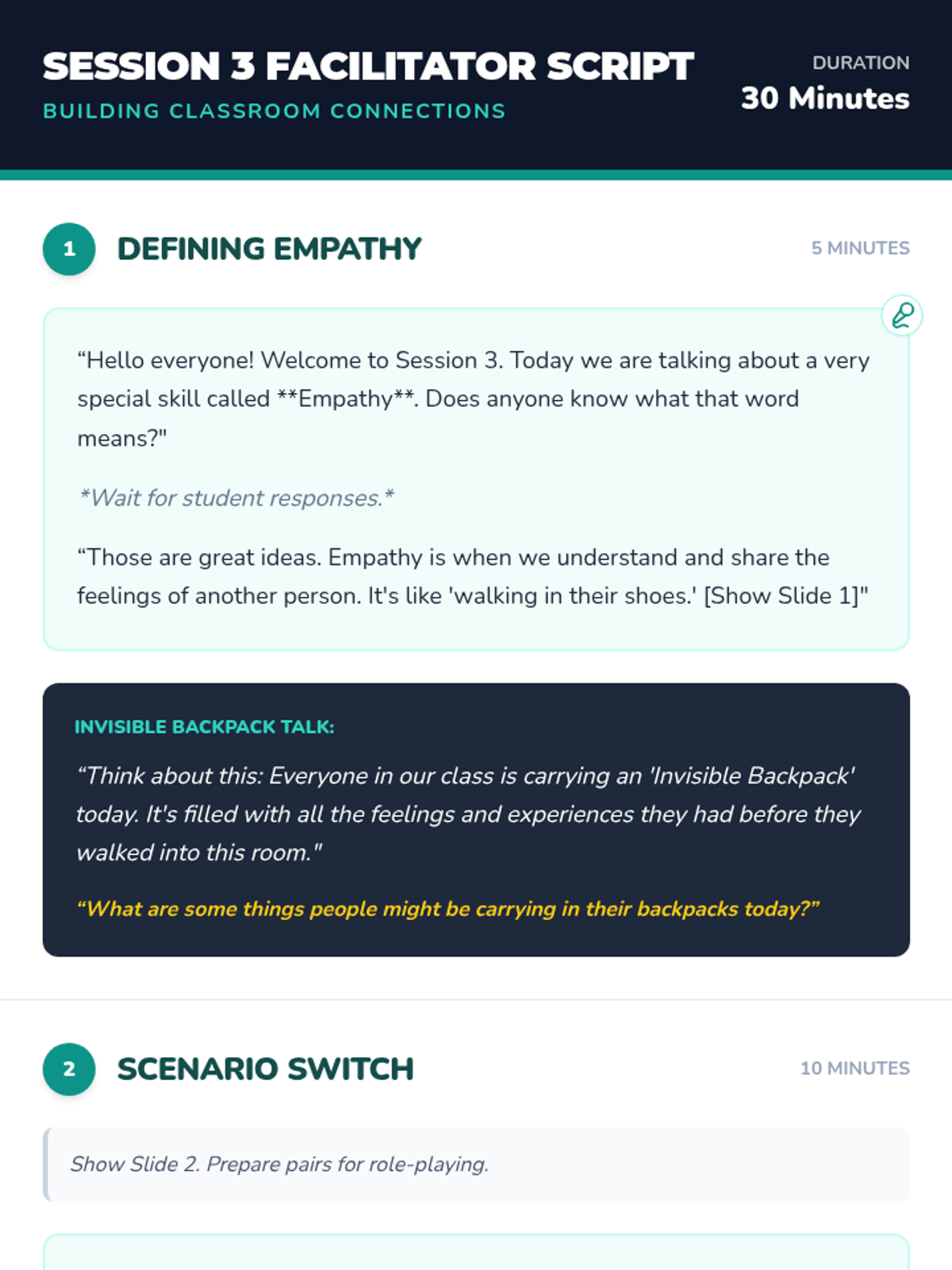 A comprehensive 4-day small group program focusing on essential social-emotional skills including emotional regulation, active listening, friendship building, and conflict resolution.