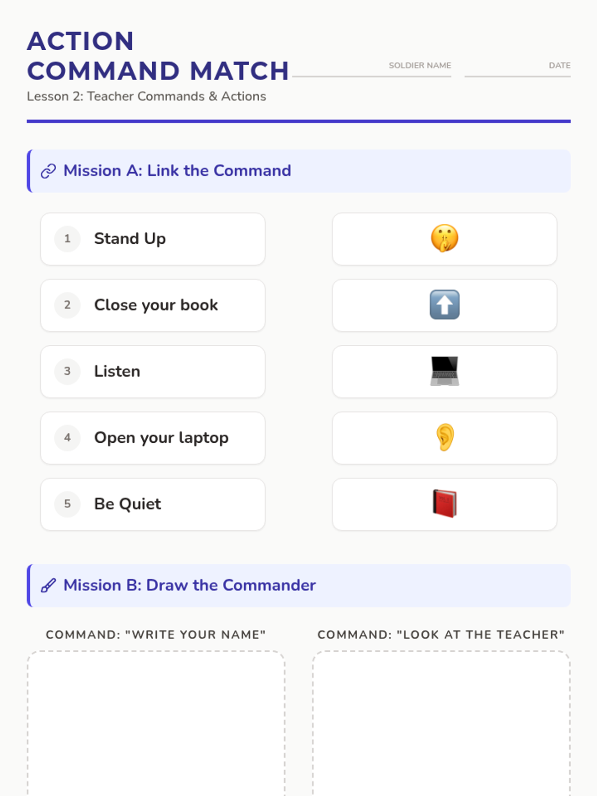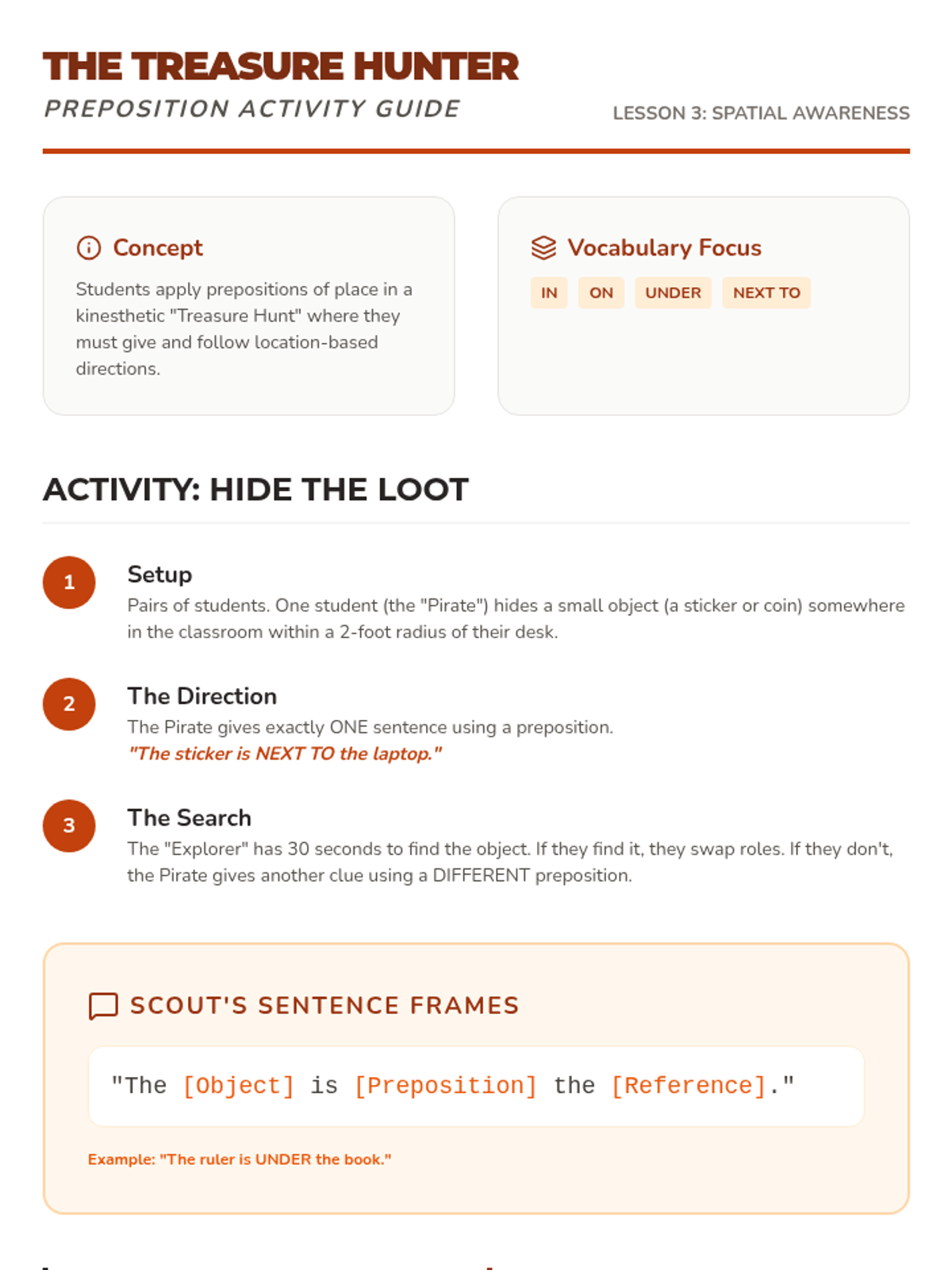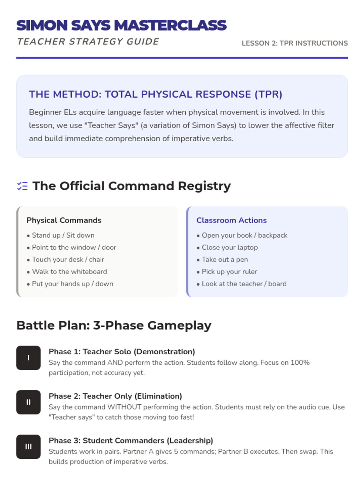A comprehensive 5-lesson sequence for 8th-grade ESL beginners focusing on essential classroom vocabulary, teacher instructions, and spatial awareness through a 'survival guide' gamified approach.