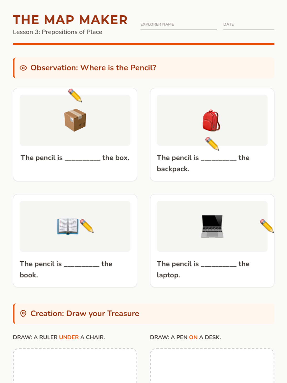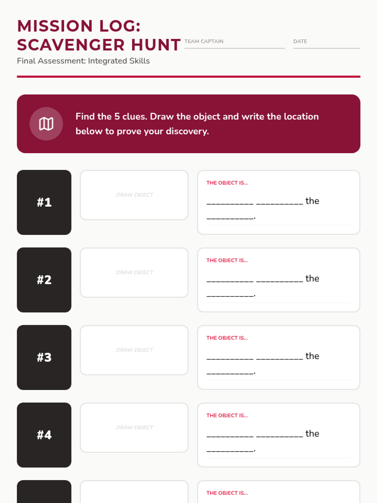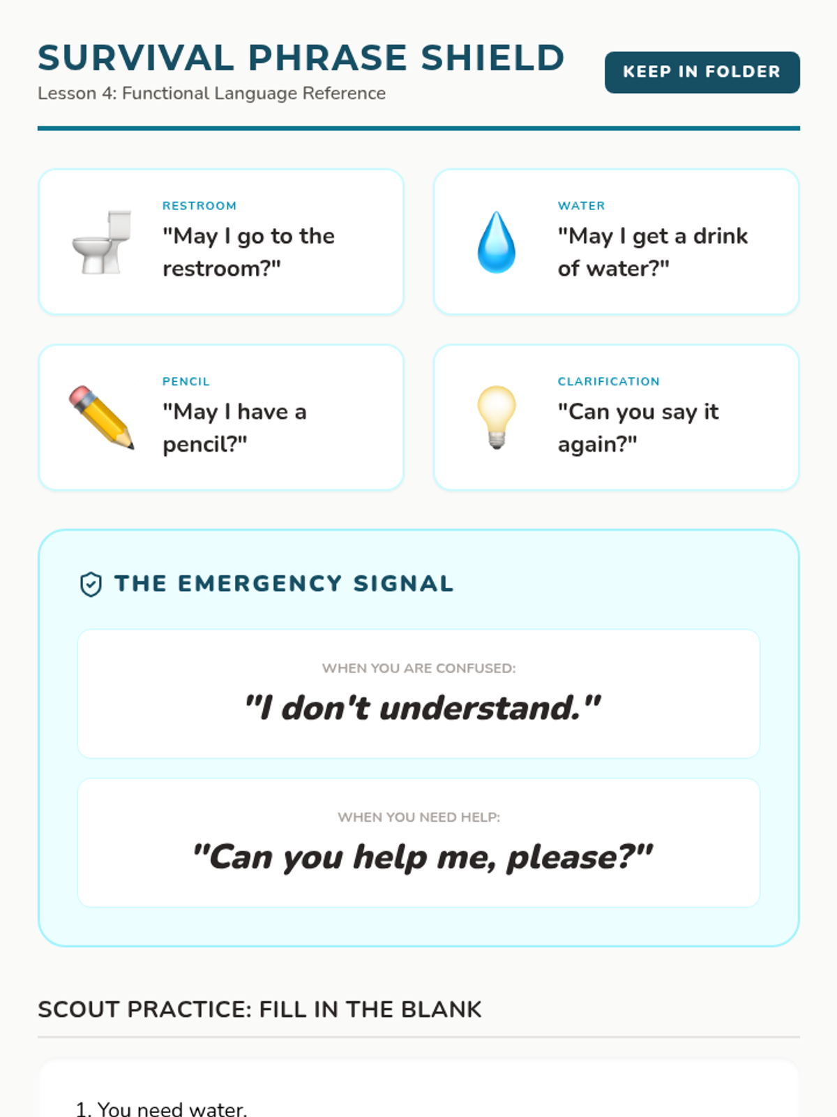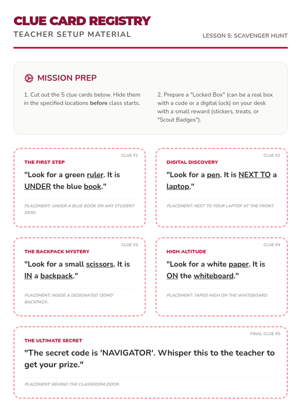 A comprehensive 5-lesson sequence for 8th-grade ESL beginners focusing on essential classroom vocabulary, teacher instructions, and spatial awareness through a 'survival guide' gamified approach.