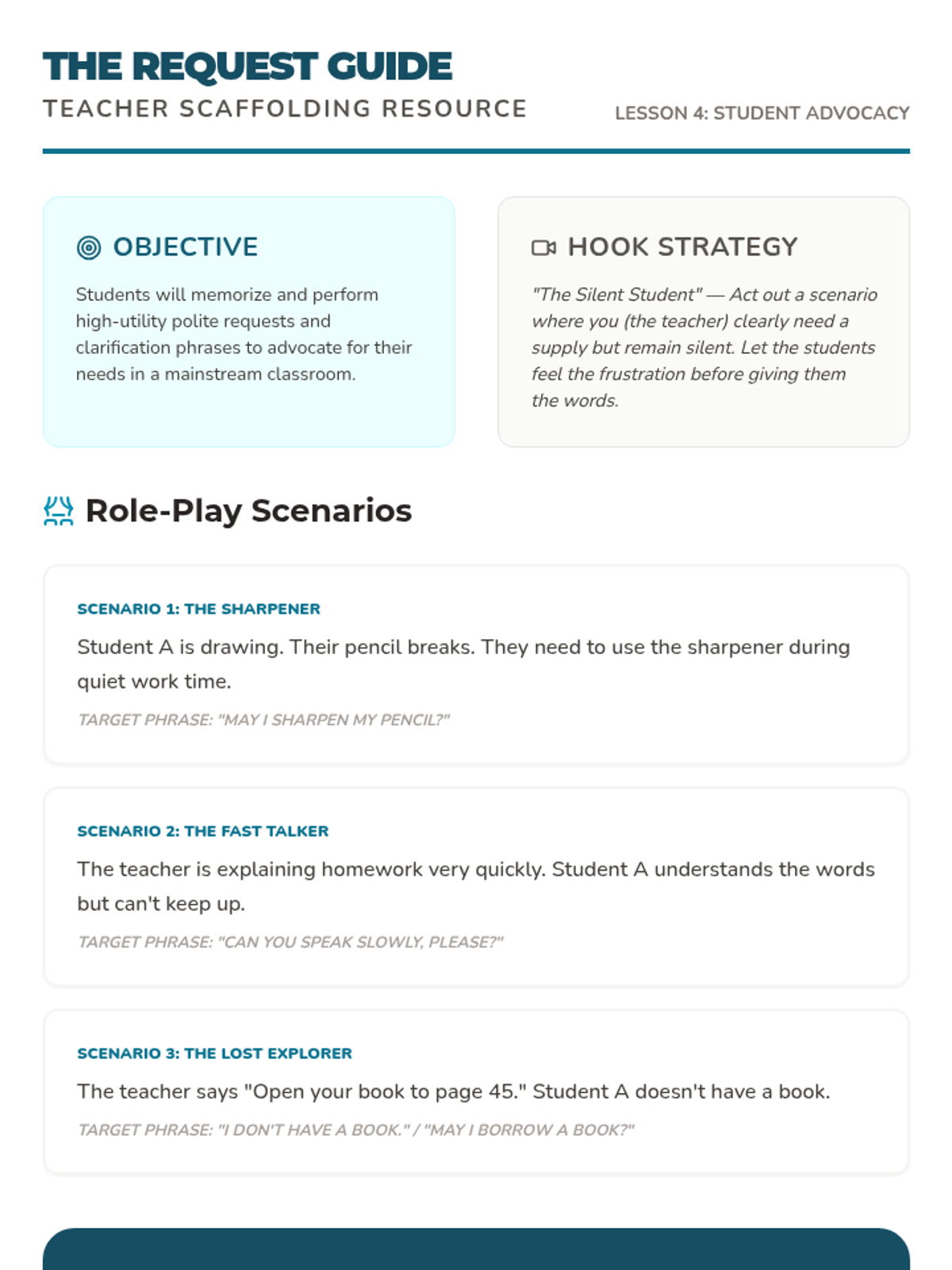 This sequence helps beginner ESL students develop essential listening skills for a middle school environment. It covers greetings, classroom supplies, teacher commands, schedules, and real-world school scenarios through interactive audio-based activities.