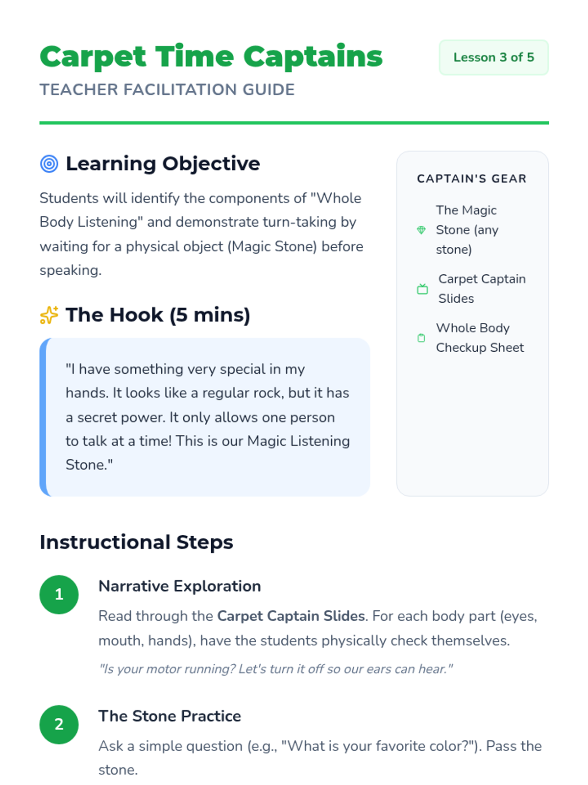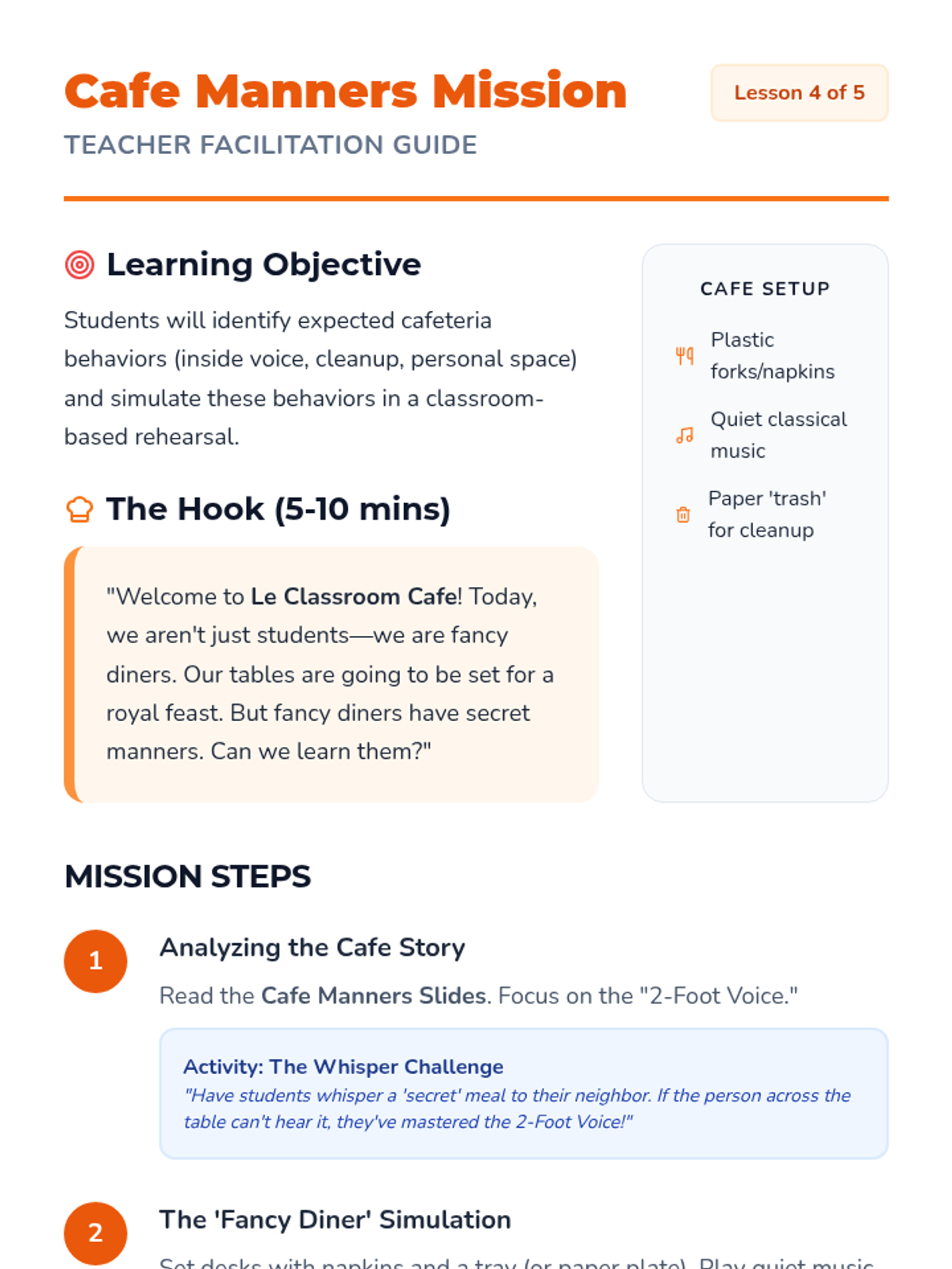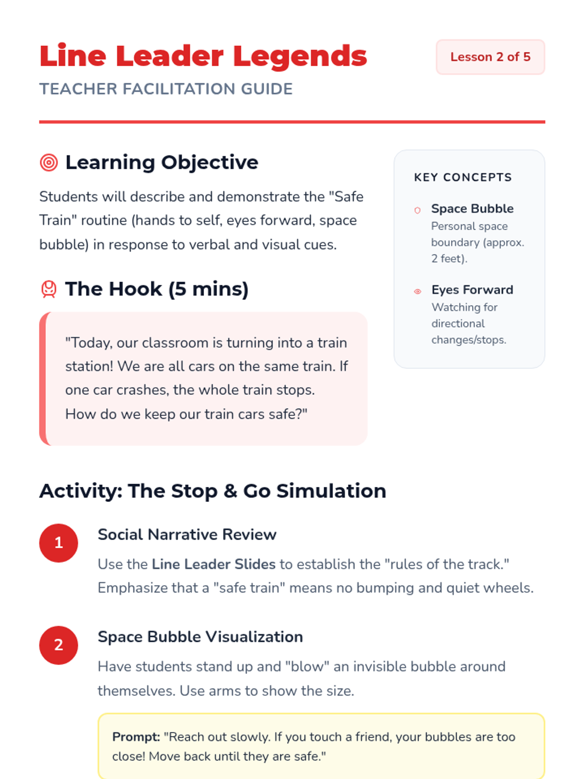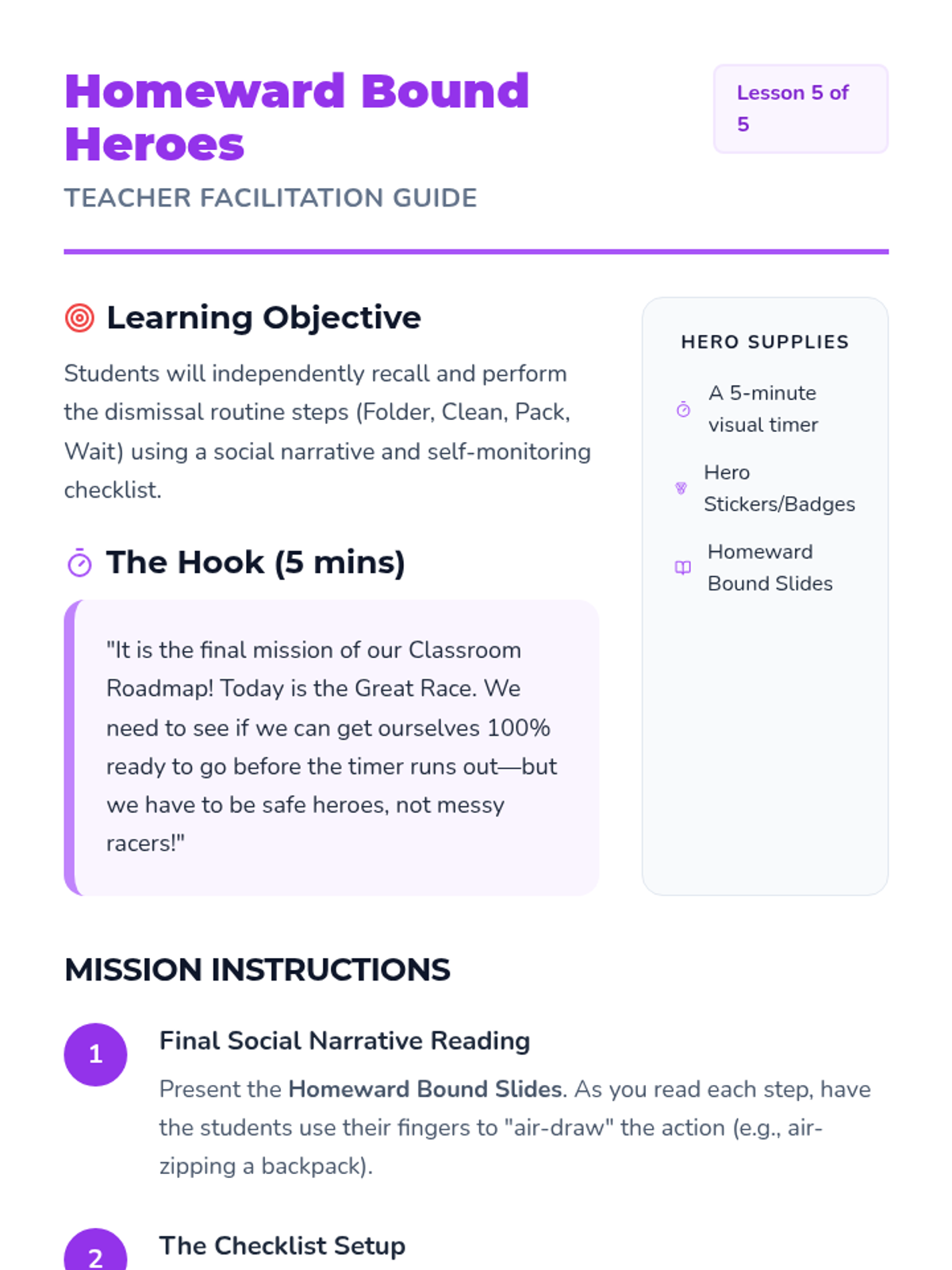 A workshop-based sequence helping 1st Grade students analyze and practice essential classroom routines through social narratives, moving from deconstructing morning arrival to mastering dismissal procedures.