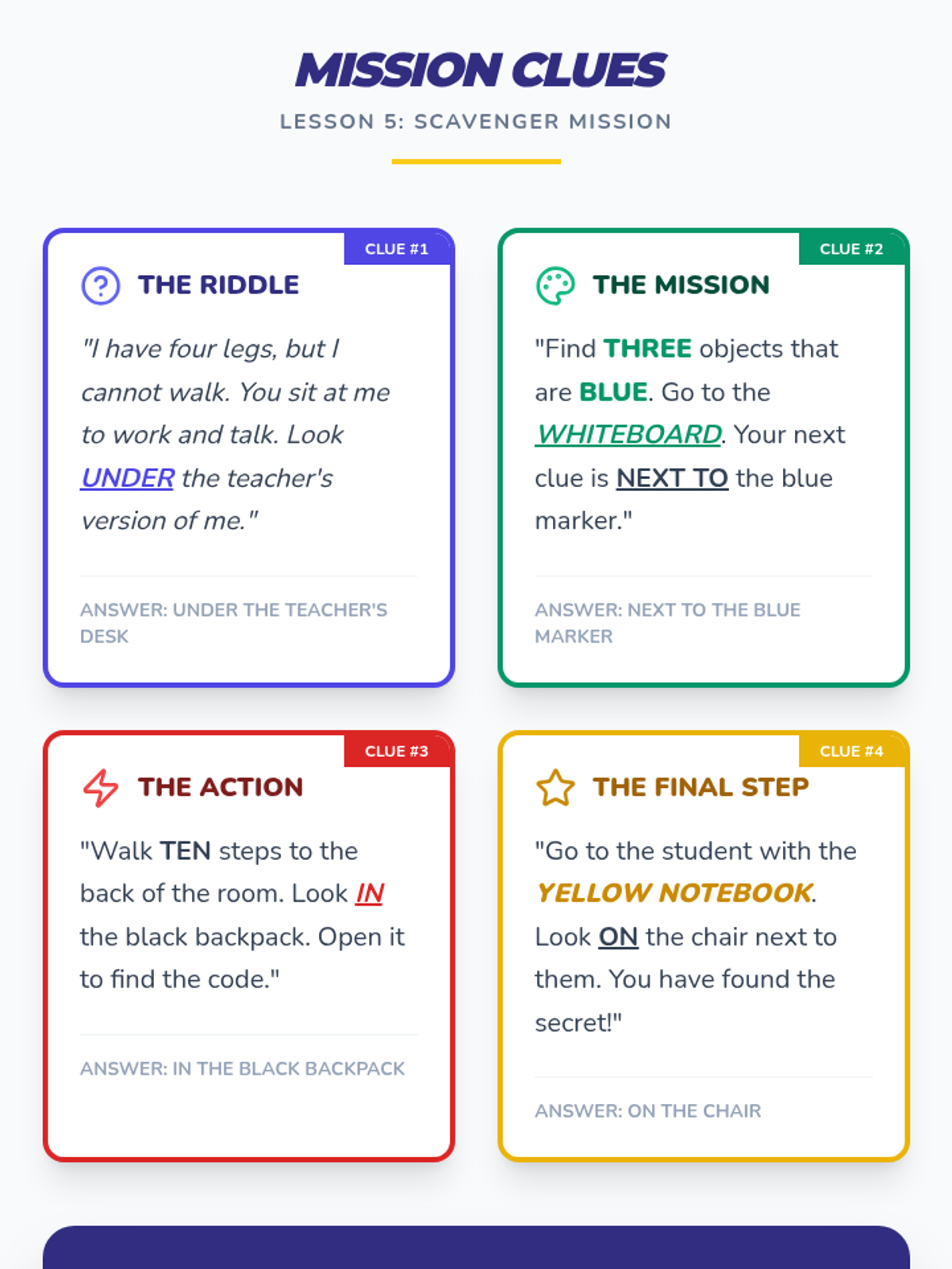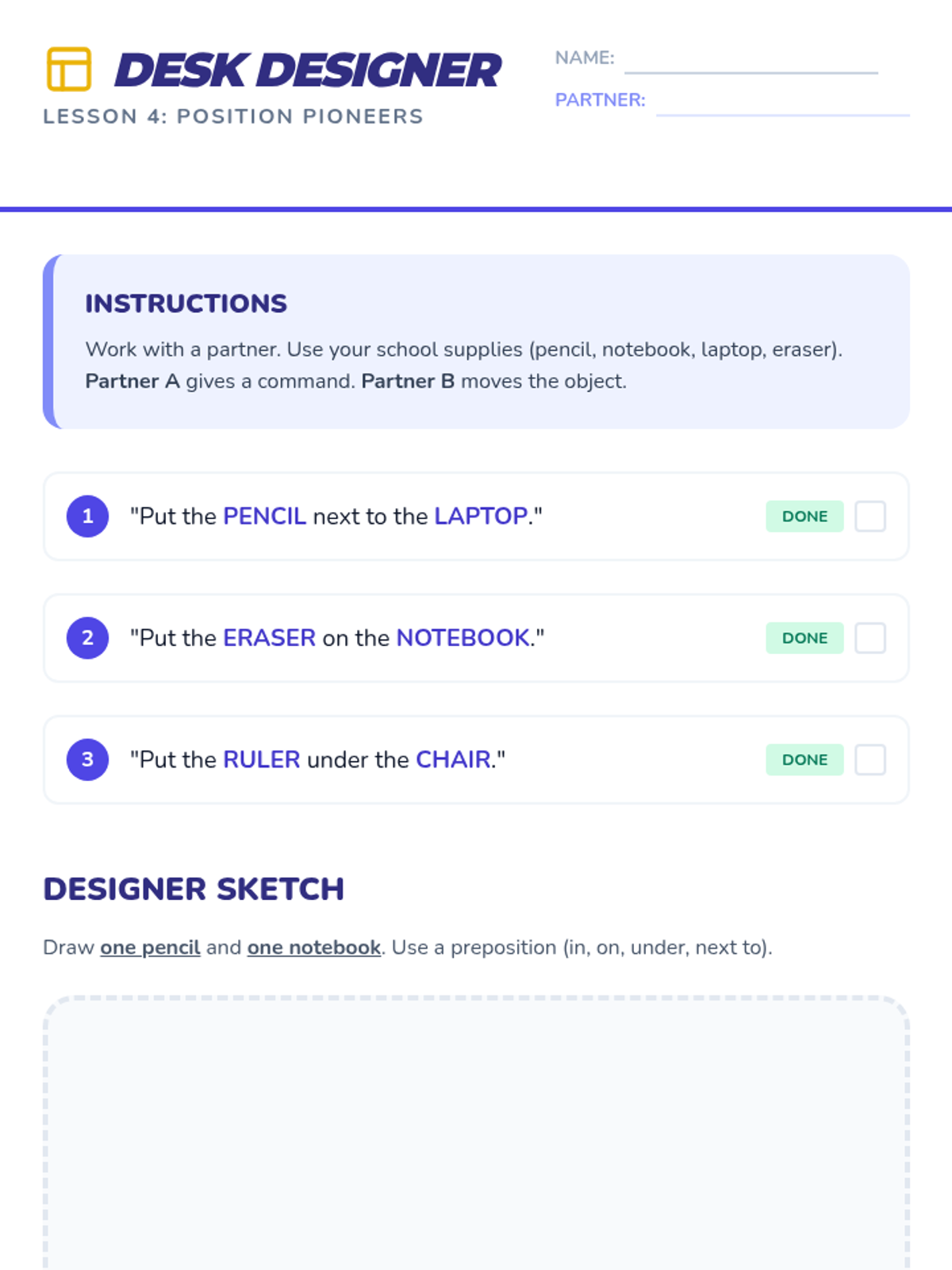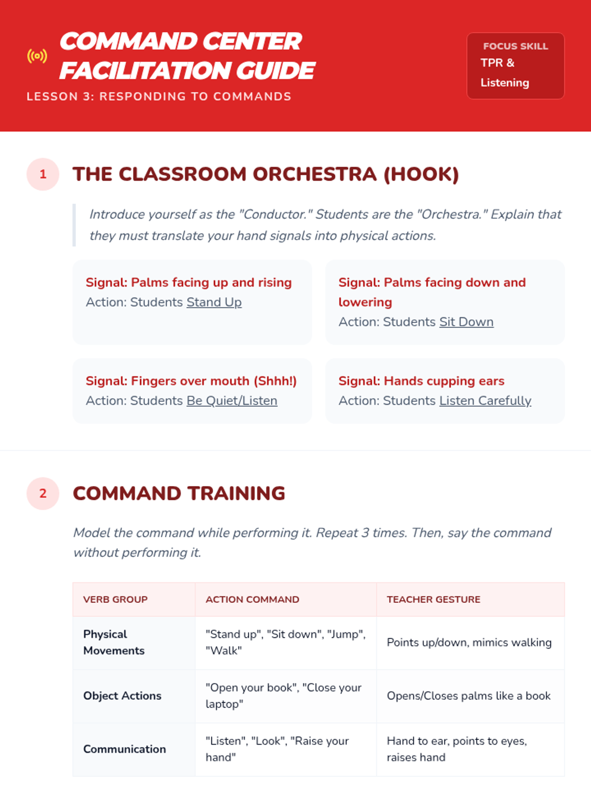 A 5-lesson unit for beginner English Language Learners (ELLs) focusing on classroom objects, instructional commands, colors, numbers, and prepositions. The sequence uses Total Physical Response (TPR) and gamified activities to build foundational vocabulary.