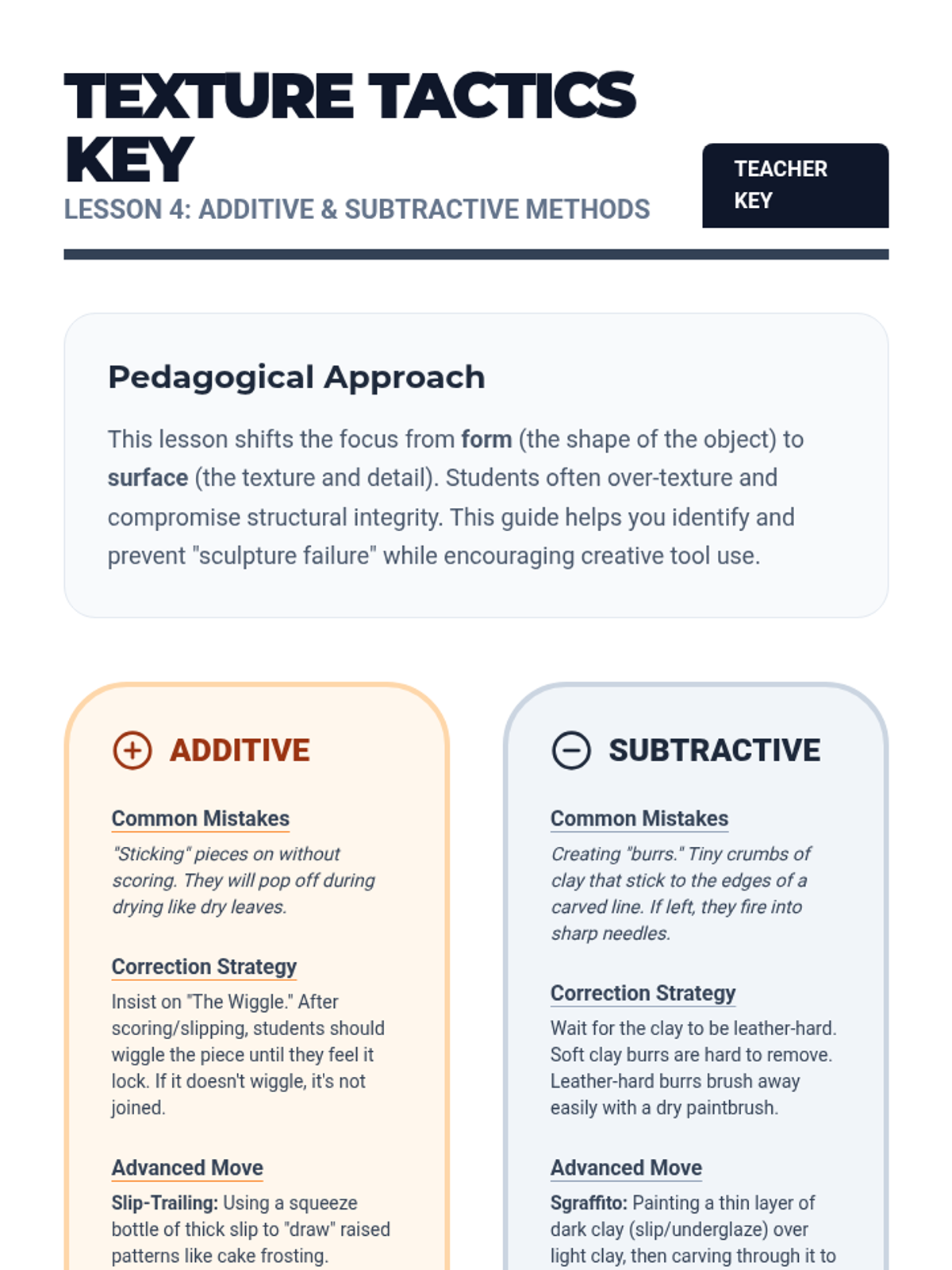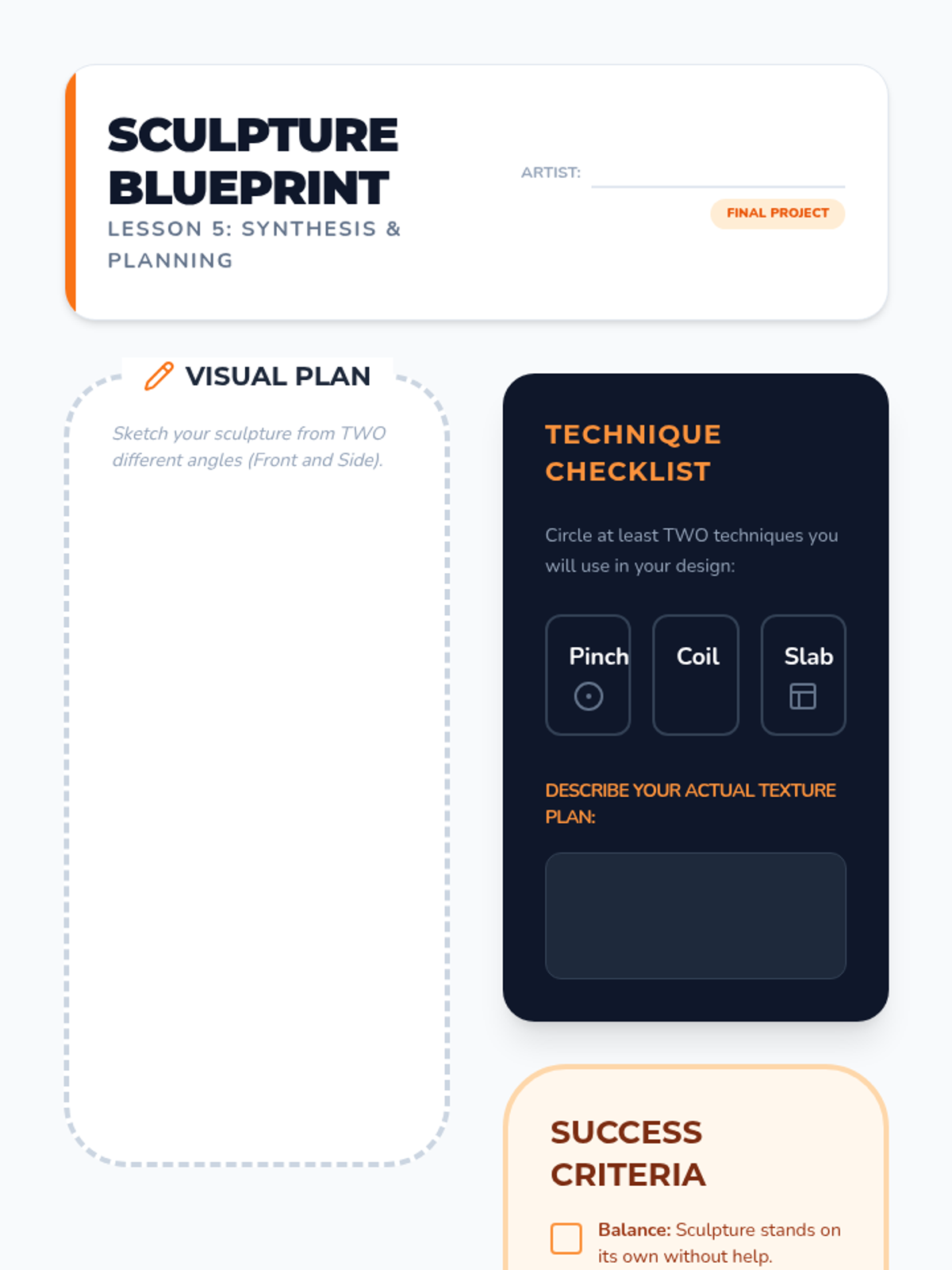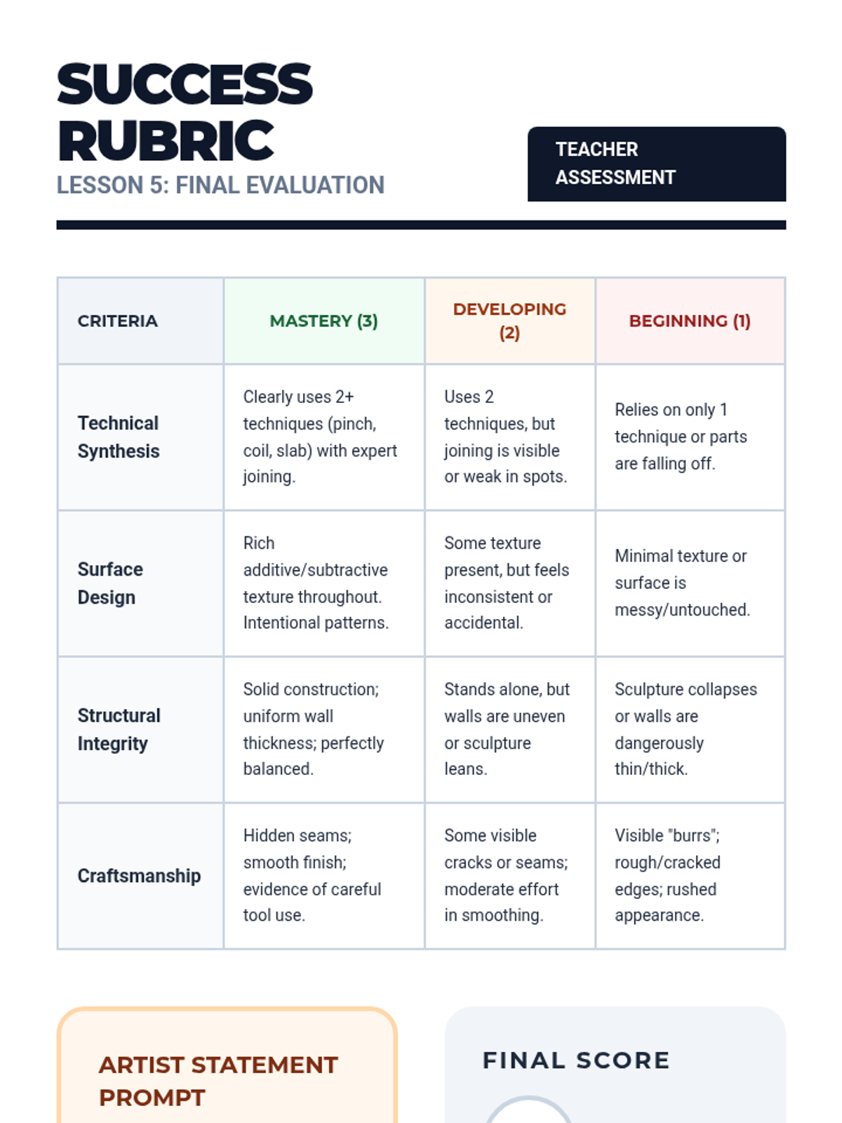 This sequence introduces 4th-grade students to foundational clay hand-building techniques: pinch, coil, and slab. Students explore clay properties, structural integrity, and surface decoration to create three-dimensional art.
