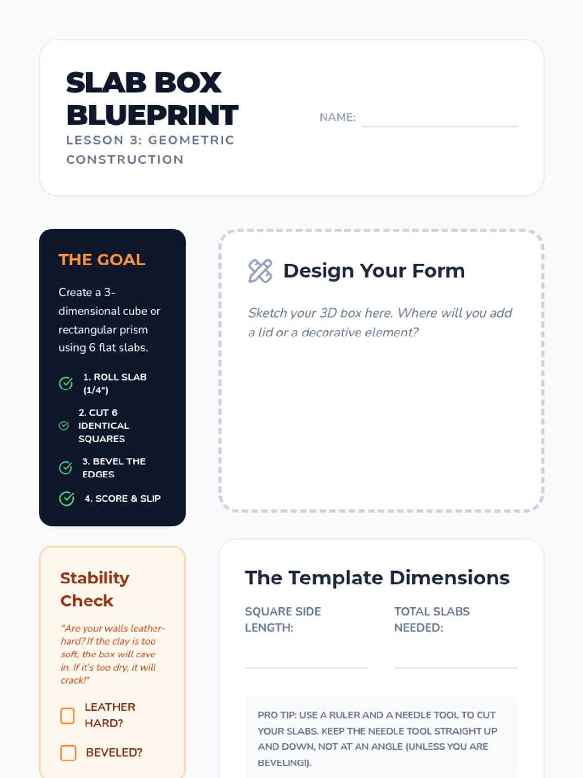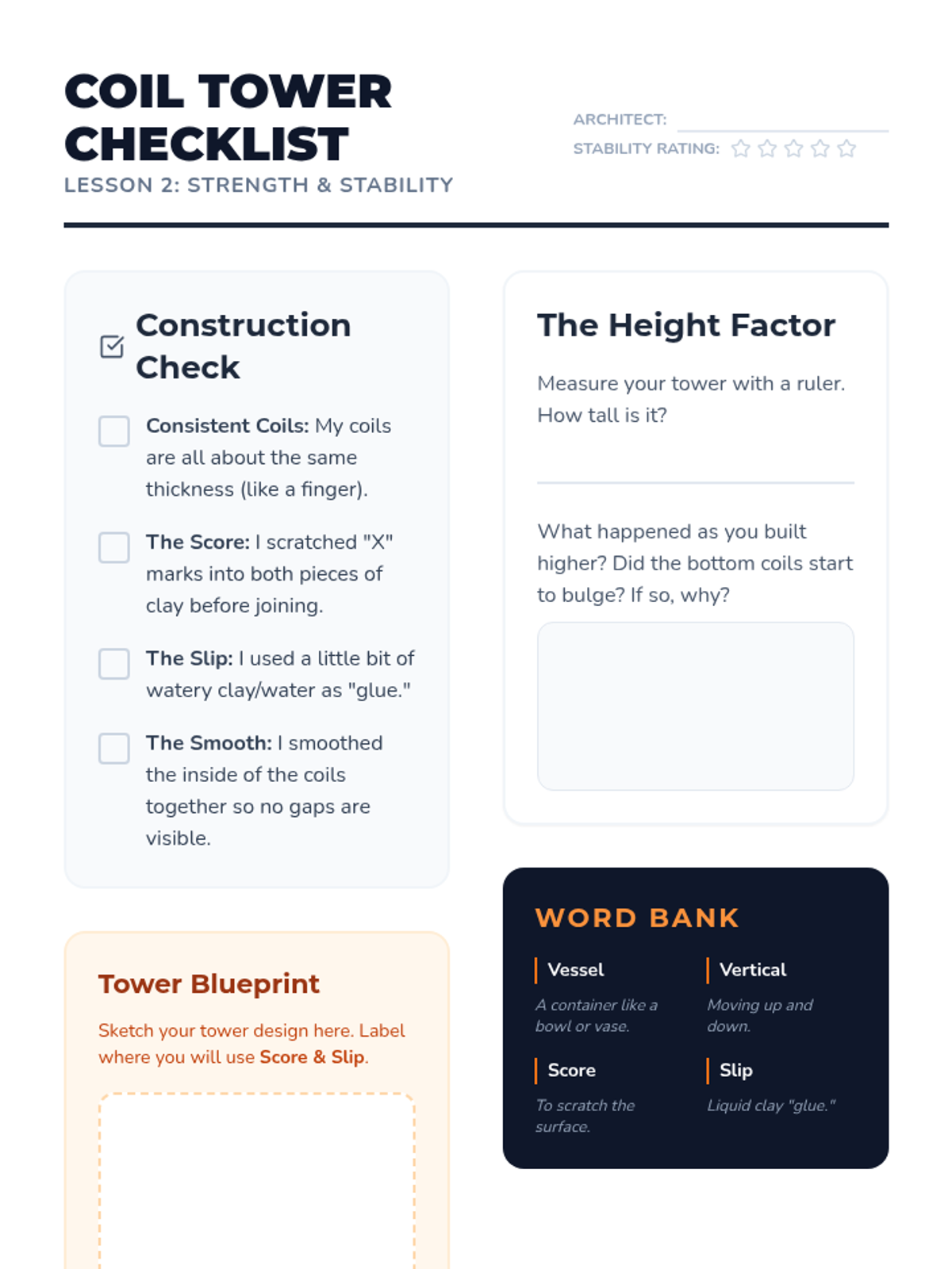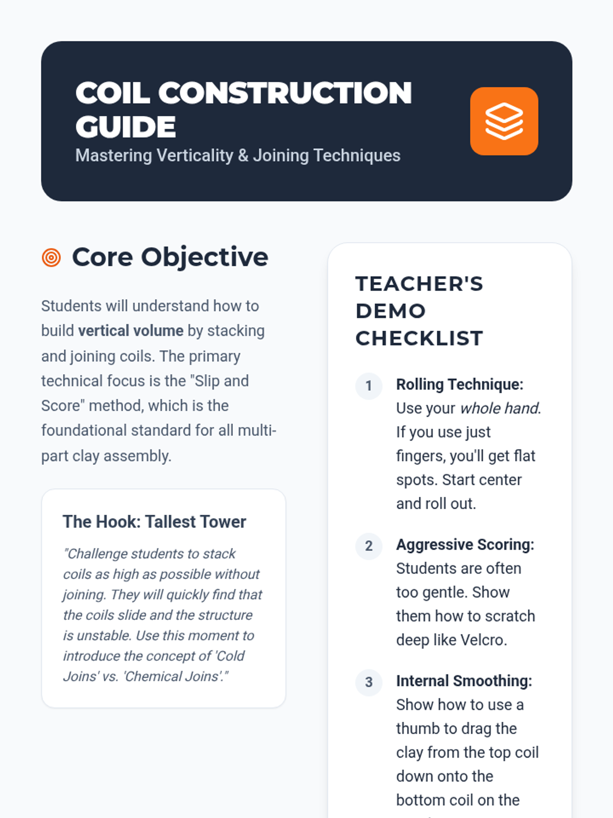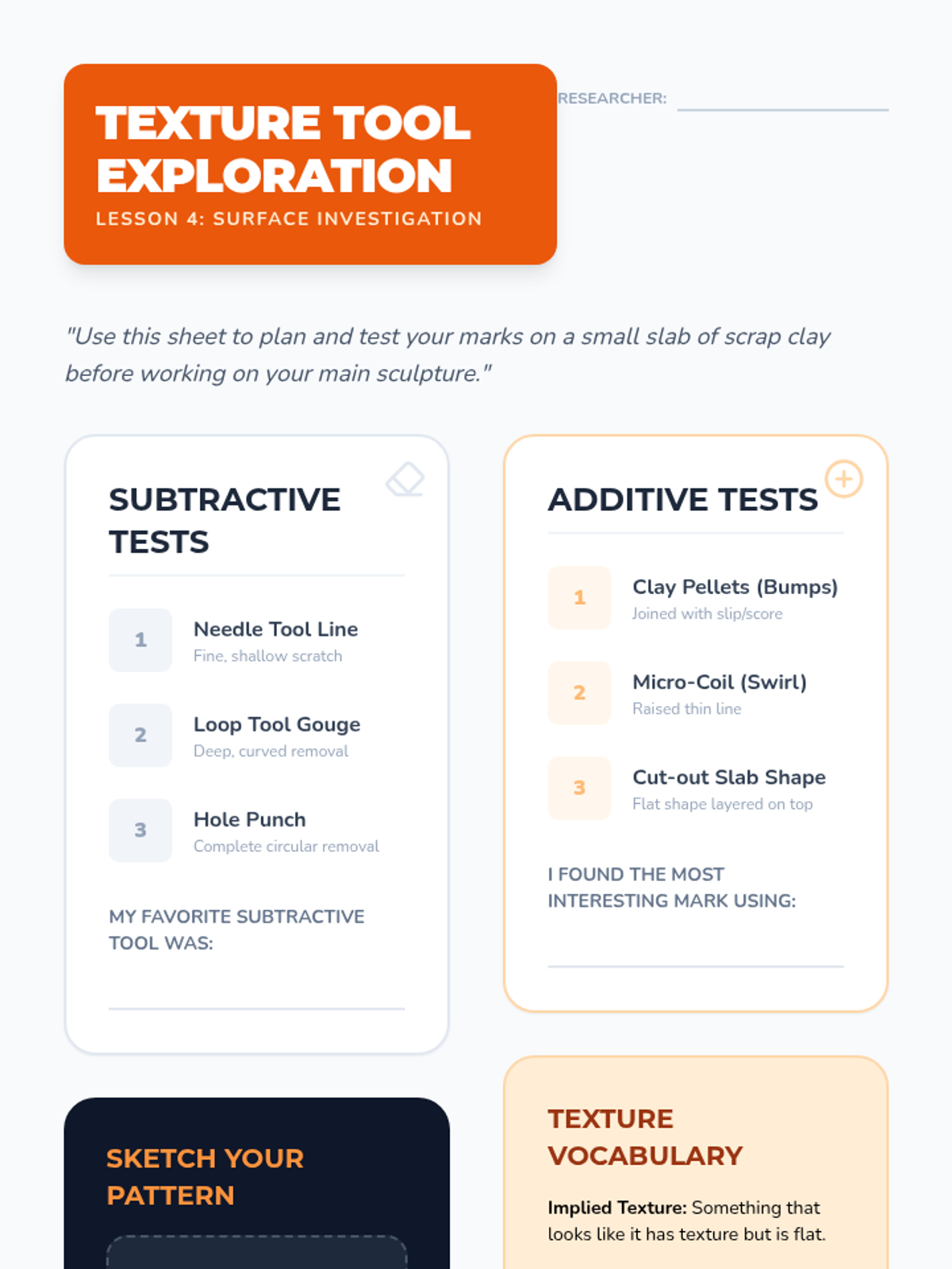 This sequence introduces 4th-grade students to foundational clay hand-building techniques: pinch, coil, and slab. Students explore clay properties, structural integrity, and surface decoration to create three-dimensional art.