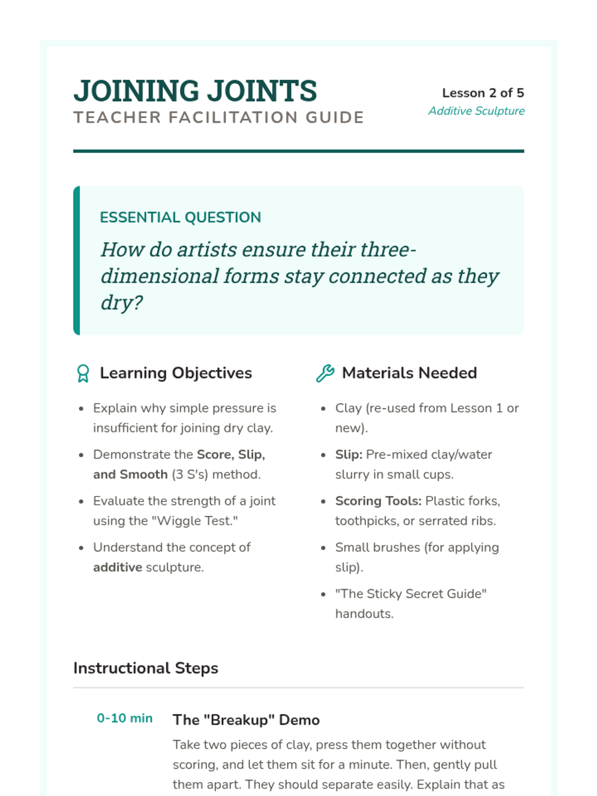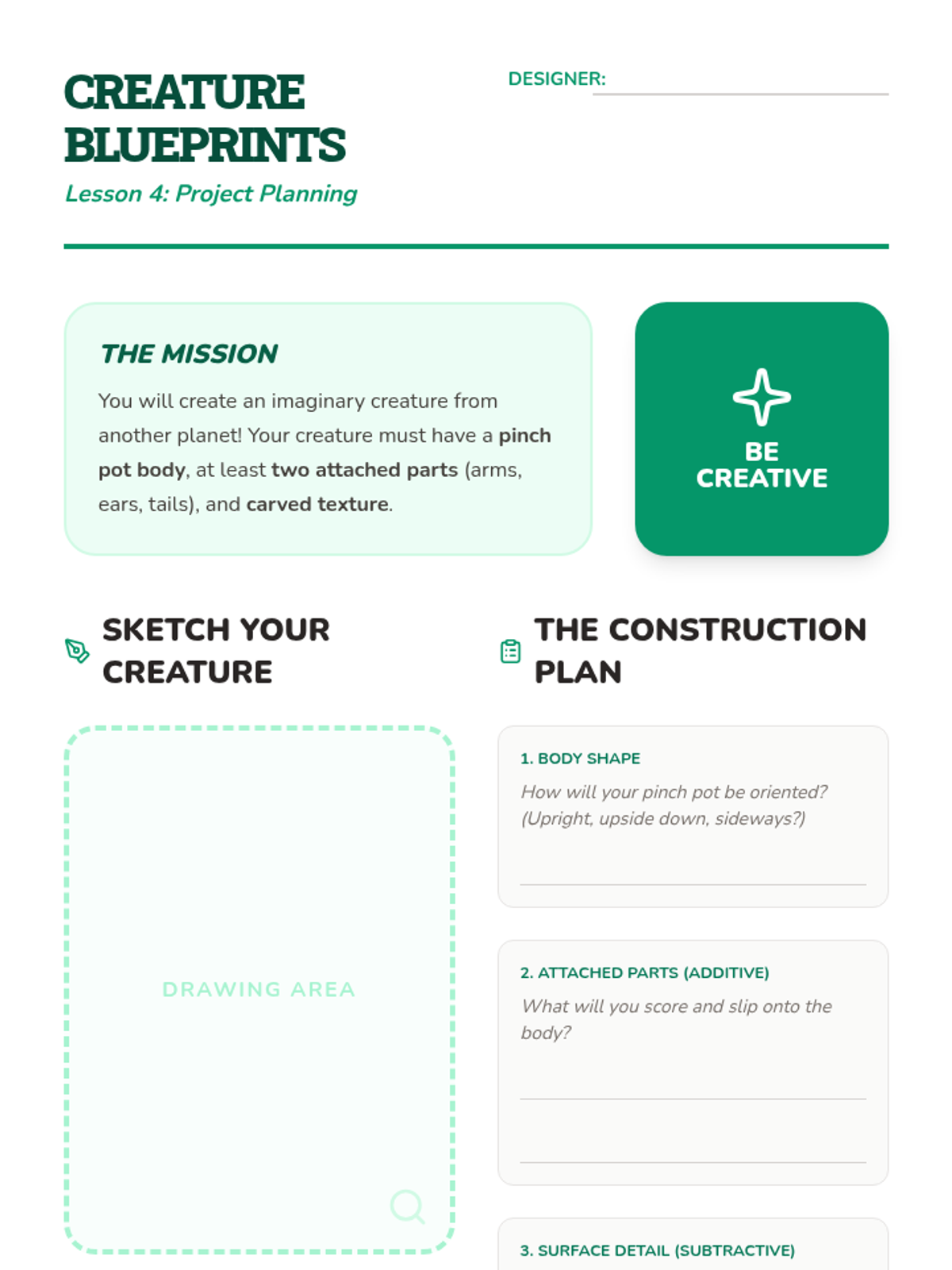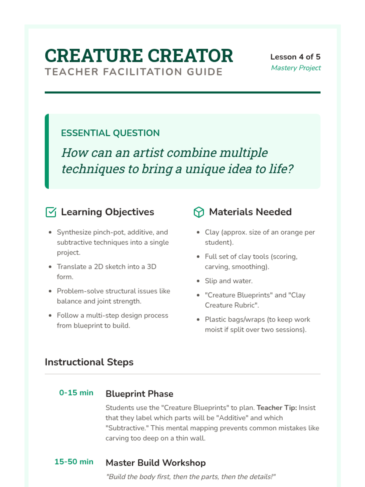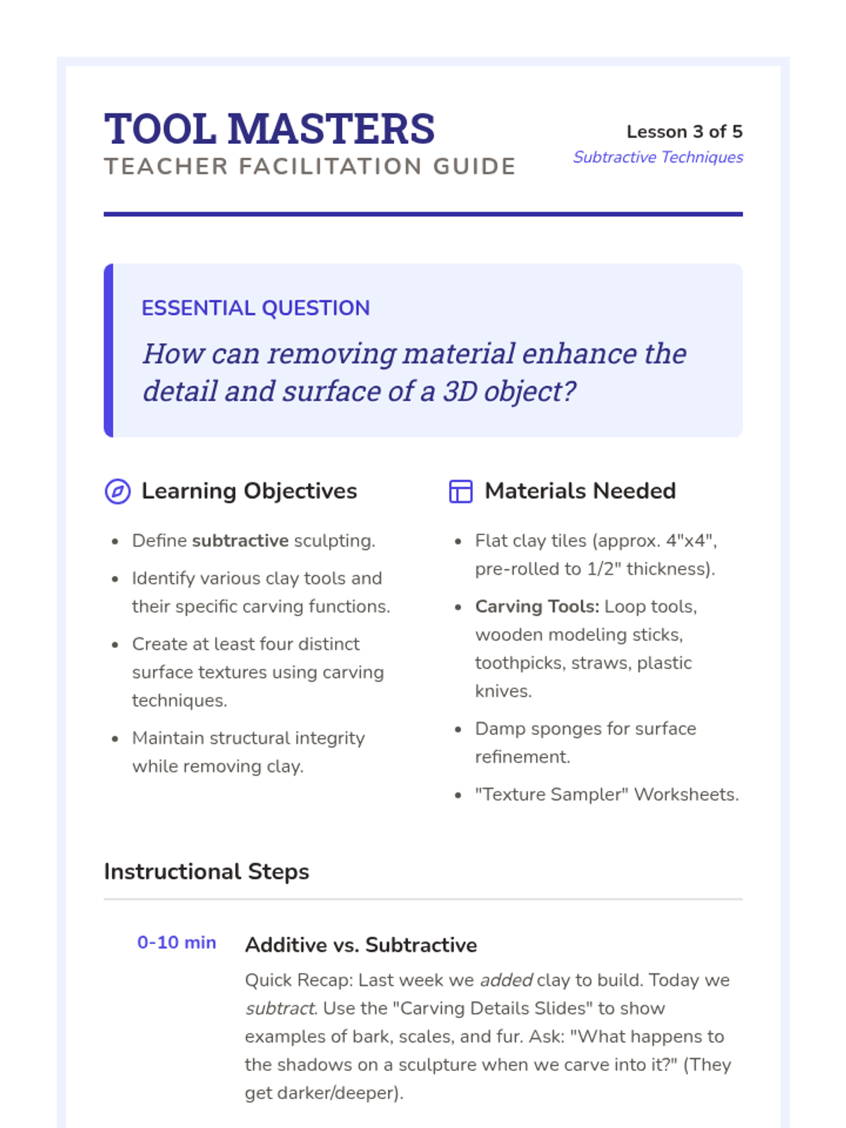 A 5-lesson unit for 3rd-grade students exploring clay hand-building. Students learn about form, plasticity, joining techniques (scoring and slipping), subtractive carving for texture, and culminate in a 3D clay creature project.
