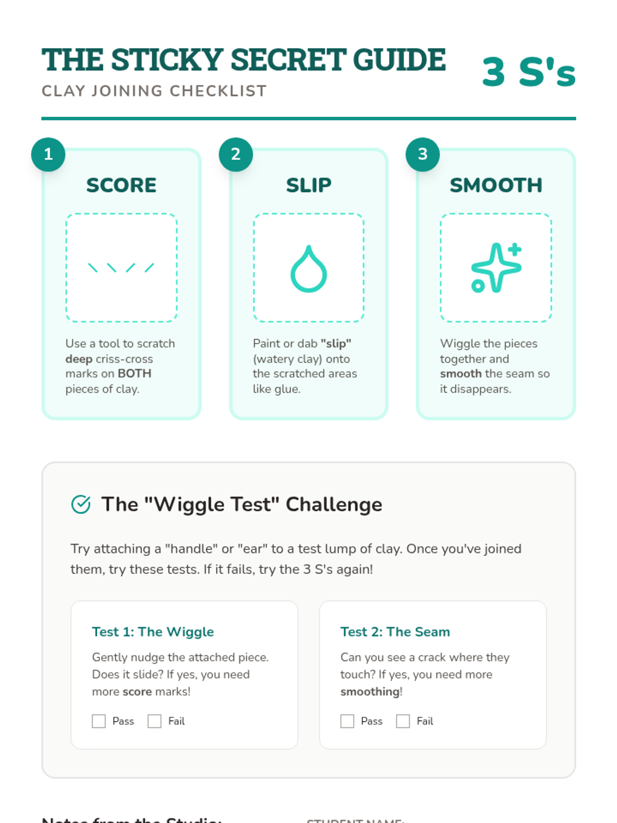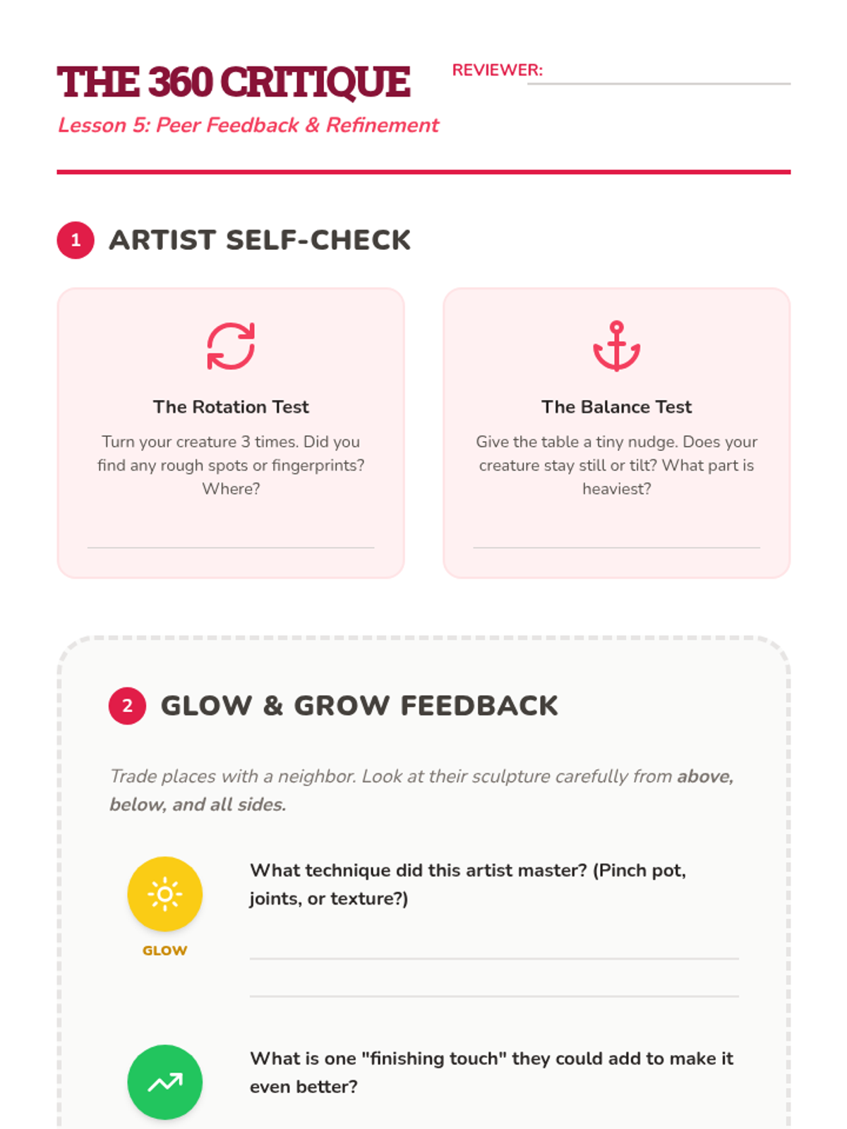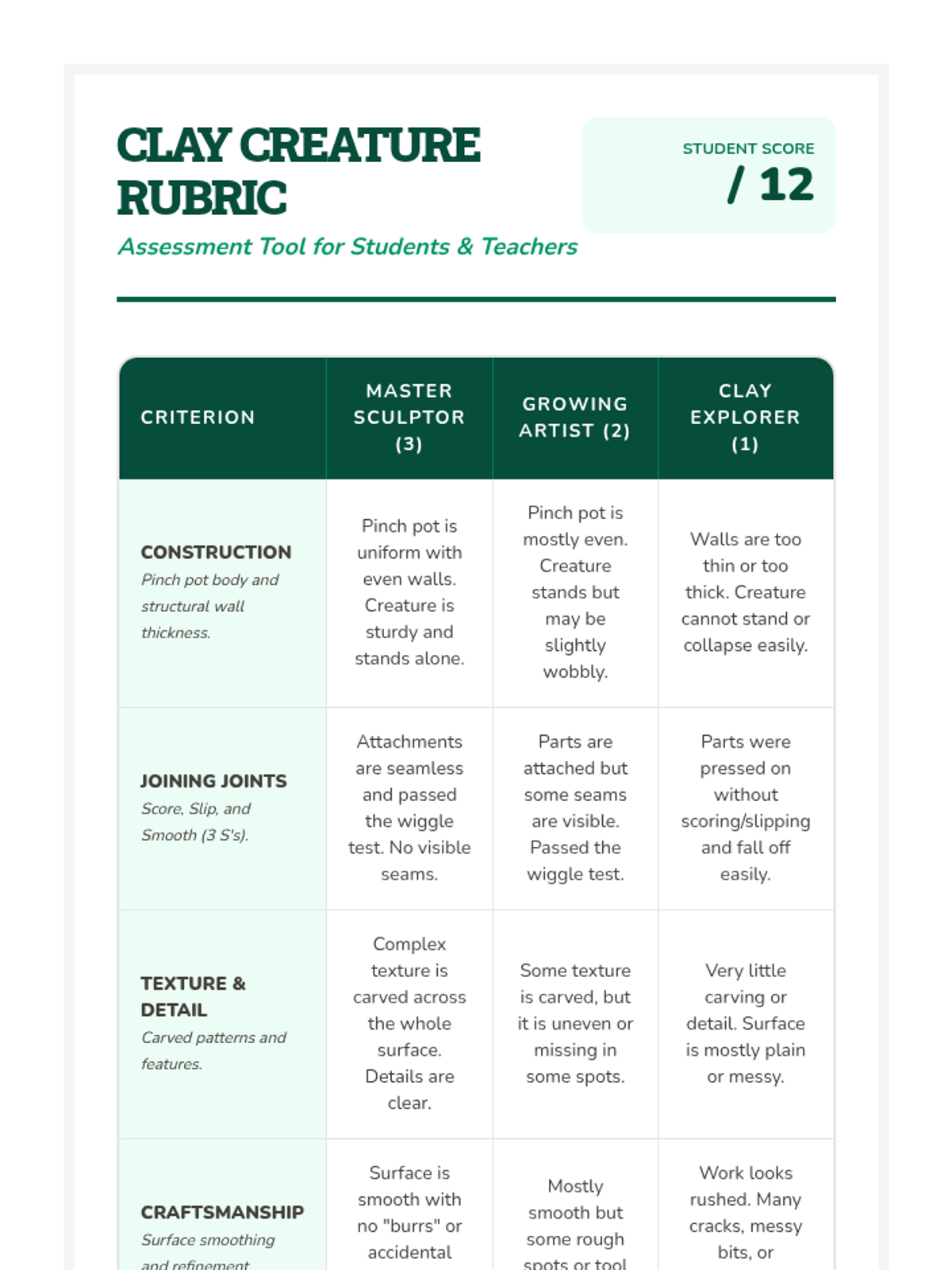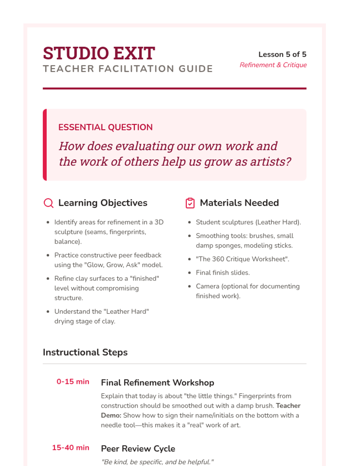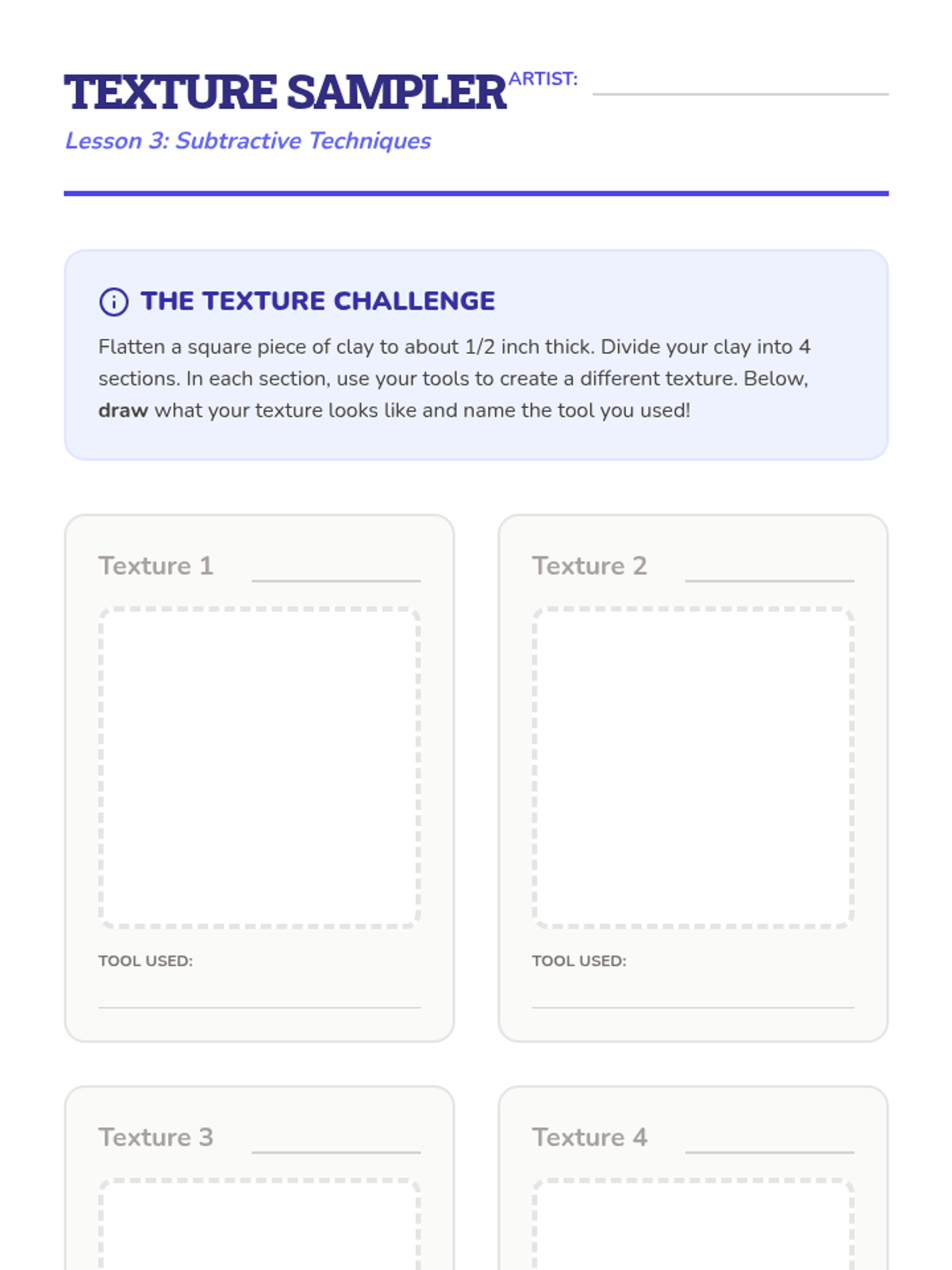 A 5-lesson unit for 3rd-grade students exploring clay hand-building. Students learn about form, plasticity, joining techniques (scoring and slipping), subtractive carving for texture, and culminate in a 3D clay creature project.