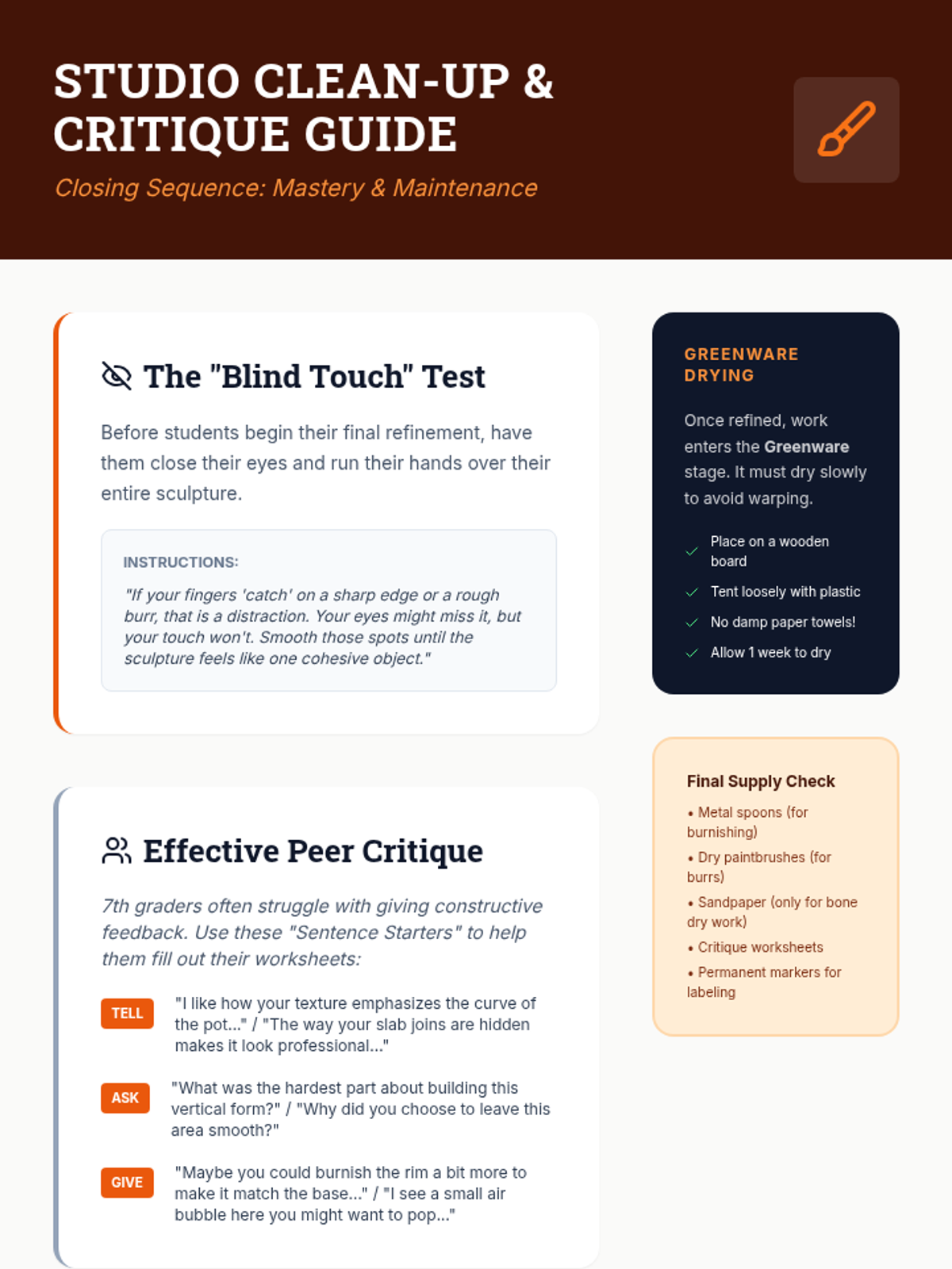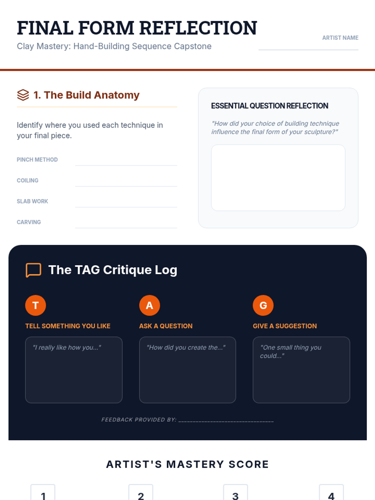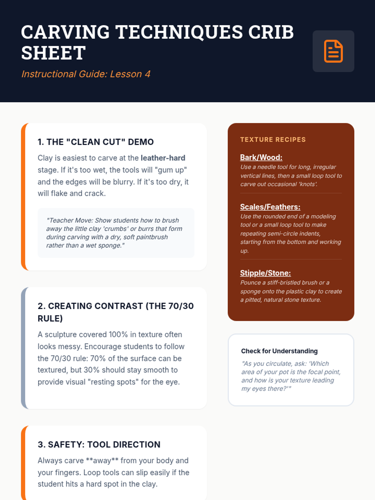 A comprehensive 5-lesson series for 7th-grade art students focused on mastering the four core hand-building techniques in clay: pinch, coil, slab, and carving. Students progress from raw material properties to creating a structurally sound and aesthetically textured vessel.