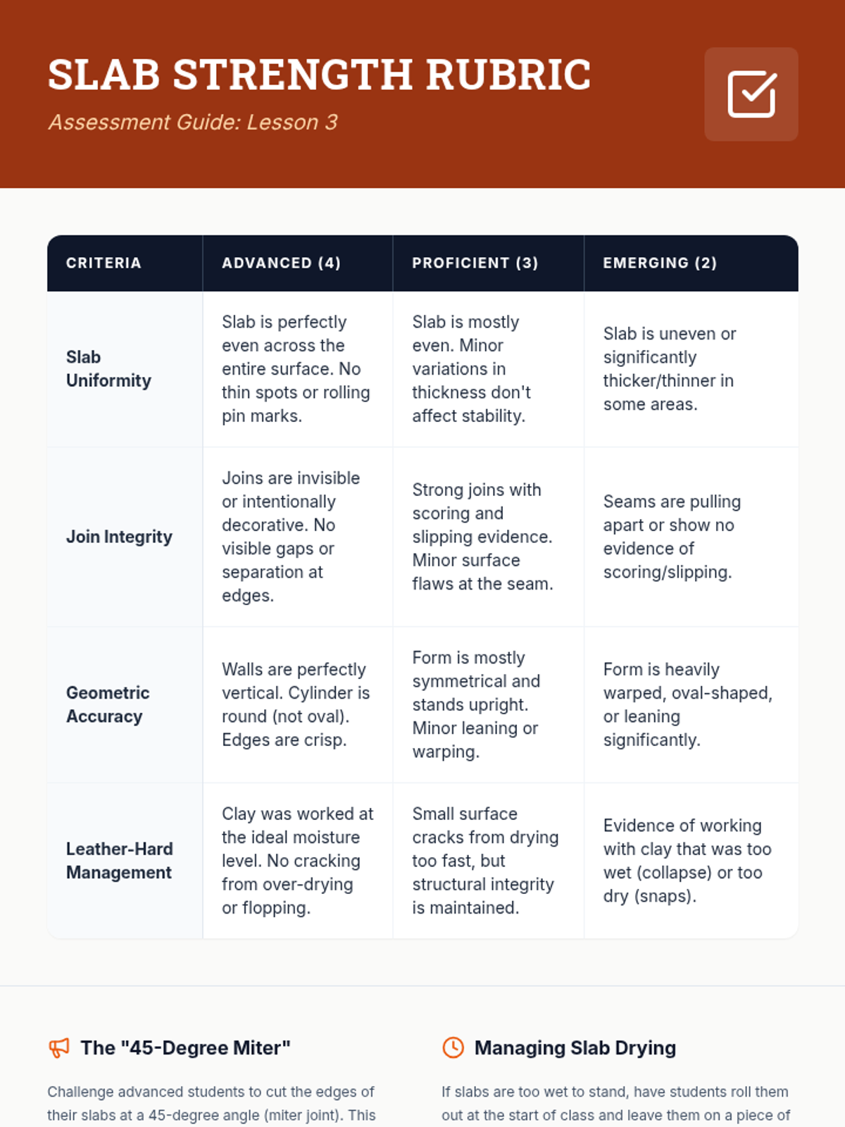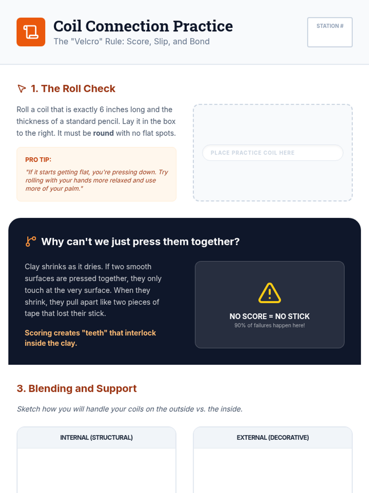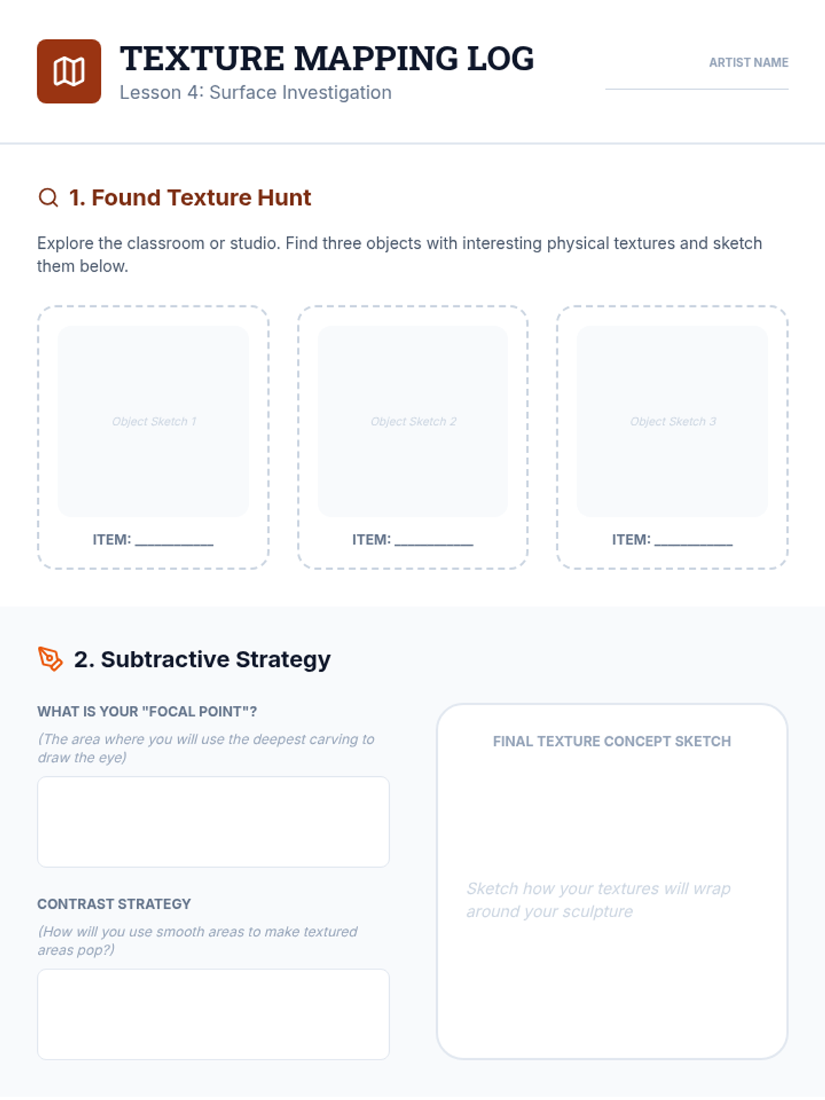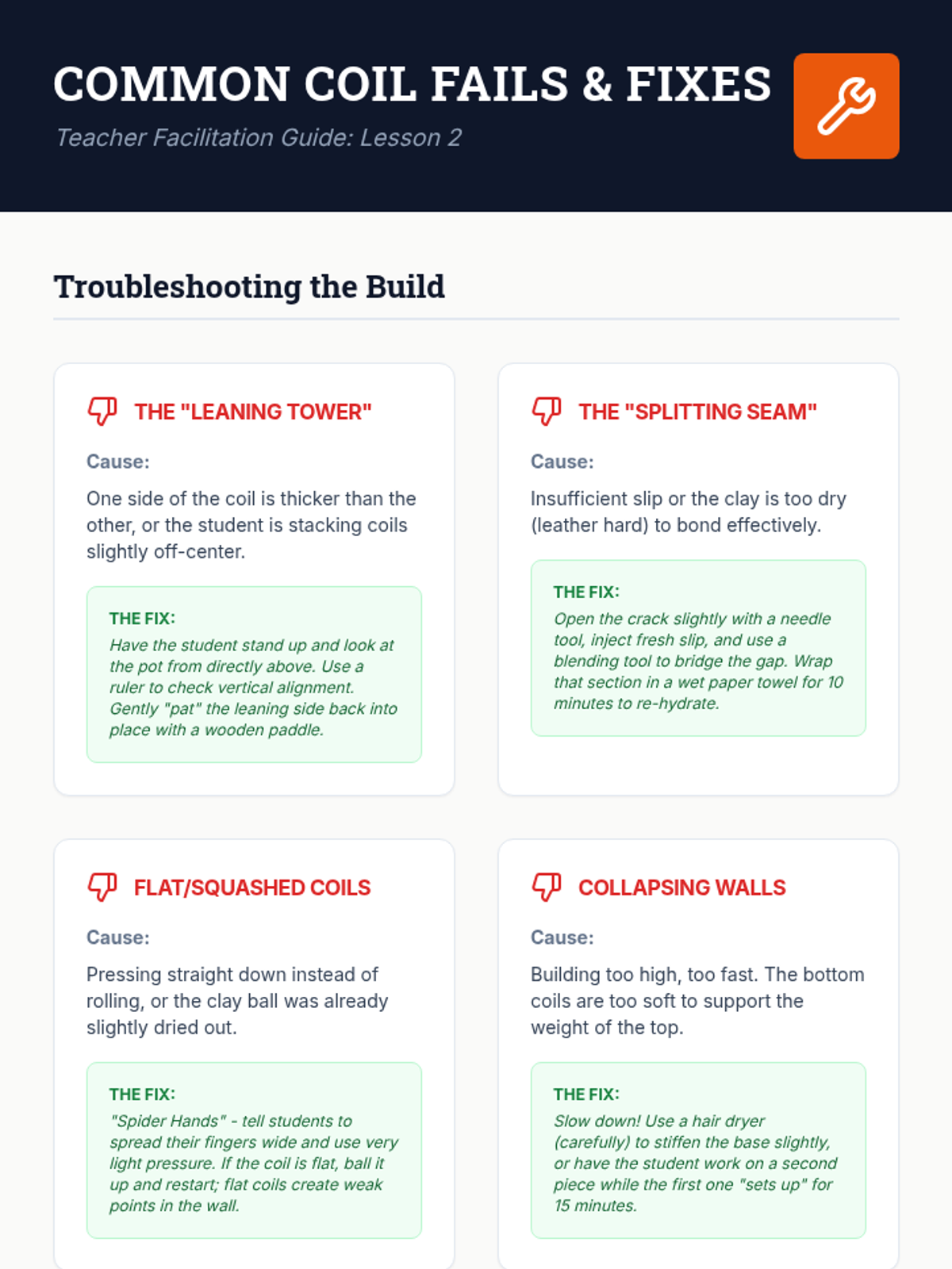 A comprehensive 5-lesson series for 7th-grade art students focused on mastering the four core hand-building techniques in clay: pinch, coil, slab, and carving. Students progress from raw material properties to creating a structurally sound and aesthetically textured vessel.