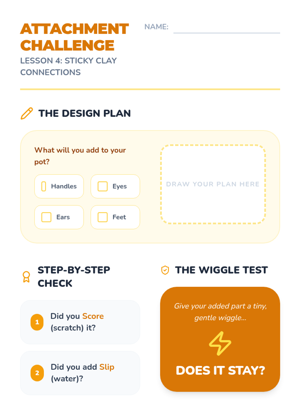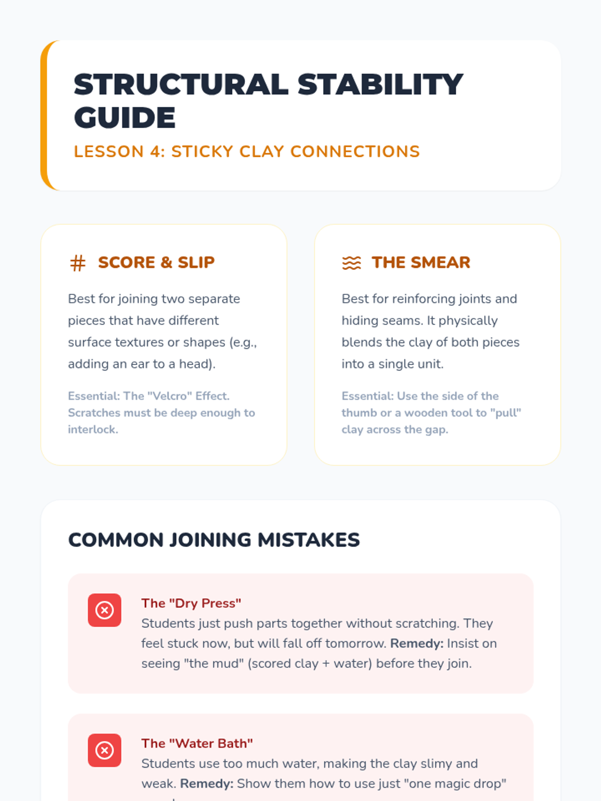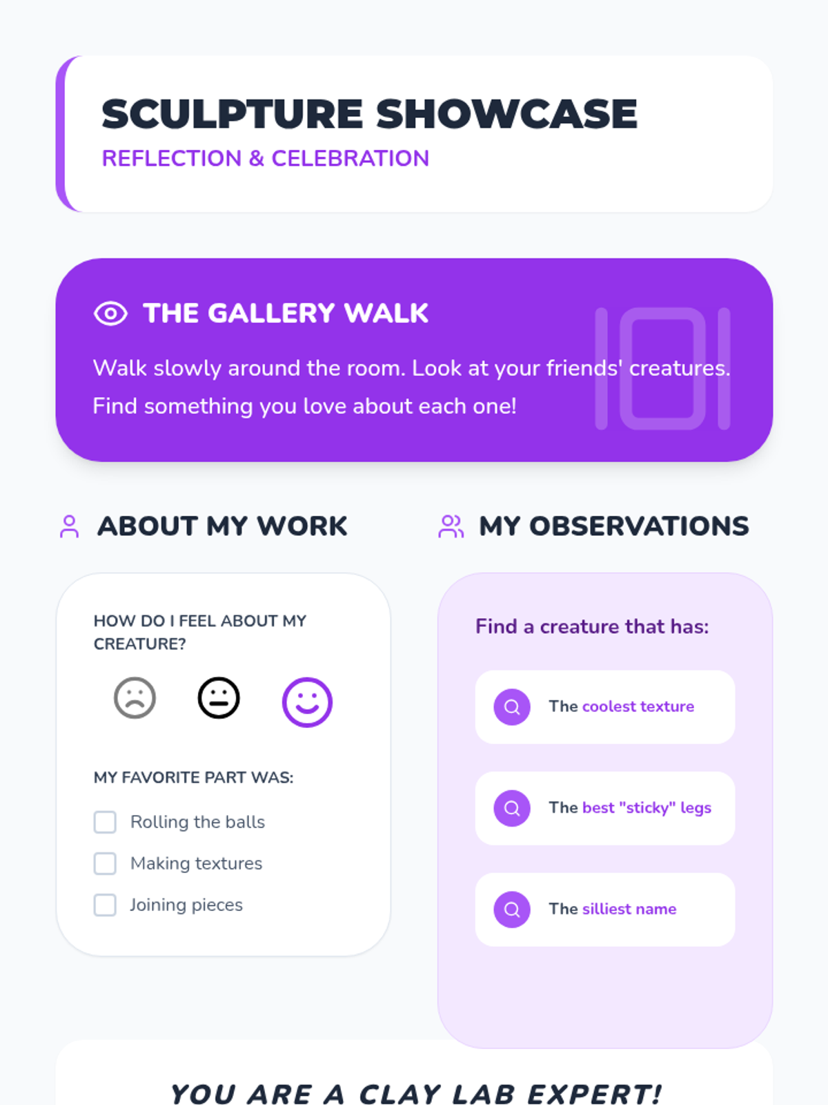 A tactile, hands-on sequence for 1st graders to explore the properties of clay, from sensory play and texture making to building 3D forms and creating an original clay creature.