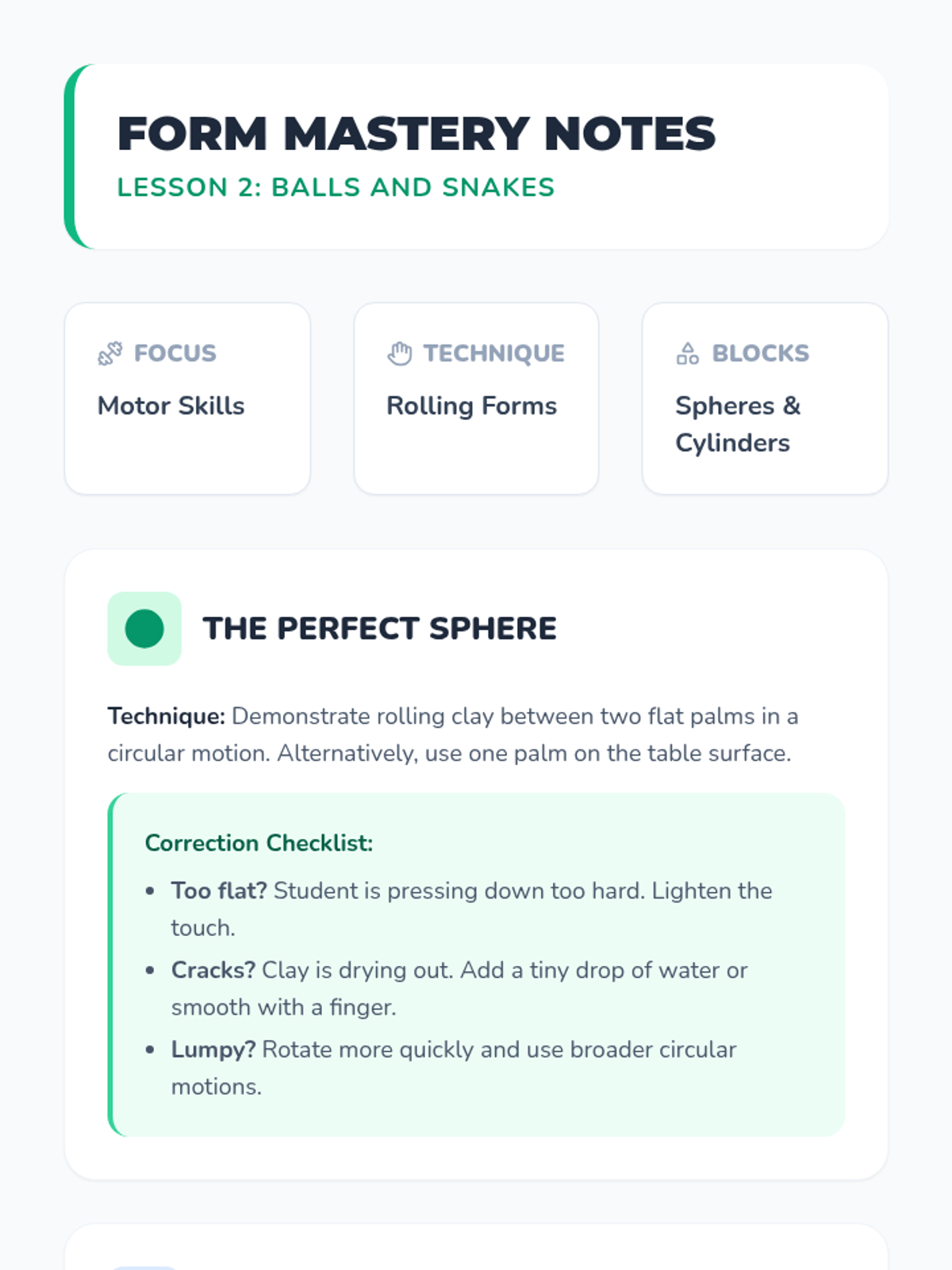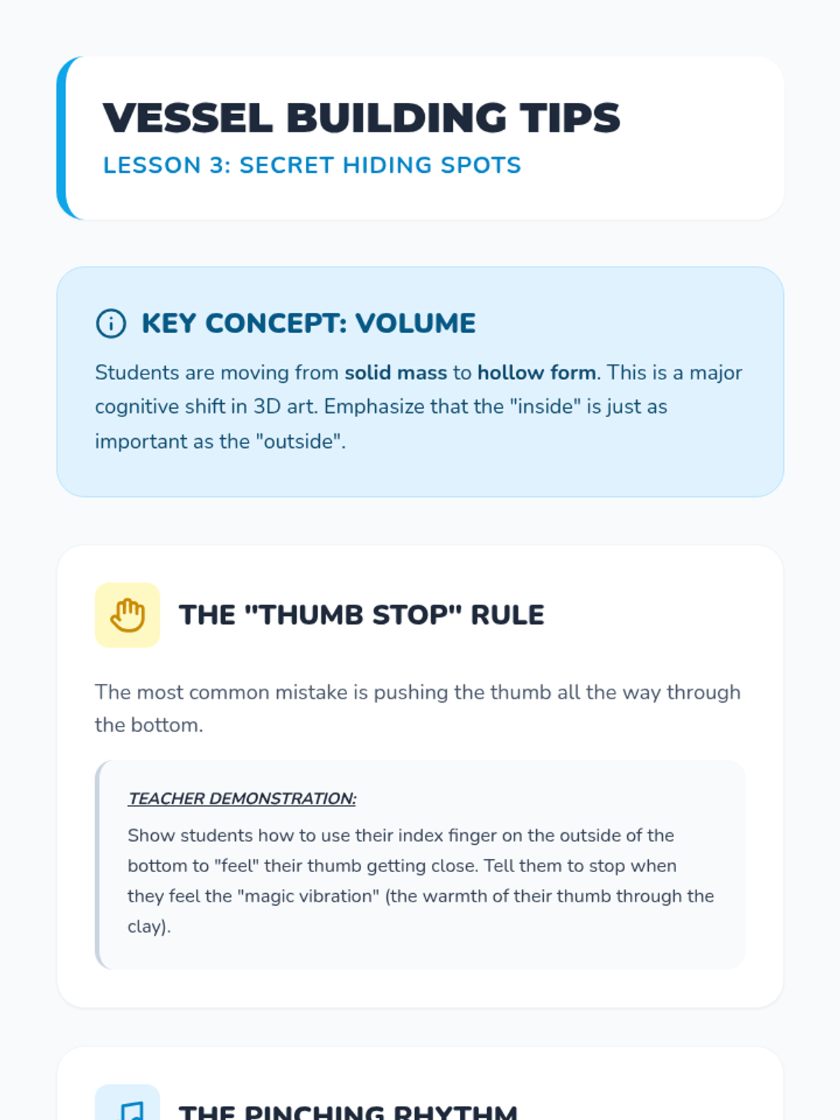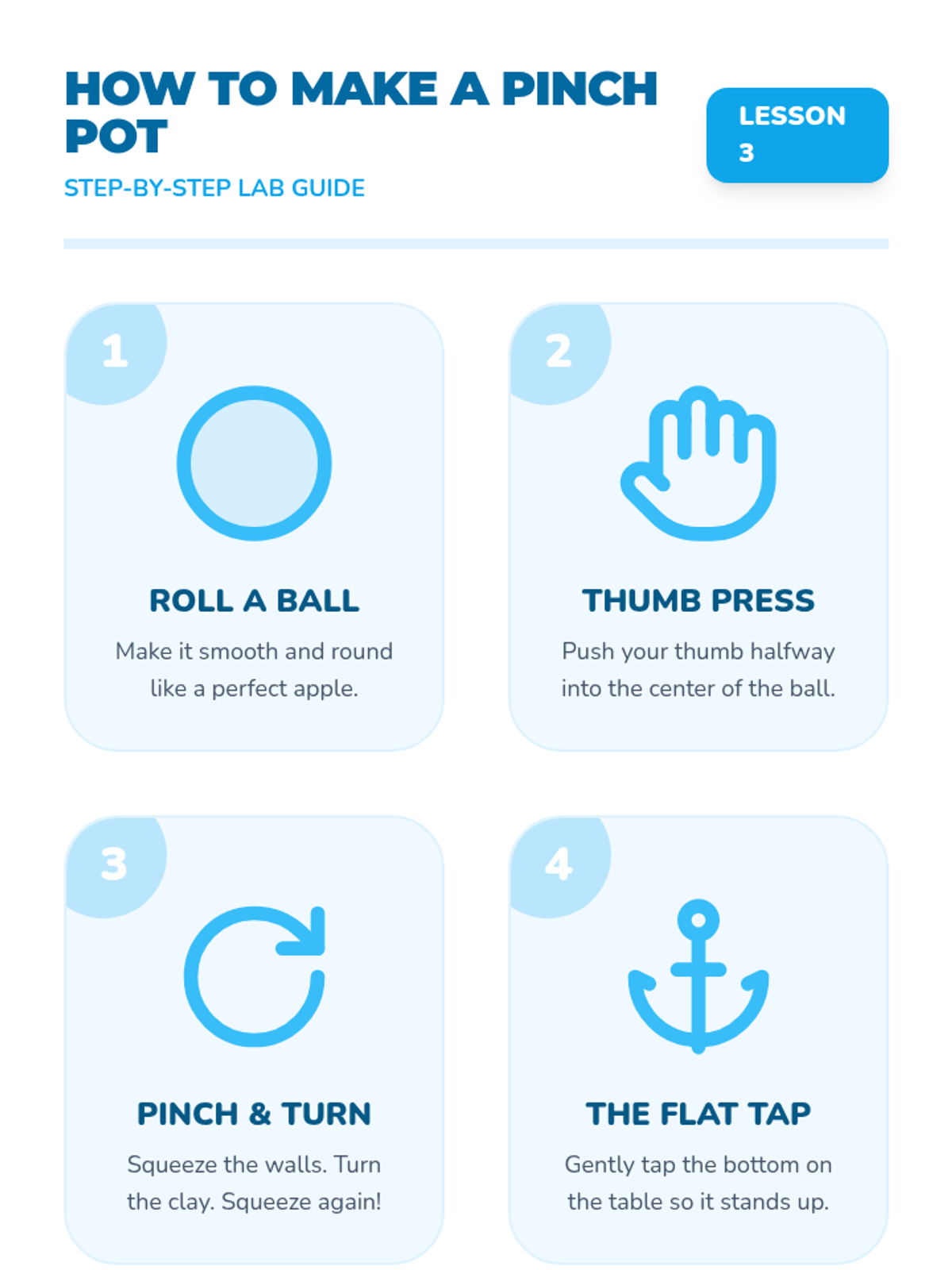 A tactile, hands-on sequence for 1st graders to explore the properties of clay, from sensory play and texture making to building 3D forms and creating an original clay creature.