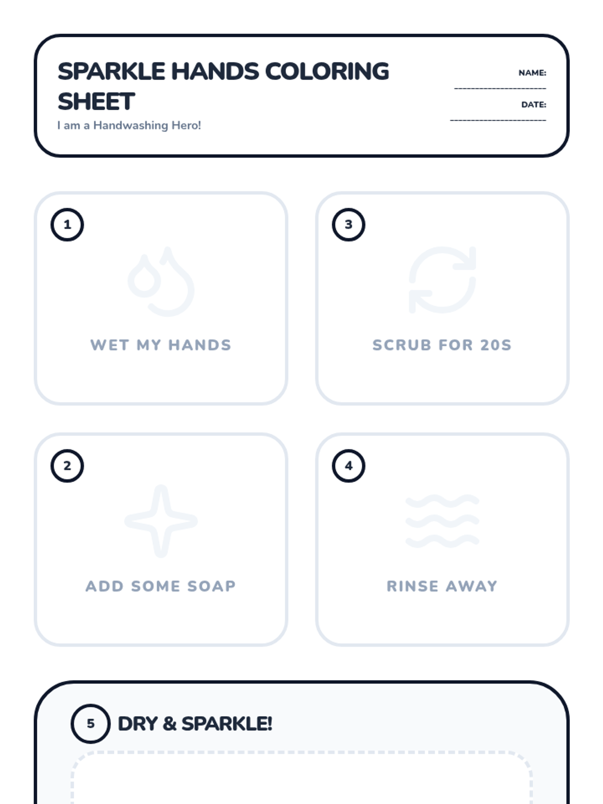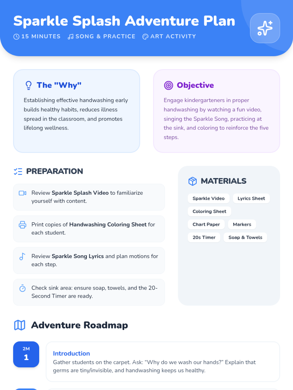 A comprehensive 2-day handwashing sequence for kindergarteners. Students learn essential hygiene habits through two fun adventures: first with Sunny the Soapie Bubble and Gigi the Germ, then with the Sparkle Splash adventure featuring a catchy song and coloring activities.