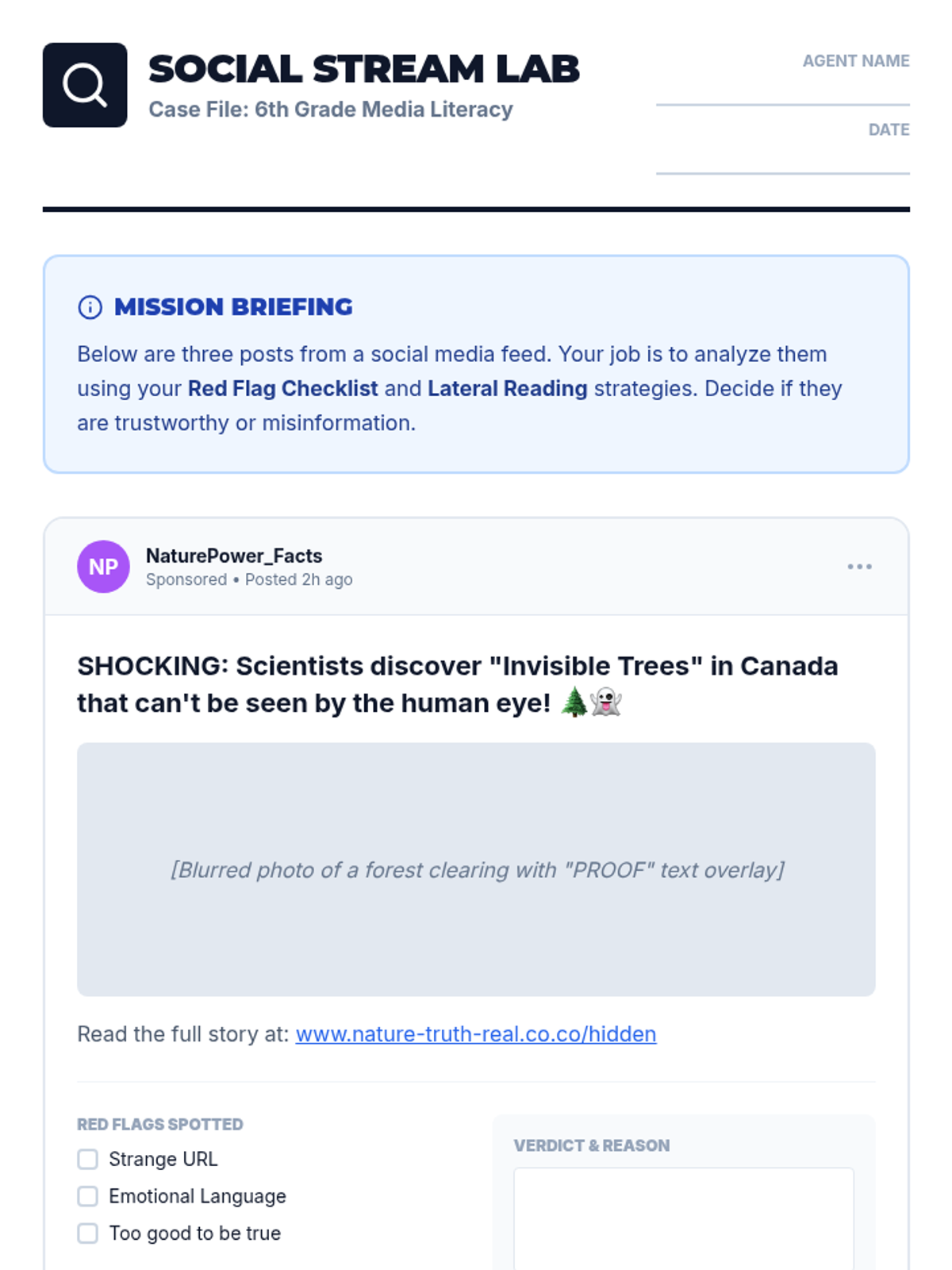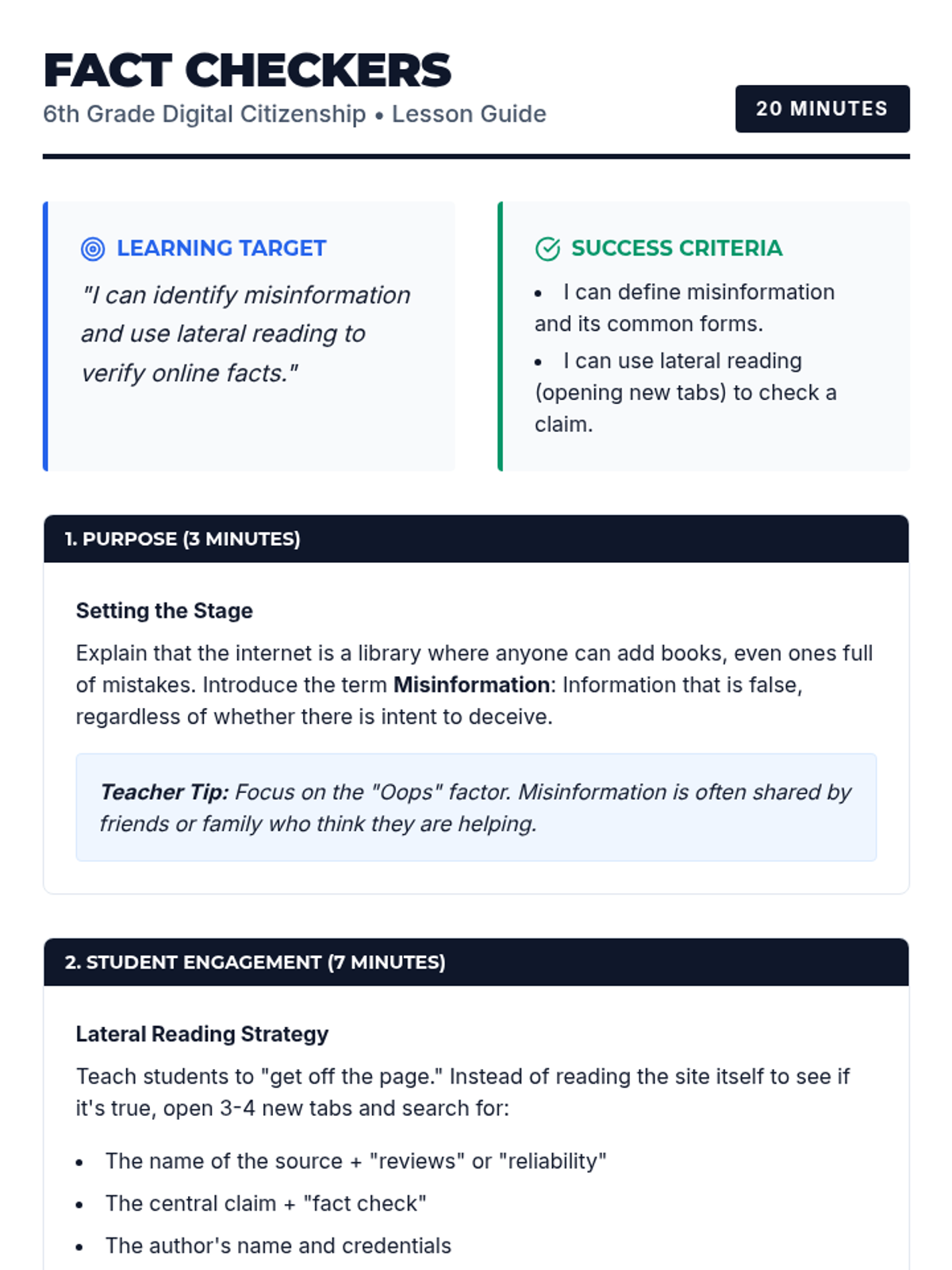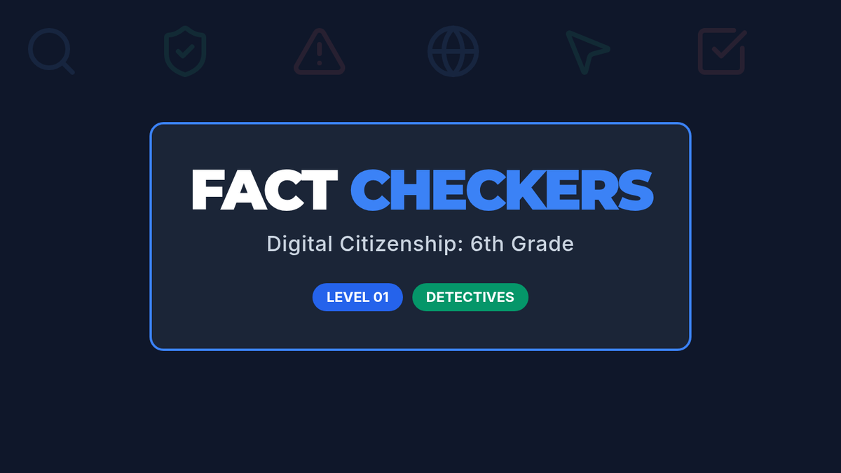 A three-part progression for middle schoolers to master identifying misinformation, bias, and sophisticated digital deception like AI-generated content. Students advance from basic fact-checking to analyzing media bias and defending against deepfakes.