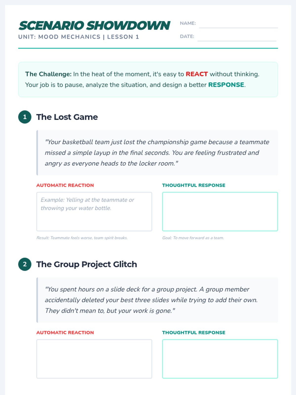 A comprehensive 6th-grade Social Emotional Learning unit focused on emotional regulation. Students learn to distinguish between reacting and responding, build a personal strategy toolbox, and apply these skills to real-world scenarios through reflection and a final project.