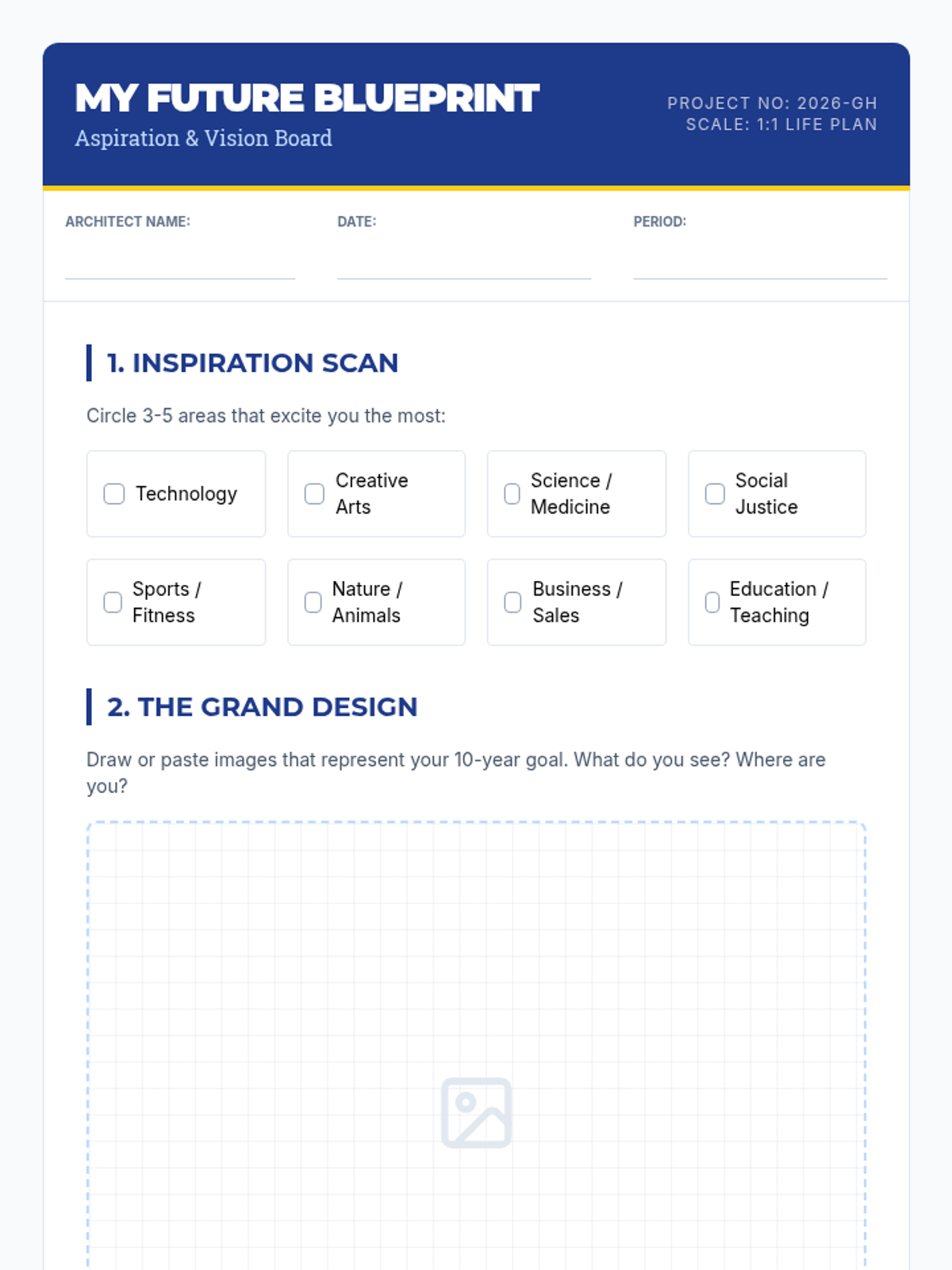 A 6-week transition program for 8th graders. Each 15-minute session uses an architectural blueprint theme to demystify high school, covering logistics, support systems, myths, and personal goal-setting.