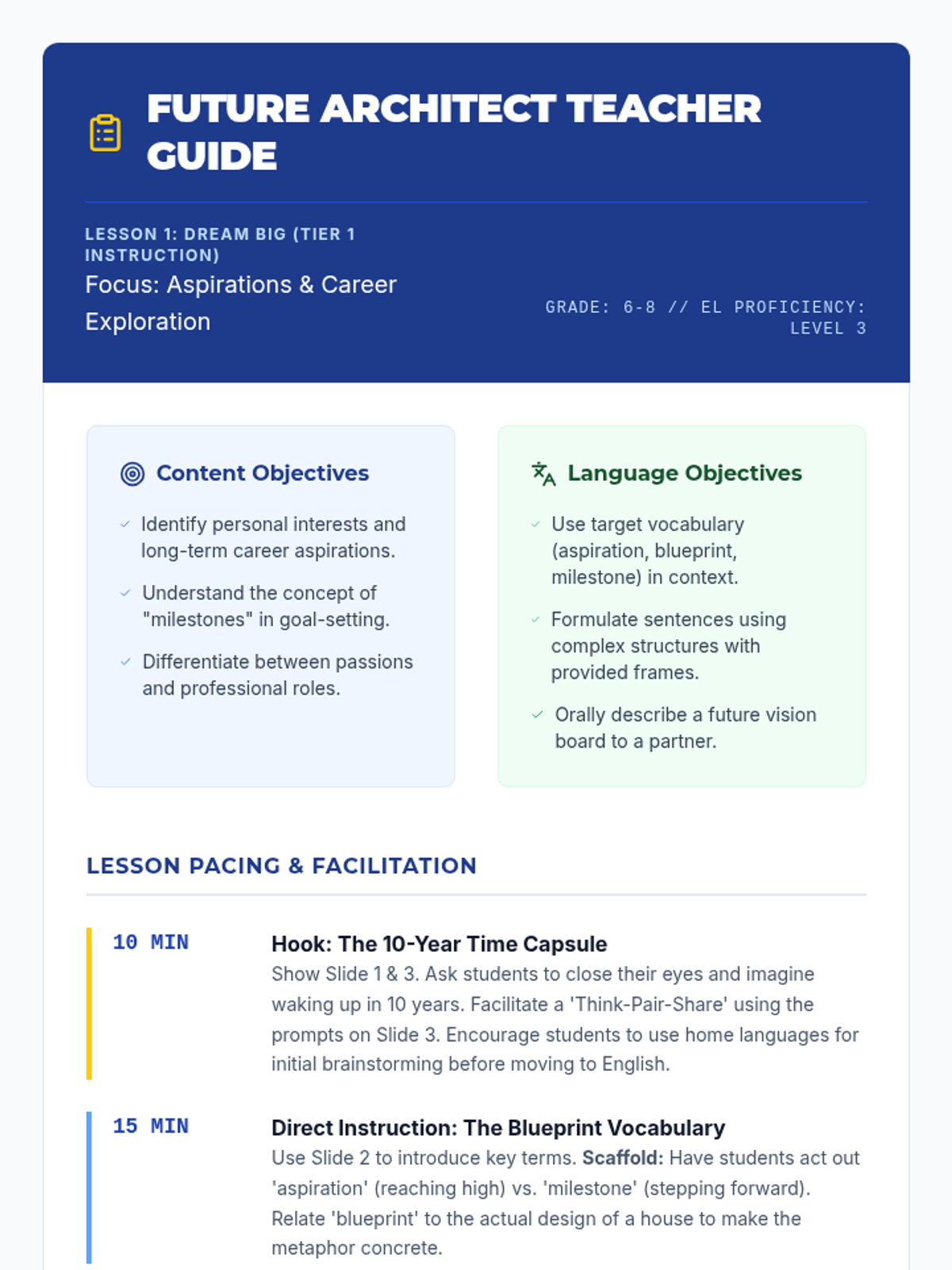 A comprehensive goal-setting unit designed for 6th-8th grade English Learners at Level 3 proficiency. The sequence includes whole-class Tier 1 instruction on aspirations and targeted Tier 2 support for actionable goal mapping using a blueprint-inspired design.