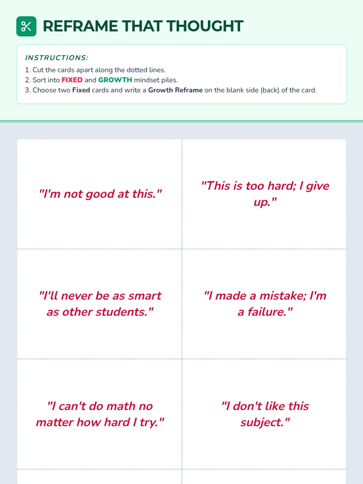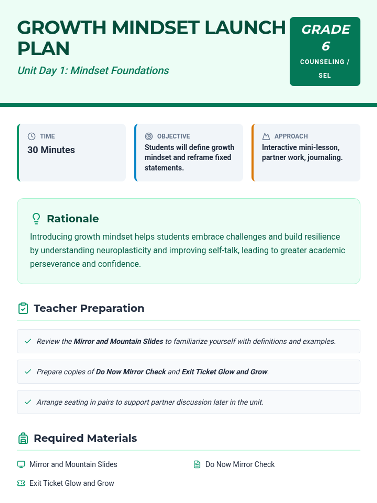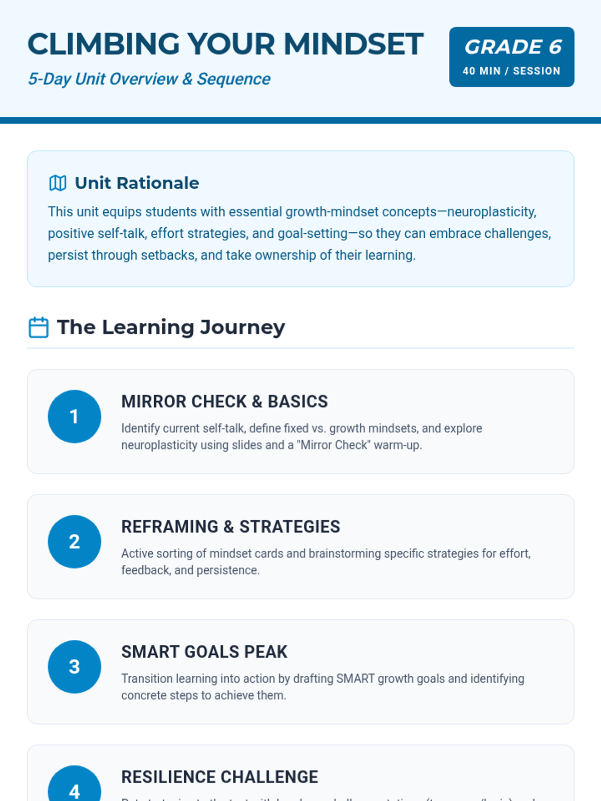 A 5-day middle school unit where students explore neuroplasticity, self-talk, and resilience to build a growth mindset through interactive challenges and goal-setting.