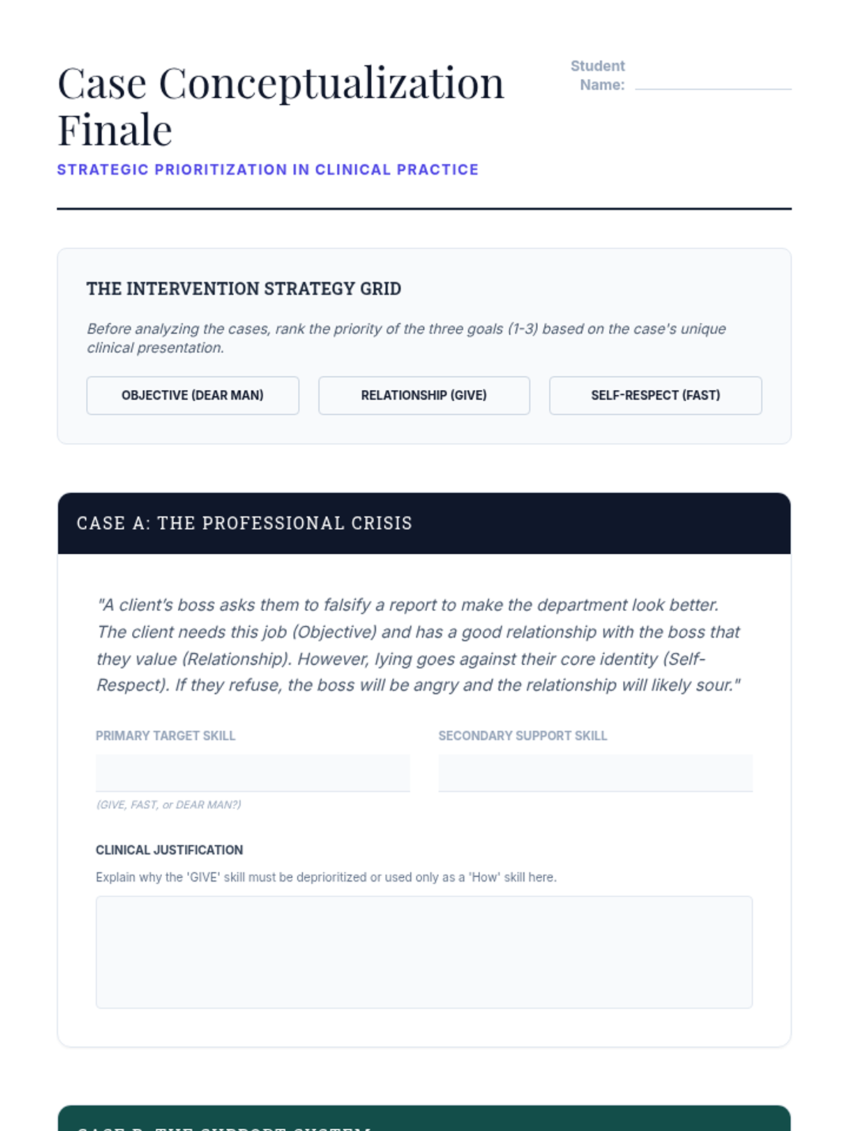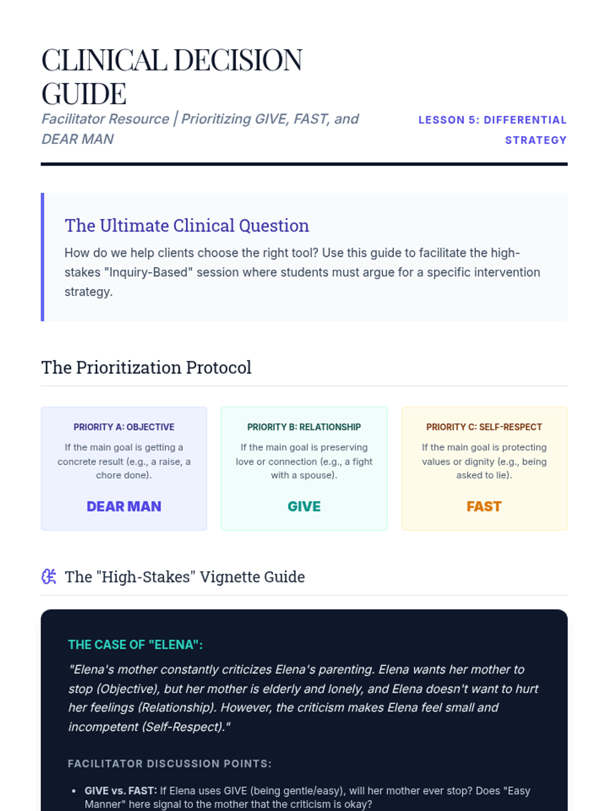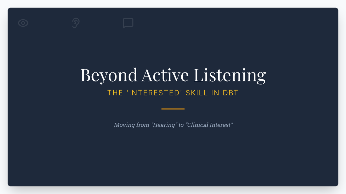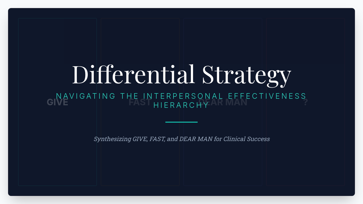 This graduate-level sequence deconstructs the GIVE skill set (Gentle, Interested, Validate, Easy Manner) within DBT, focusing on clinical conceptualization, neurobiological underpinnings, and differential application in complex interpersonal systems. Students progress from theoretical analysis to sophisticated treatment planning and case conceptualization.