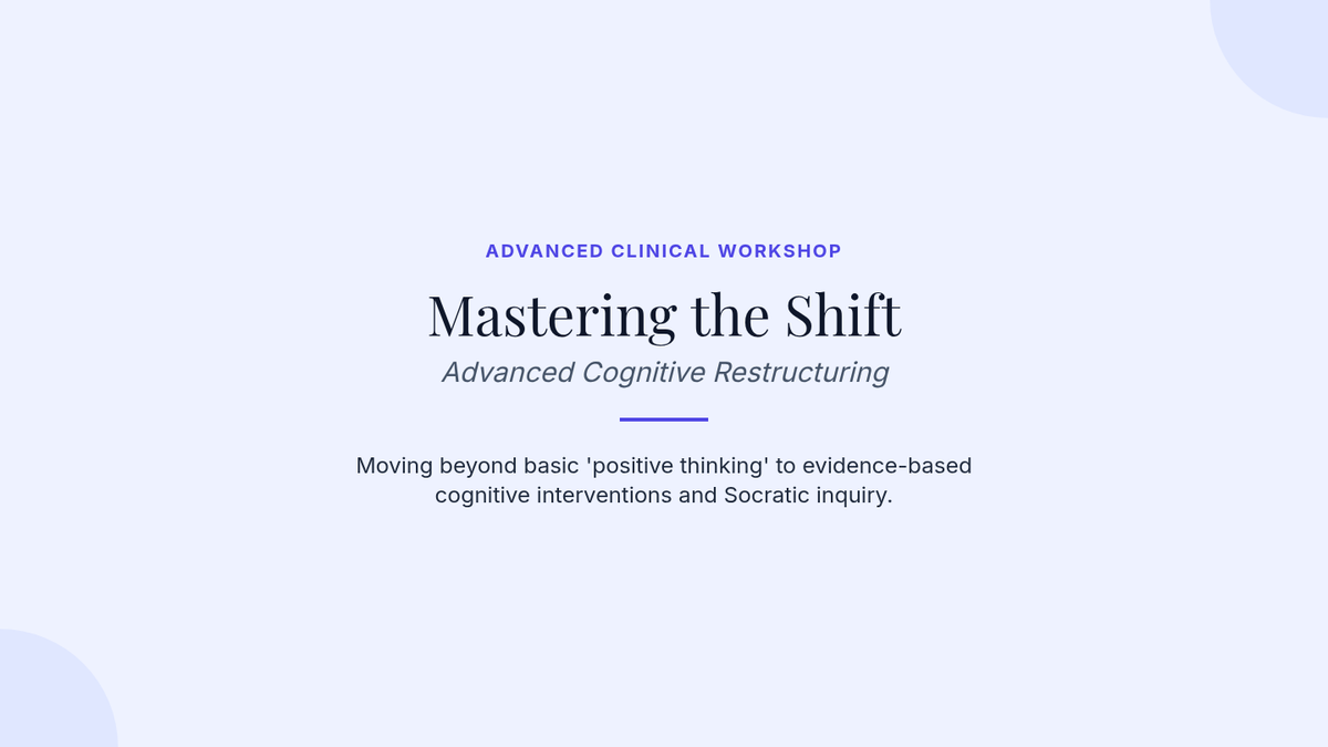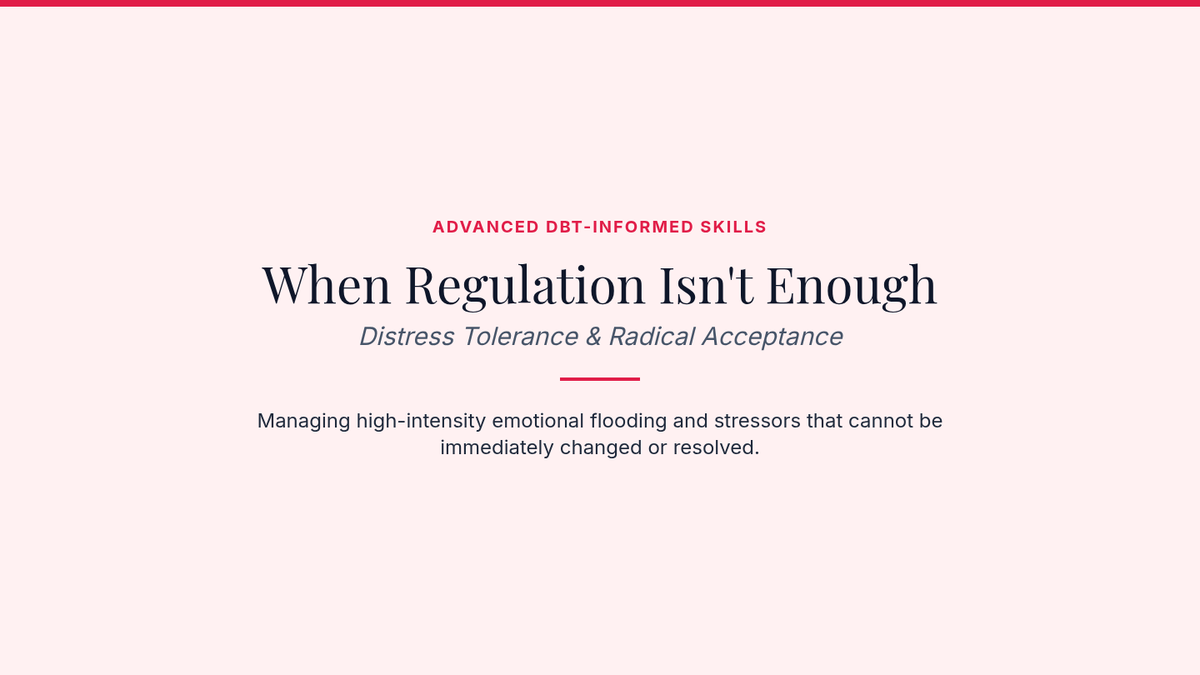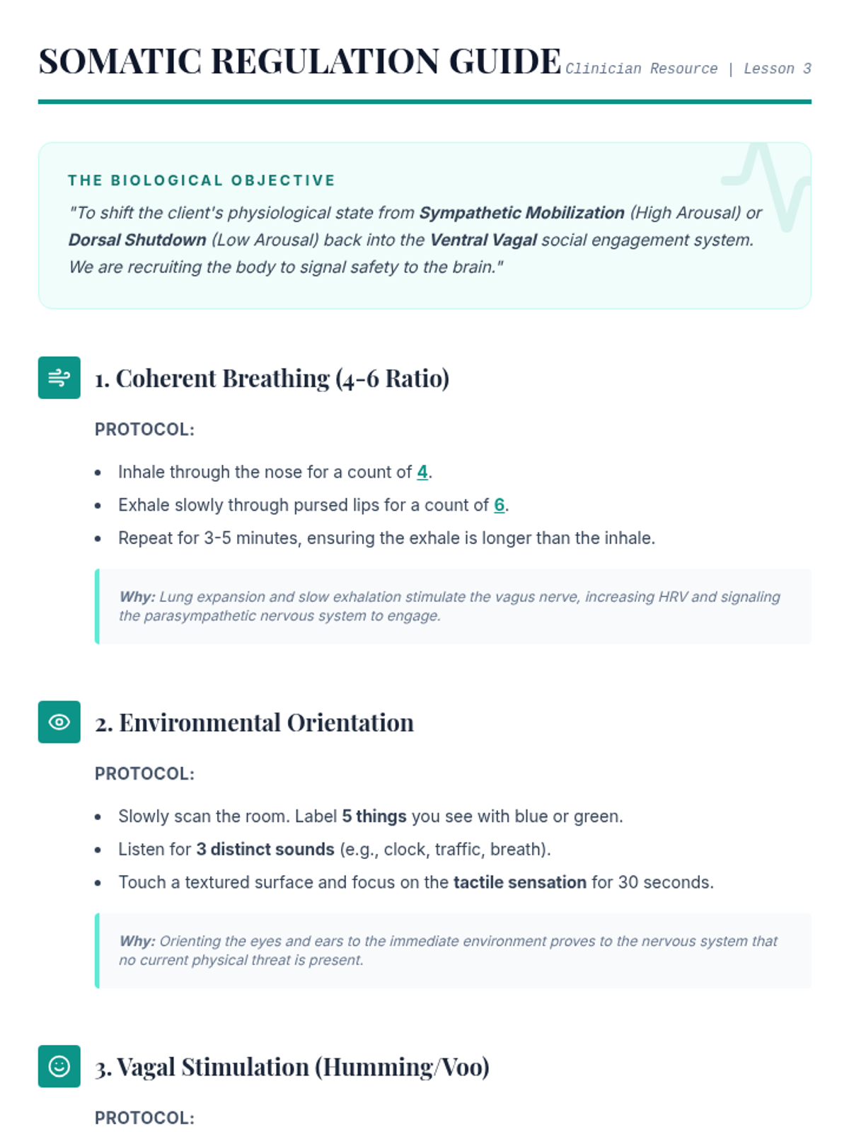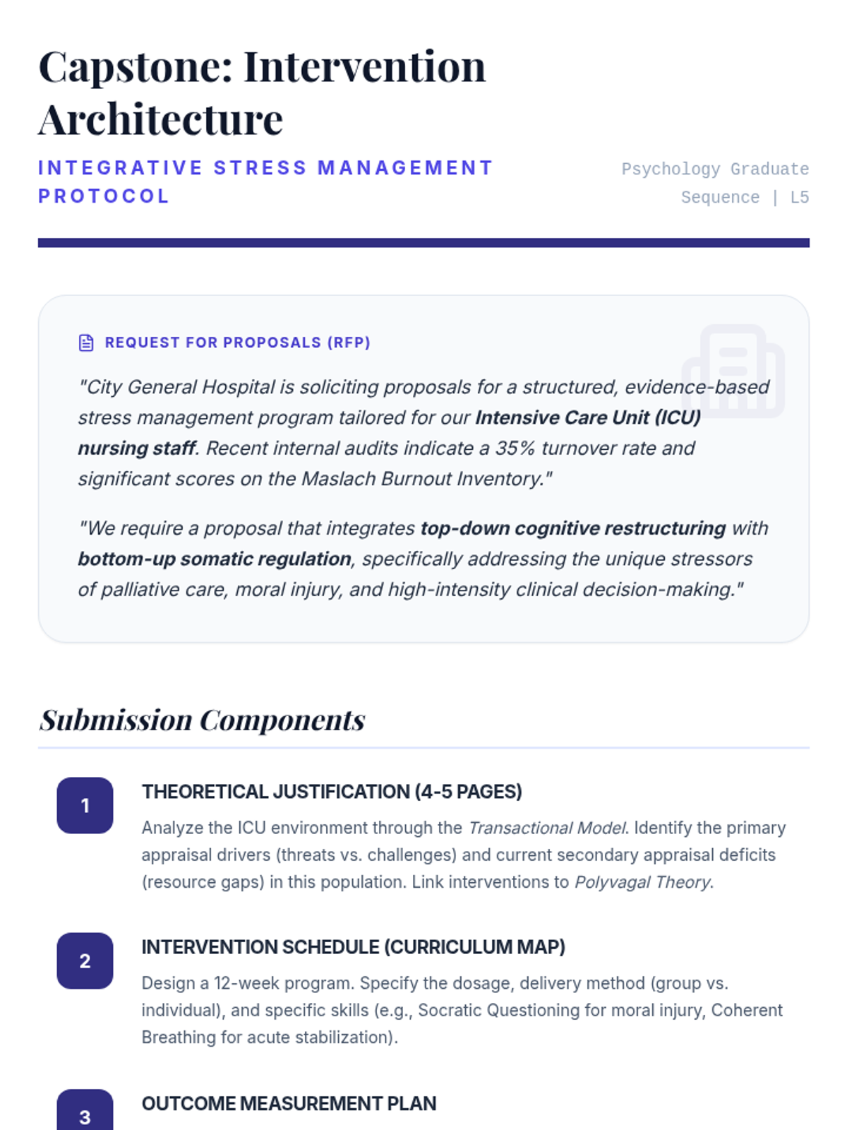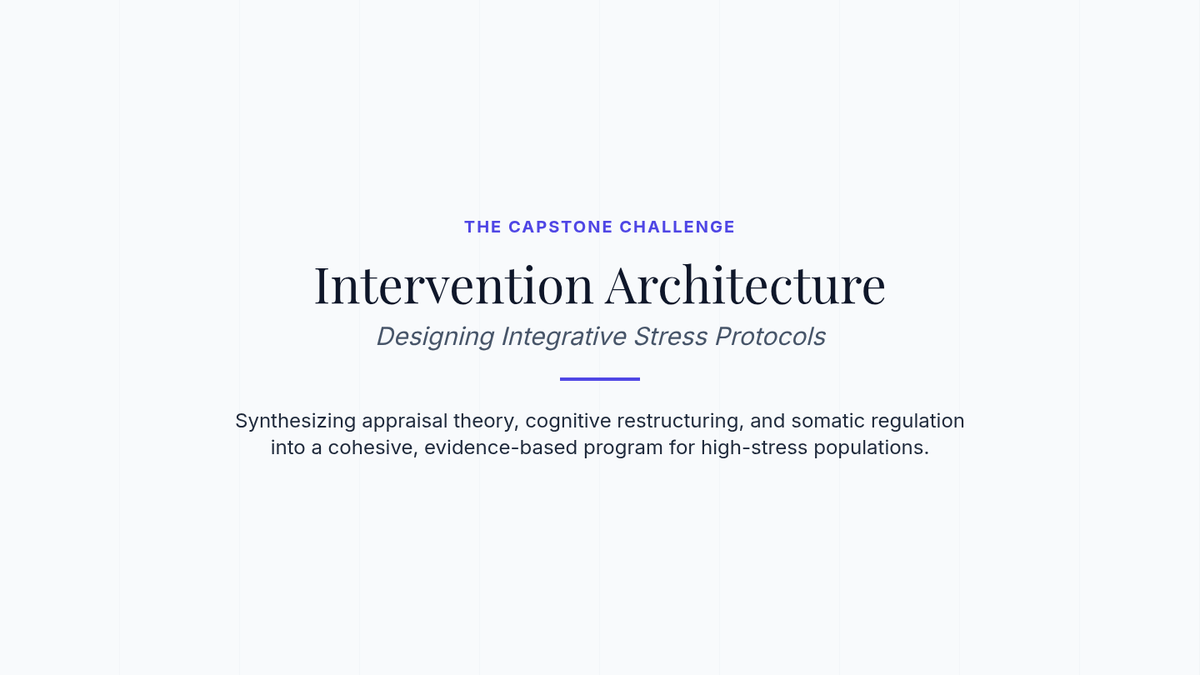 A graduate-level sequence focused on the clinical application of evidence-based stress management strategies. It transitions from theoretical appraisal (Lazarus & Folkman) to advanced cognitive restructuring, somatic regulation through Polyvagal Theory, and DBT-informed distress tolerance, culminating in the design of integrative intervention protocols.