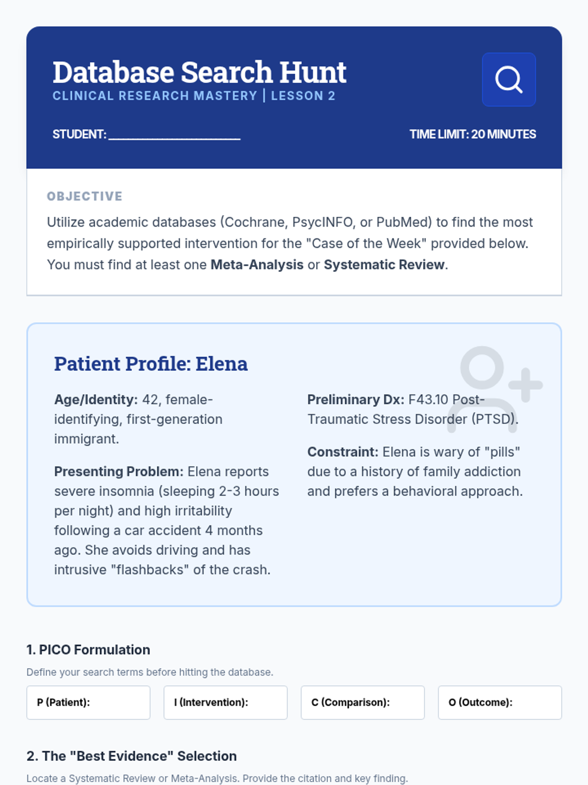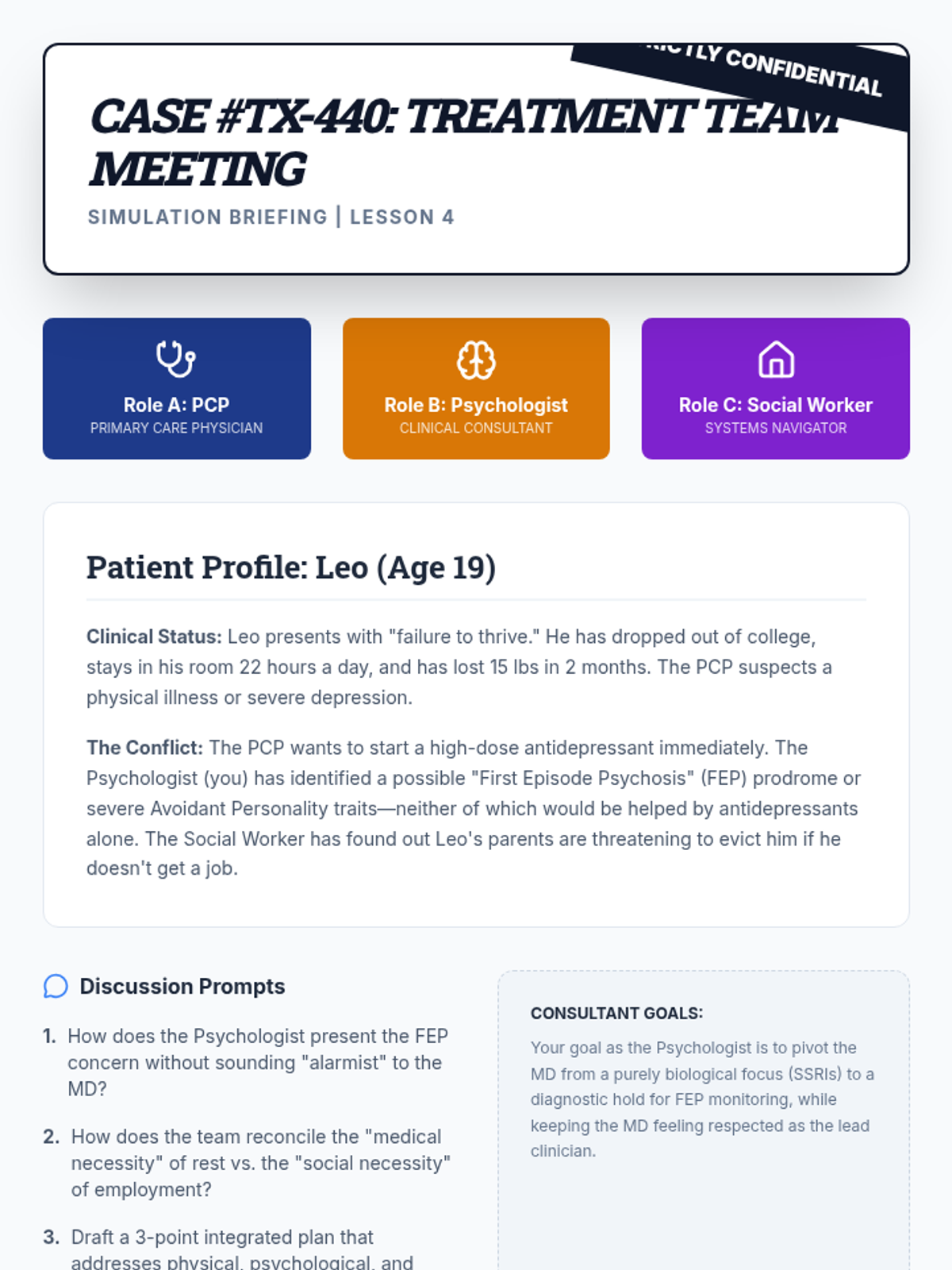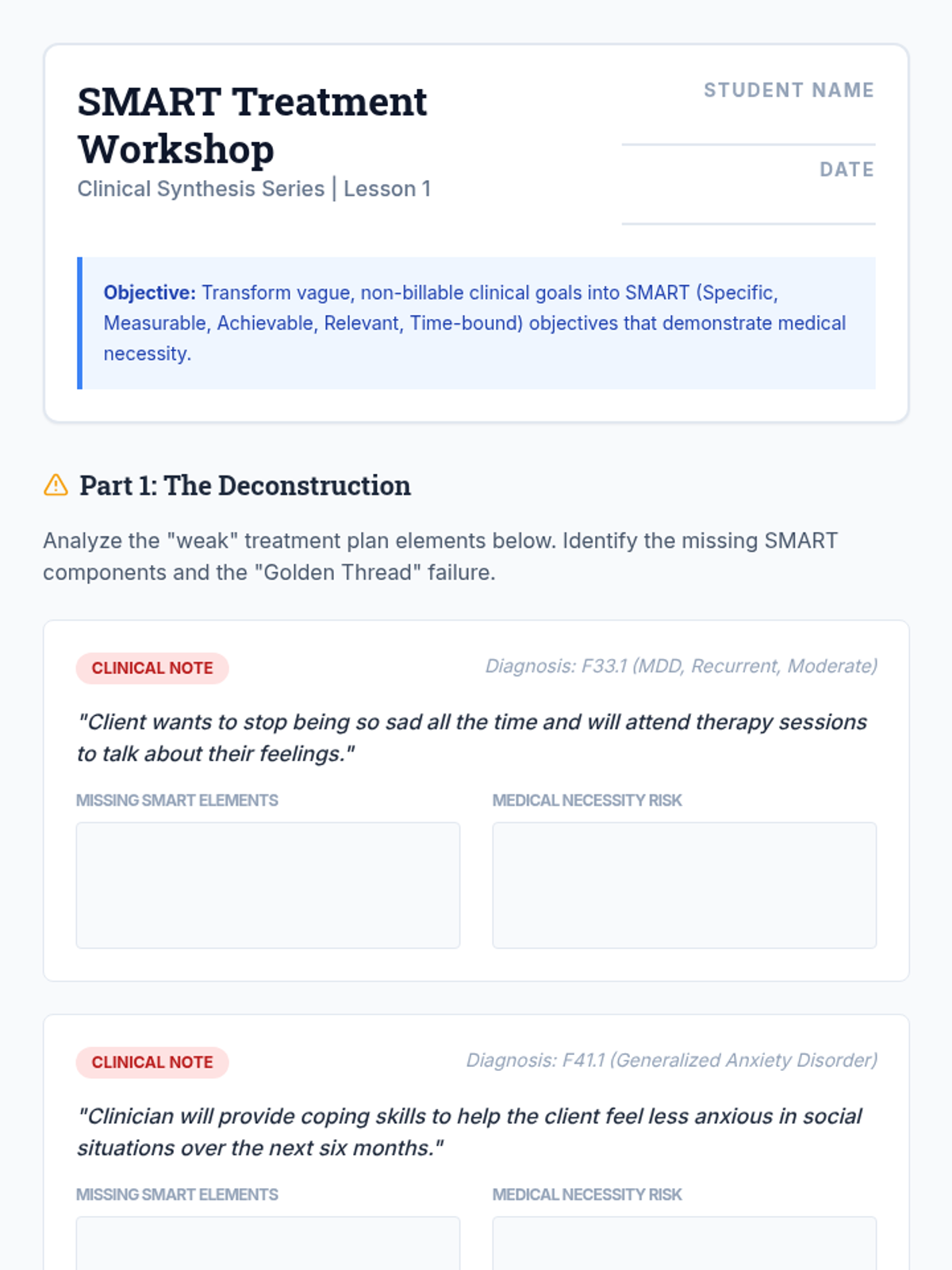 This graduate-level sequence guides clinical psychology students through the process of synthesizing assessment data into measurable treatment plans. Students will master the 'Golden Thread' of clinical documentation, integrate evidence-based practices, and utilize routine outcome monitoring to ensure professional accountability and patient progress.