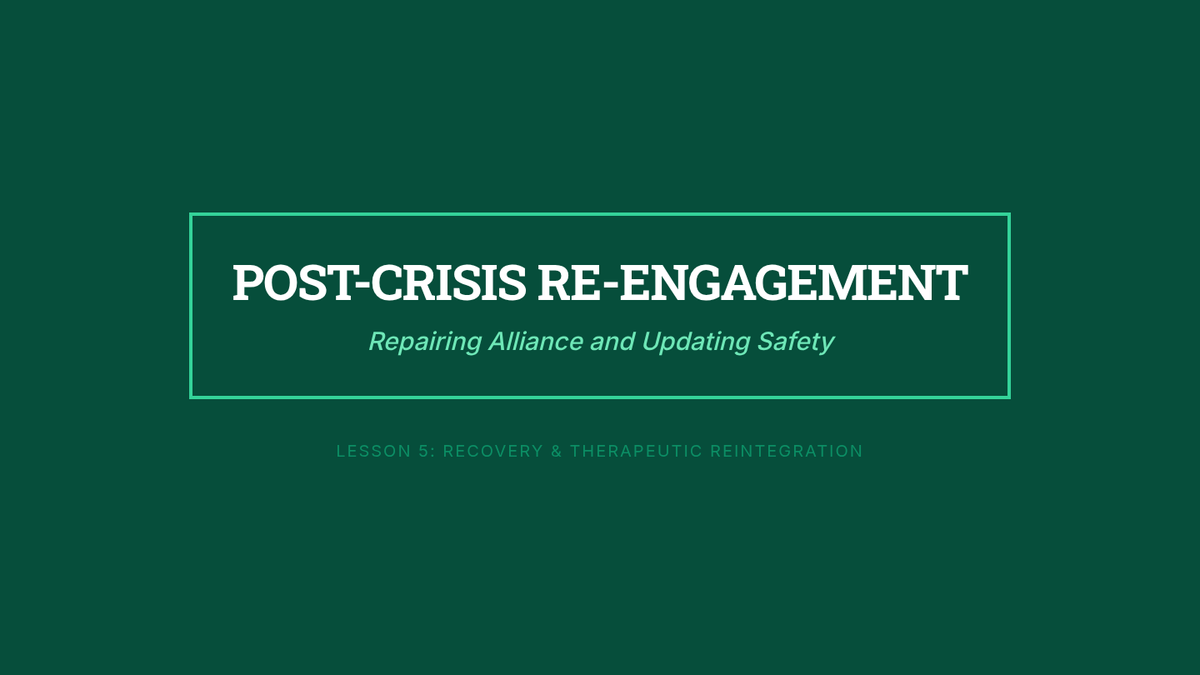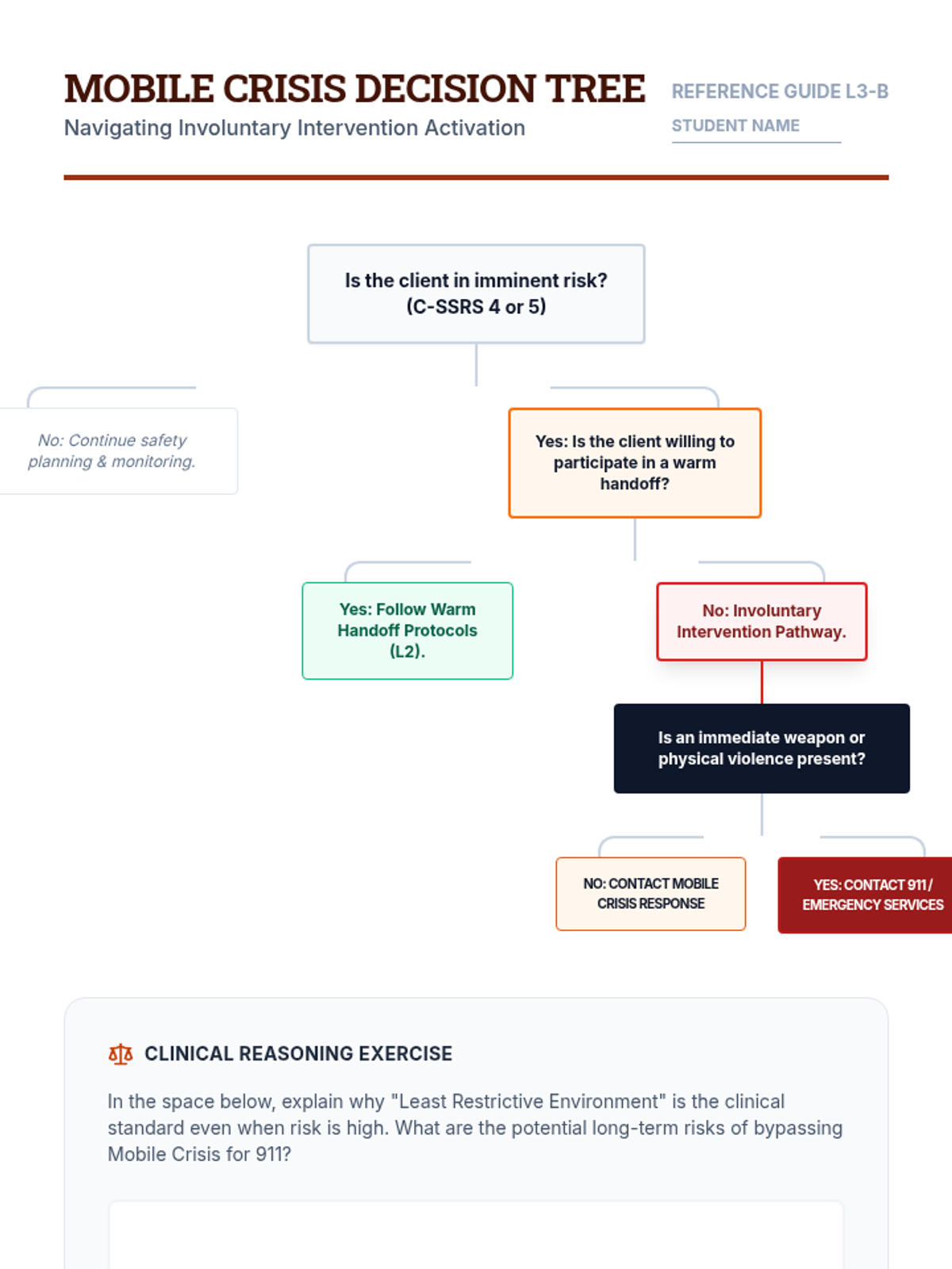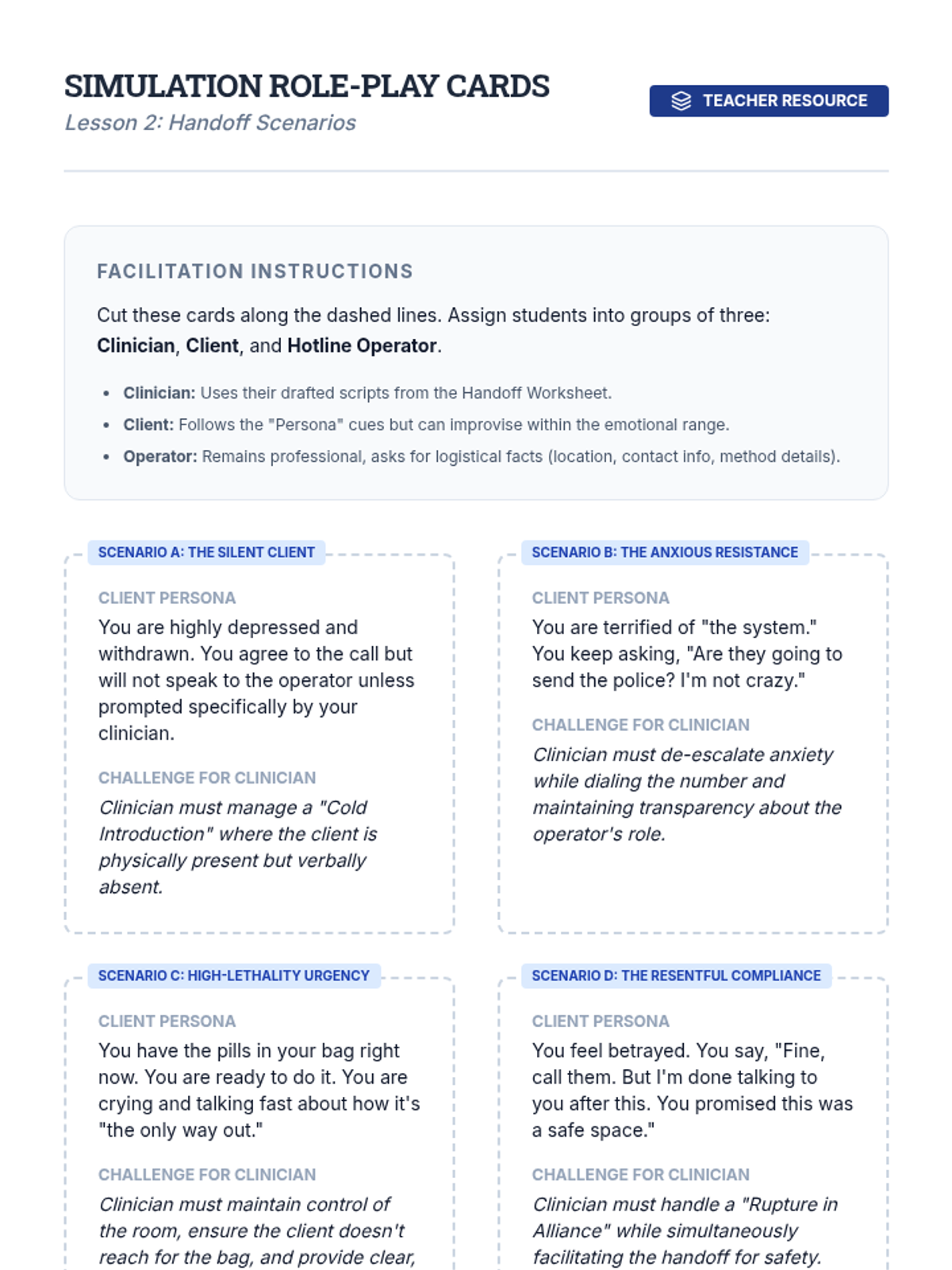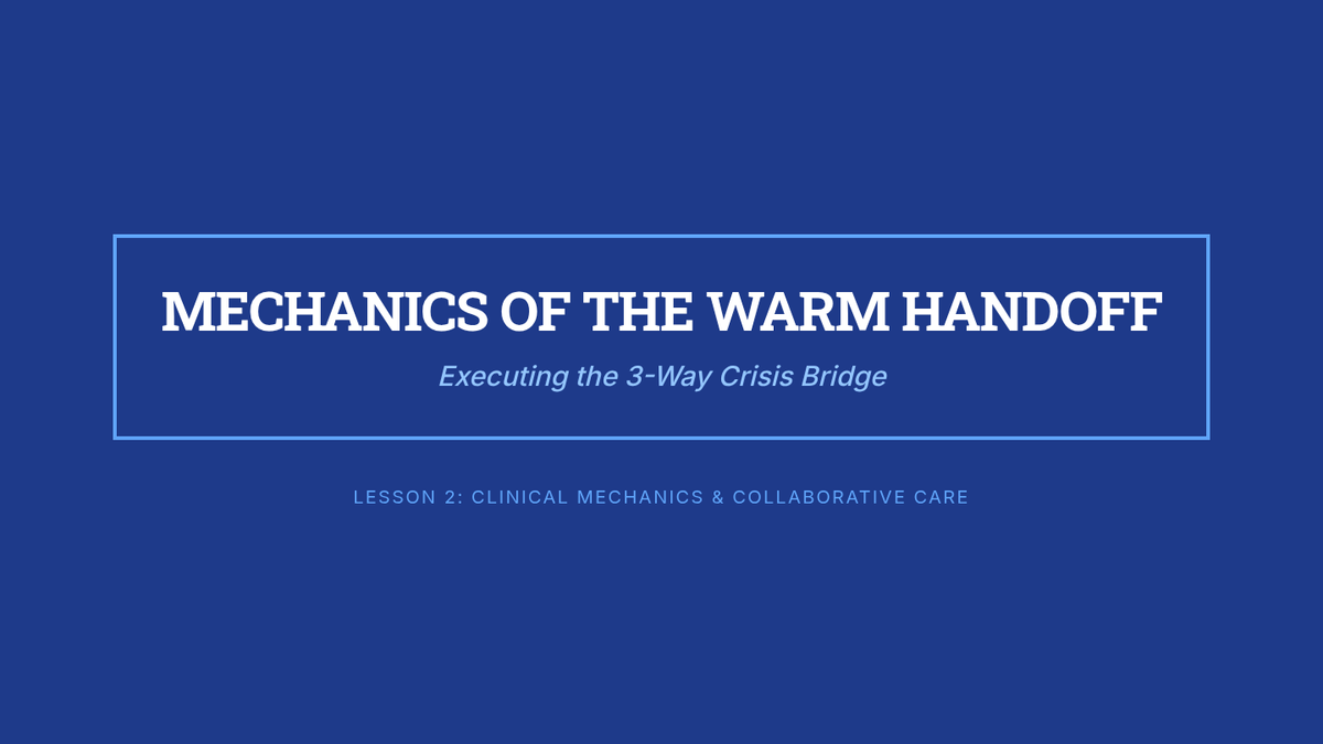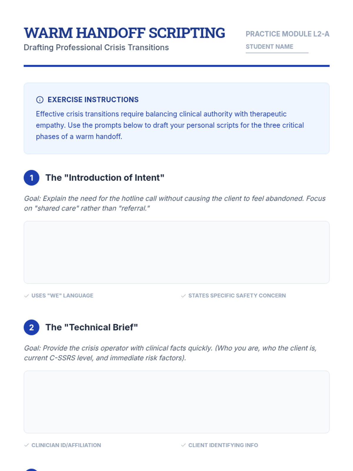 This graduate-level sequence prepares clinical students to effectively triage crises and manage hotline referrals. It covers lethality assessment, the technical mechanics of warm handoffs, involuntary intervention protocols, risk management documentation, and post-crisis therapeutic repair.