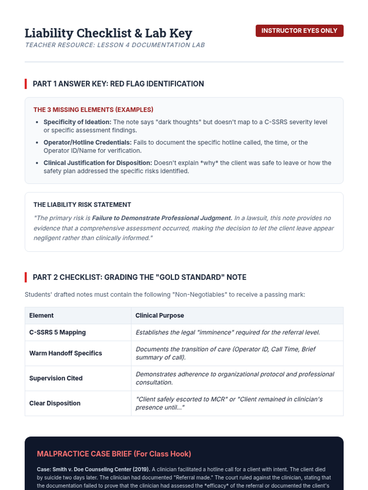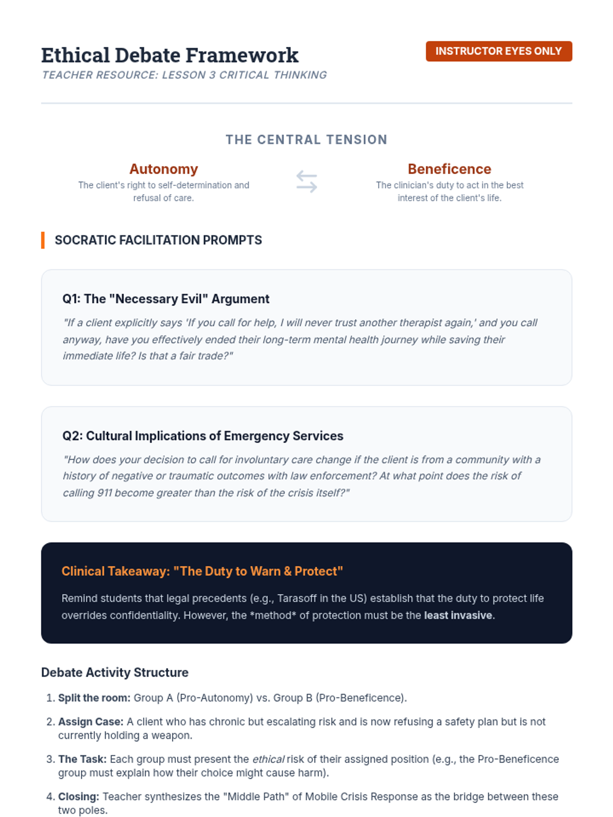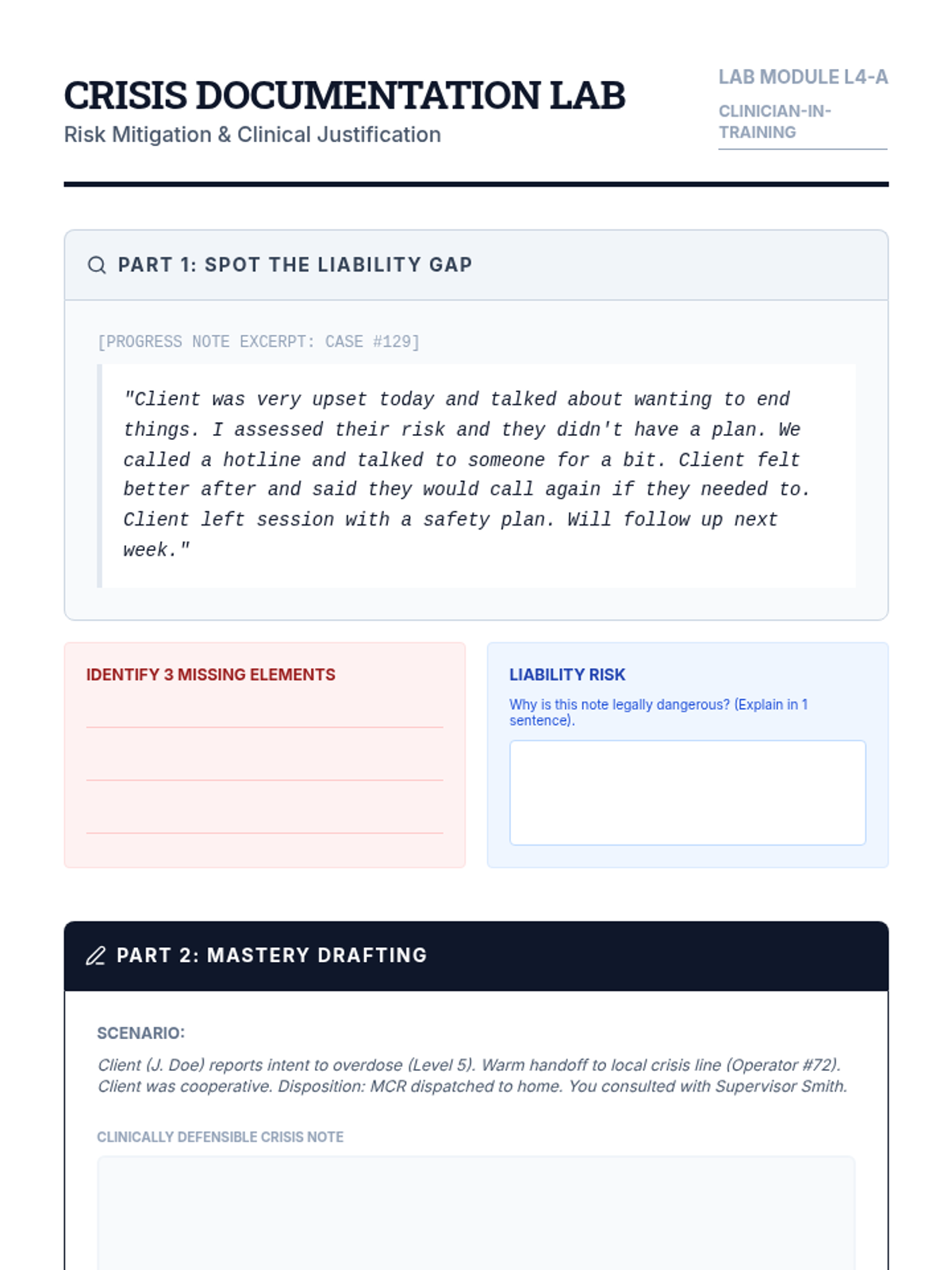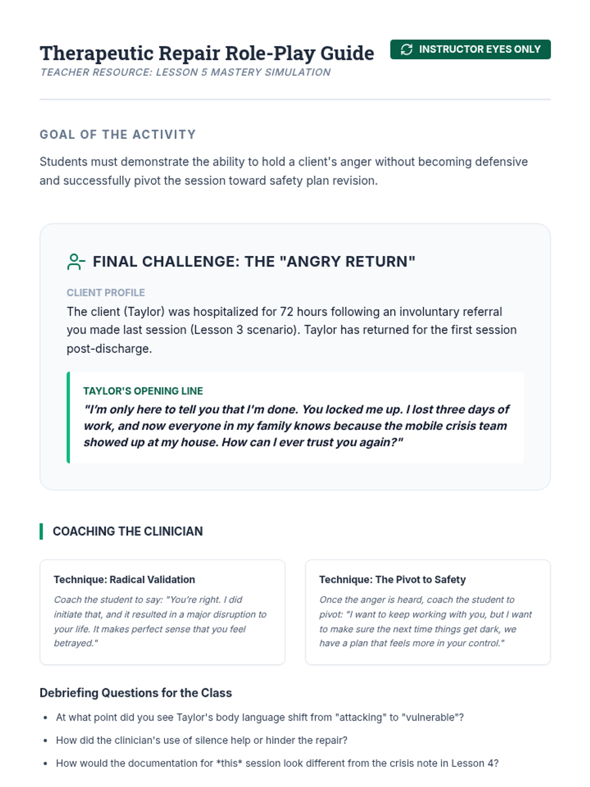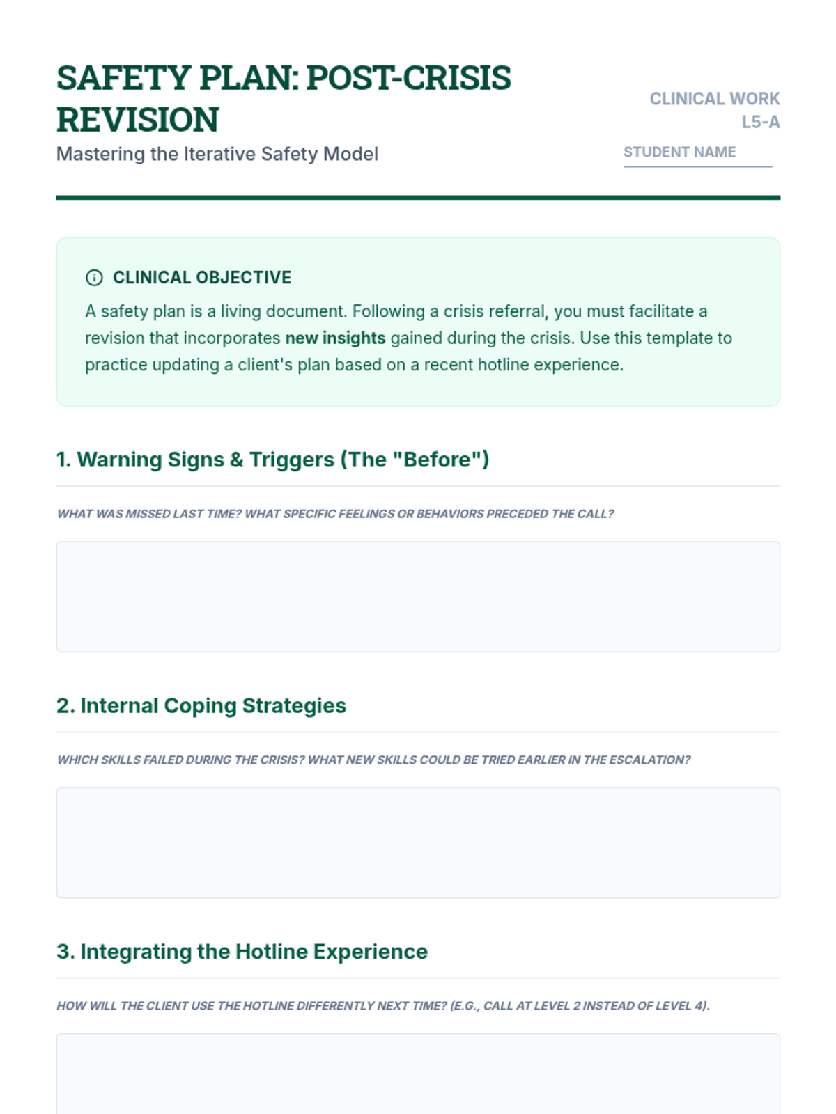 This graduate-level sequence prepares clinical students to effectively triage crises and manage hotline referrals. It covers lethality assessment, the technical mechanics of warm handoffs, involuntary intervention protocols, risk management documentation, and post-crisis therapeutic repair.