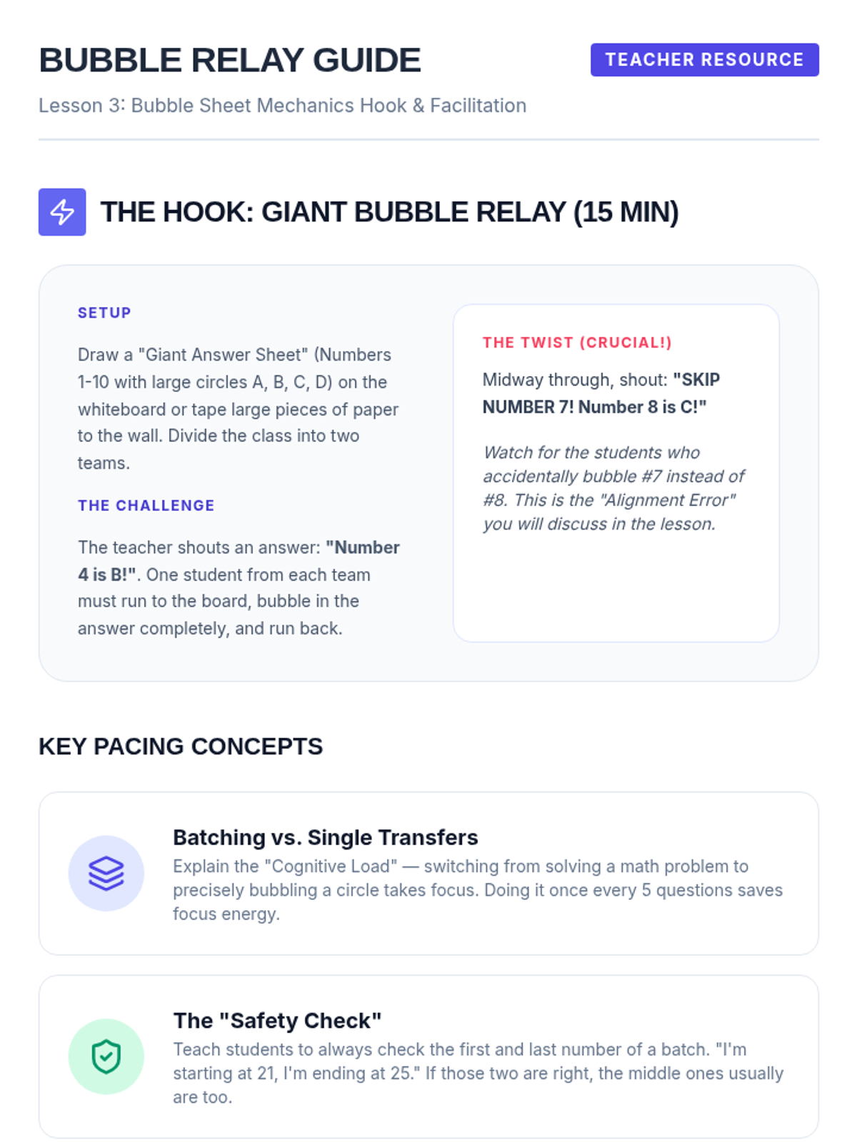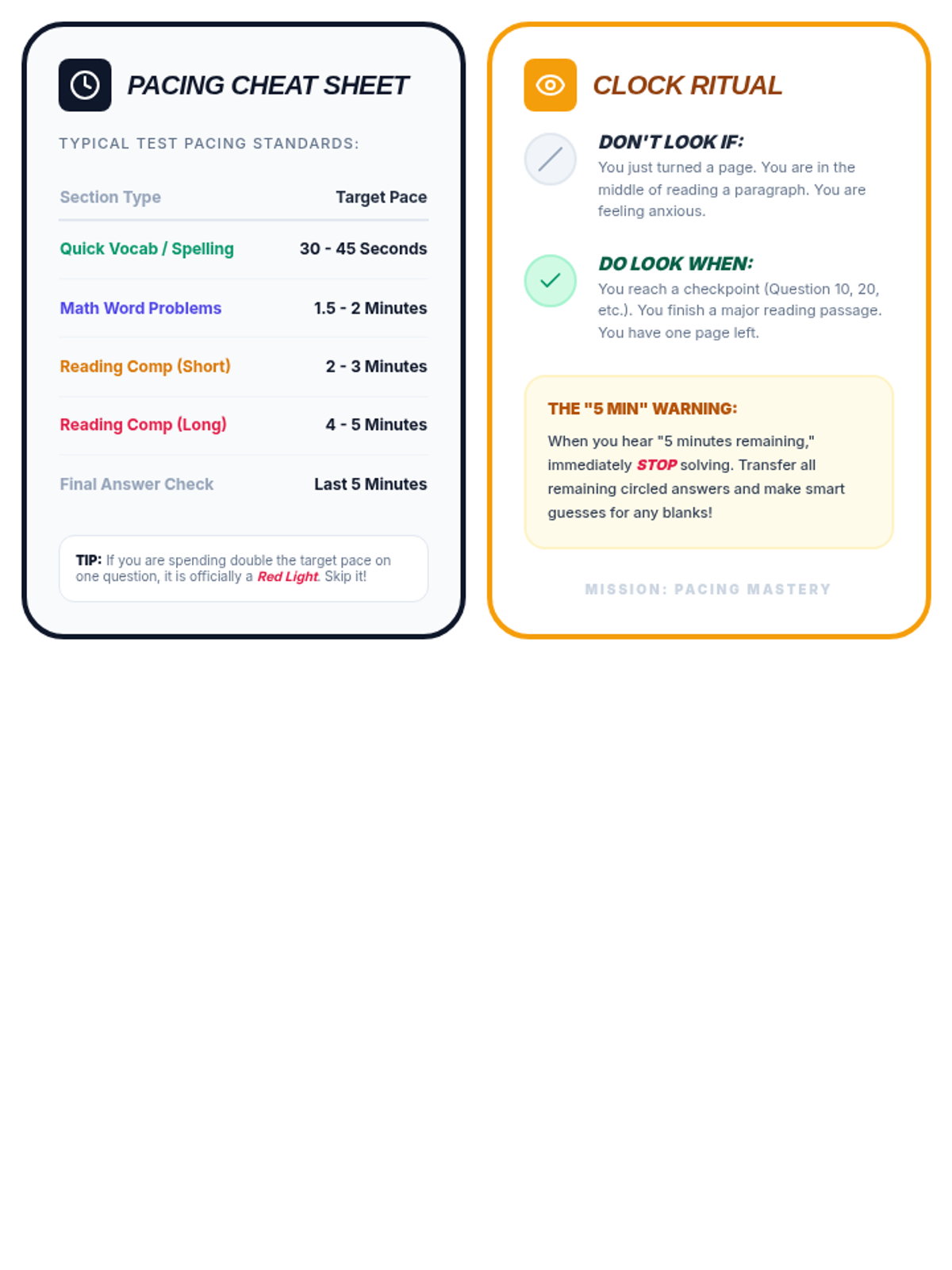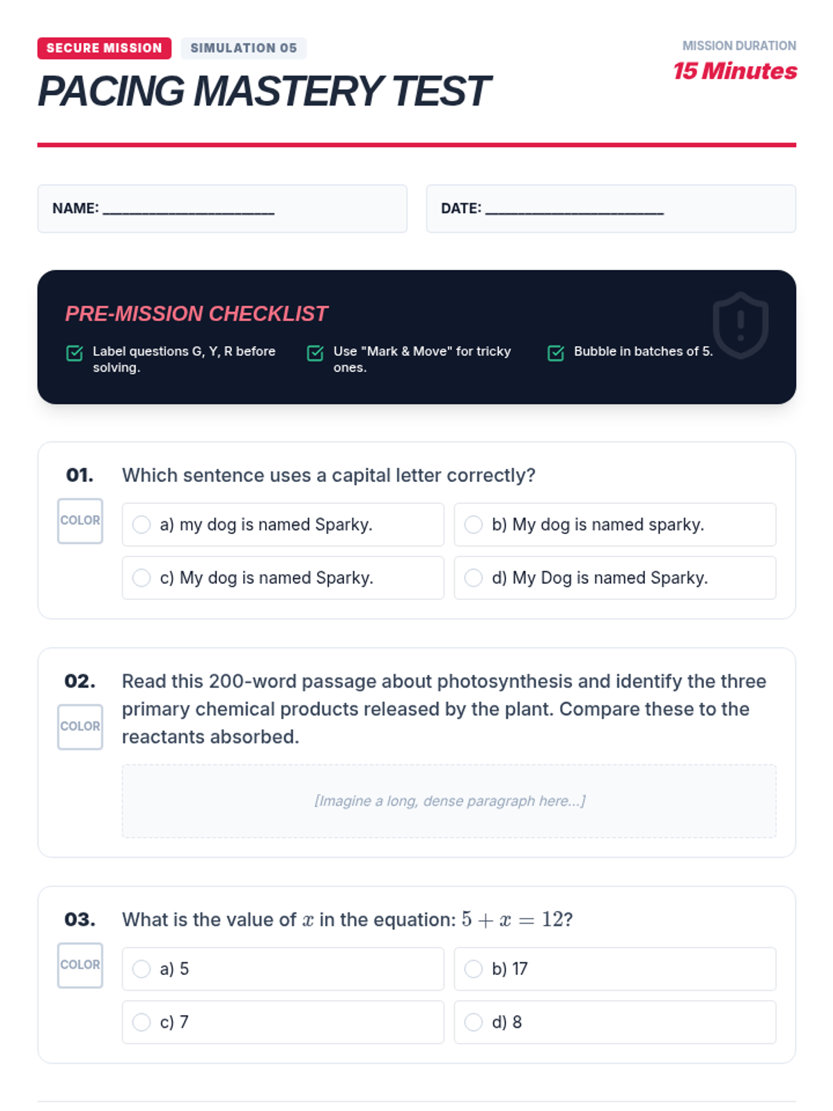 A comprehensive sequence for 6th-grade ESL students focusing on time management and pacing strategies for standardized testing. Students learn to triage questions, manage anxiety when stuck, master bubble sheet mechanics, and monitor their progress against the clock.
