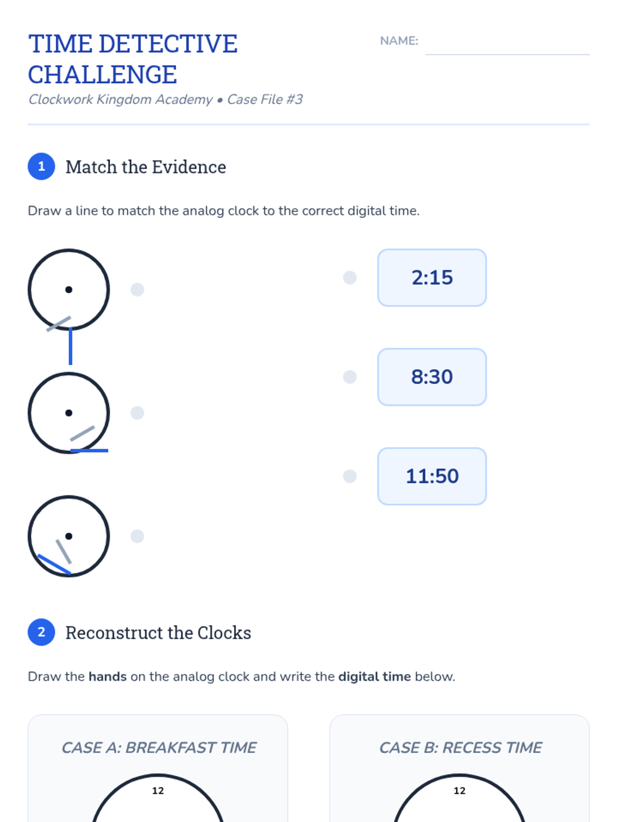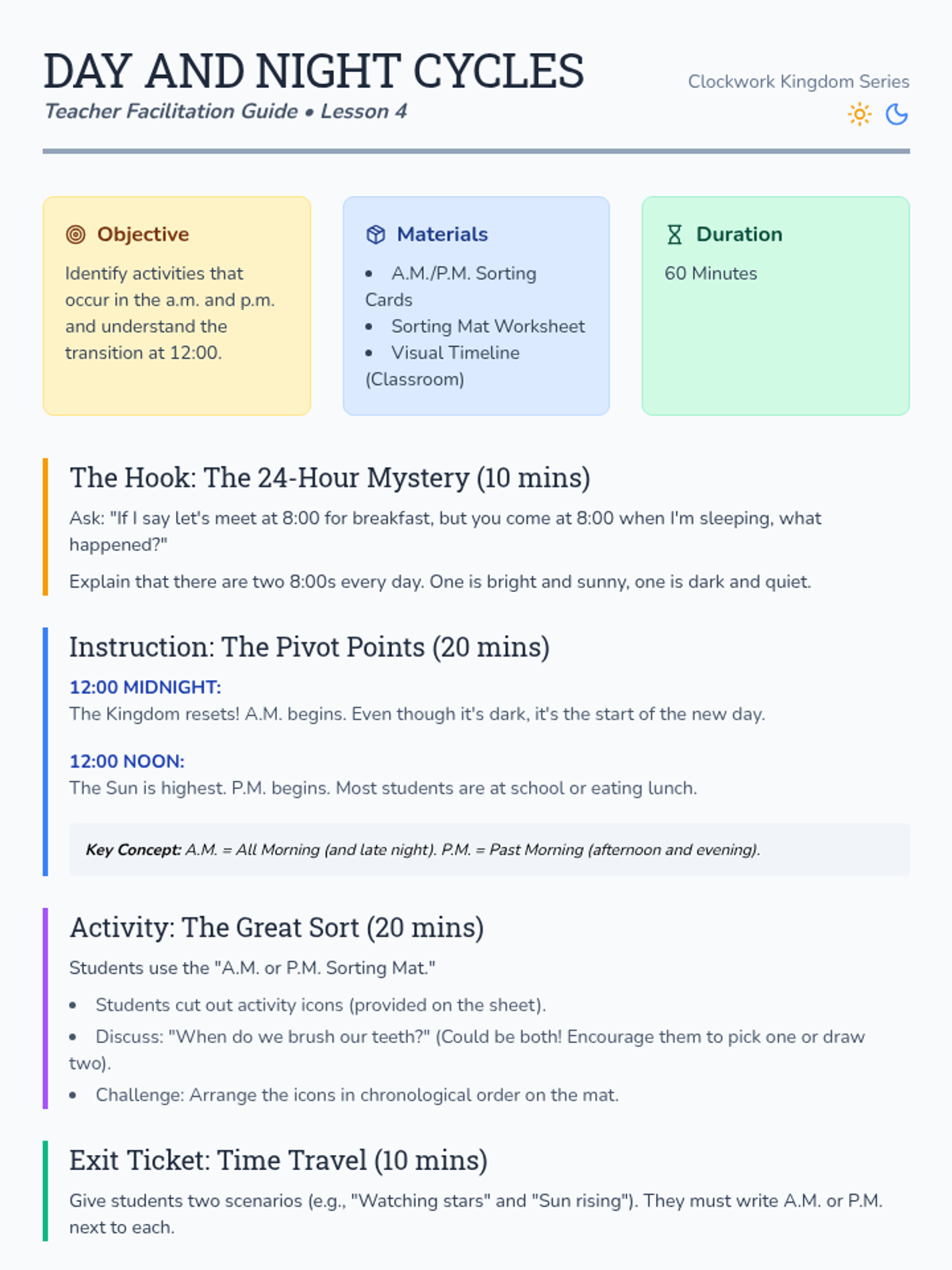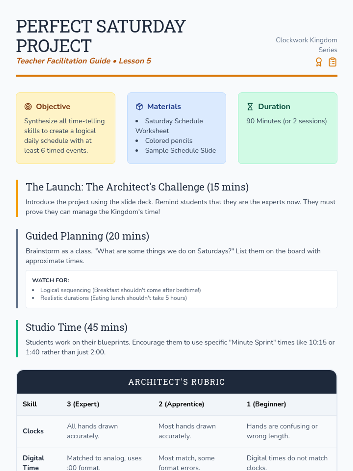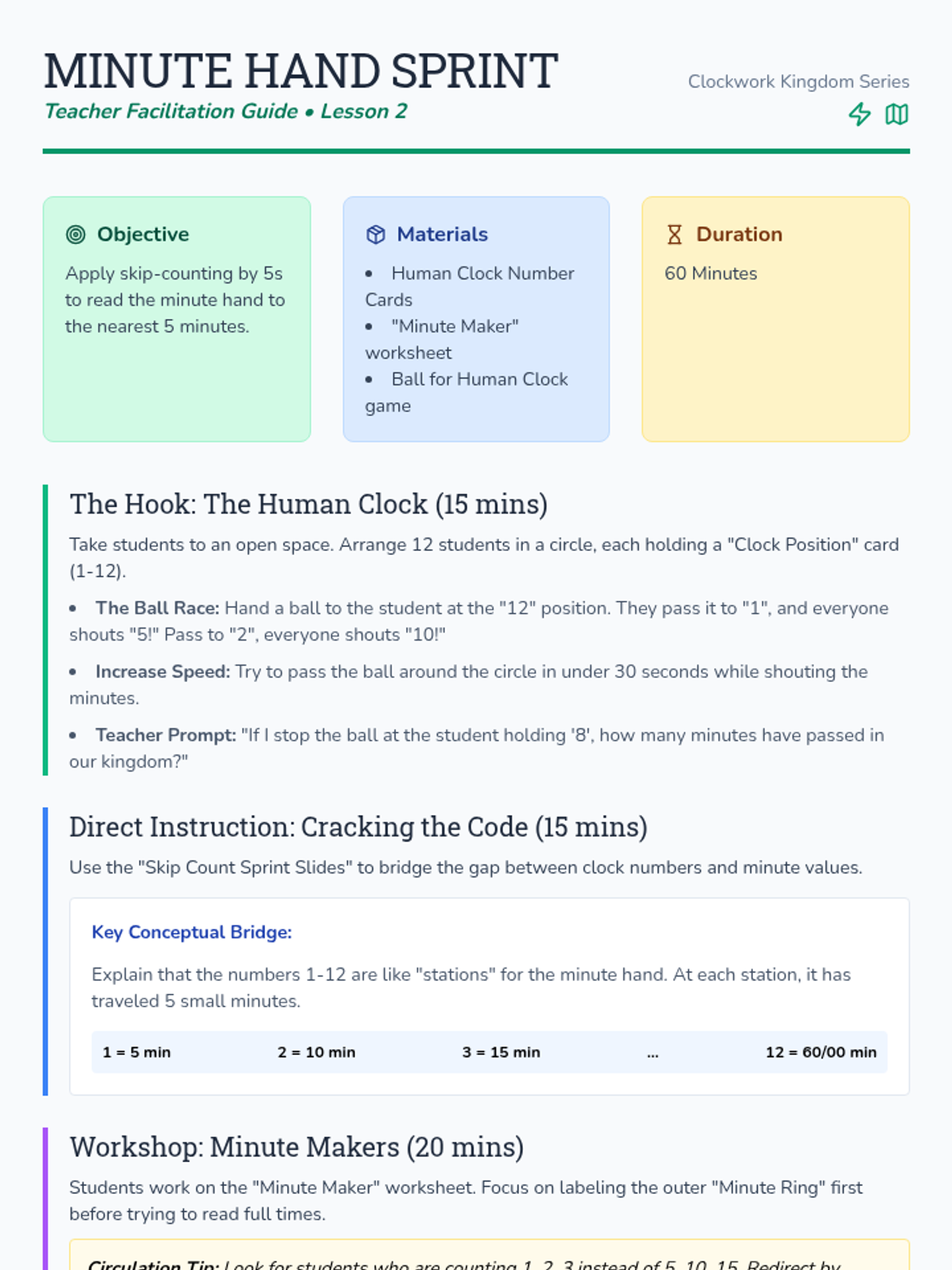 A comprehensive 2nd Grade unit on telling time to the nearest five minutes, distinguishing between a.m. and p.m., and sequencing daily events. Students explore the mechanics of analog and digital clocks through a whimsical 'Clockwork Kingdom' theme.