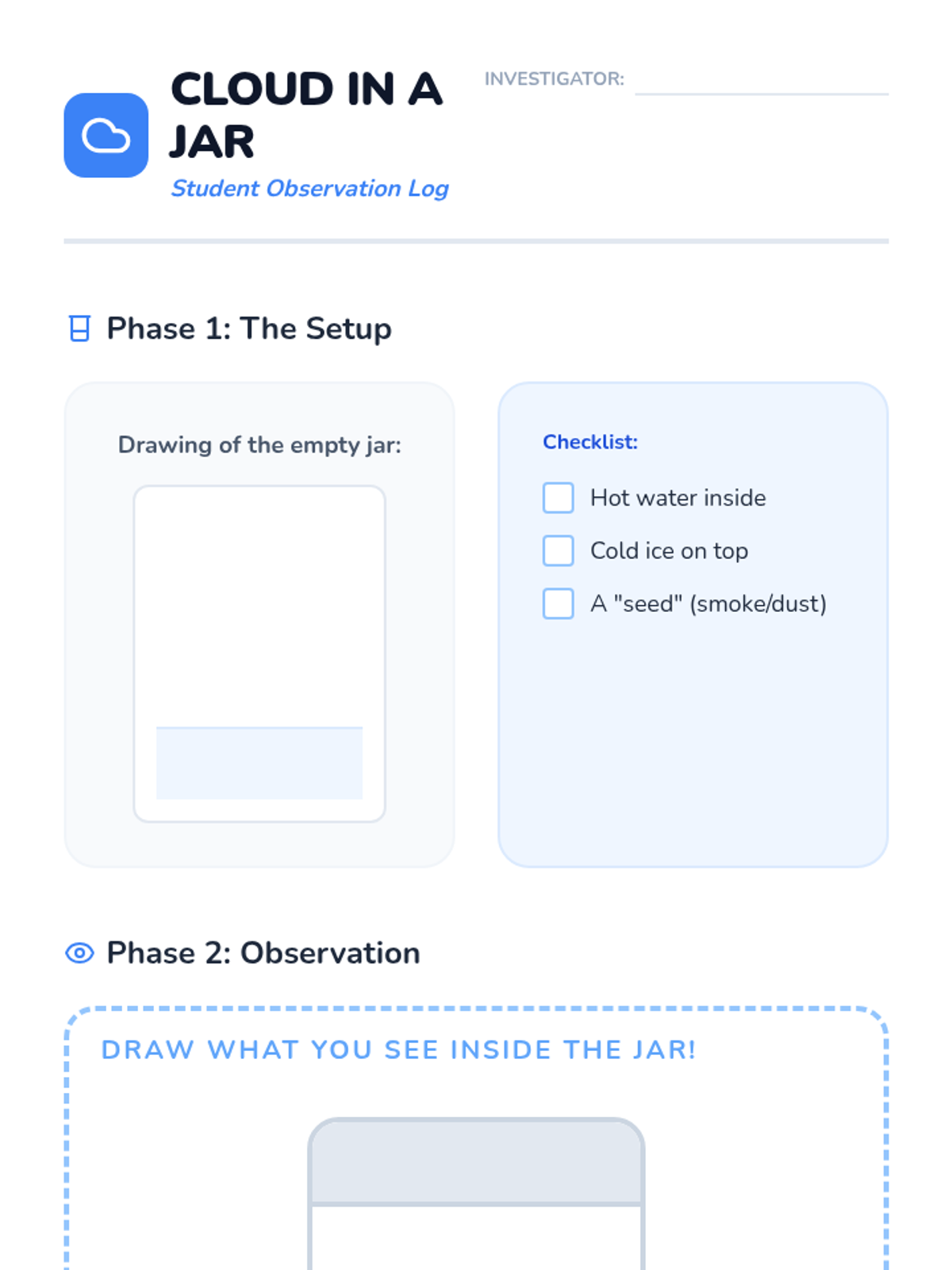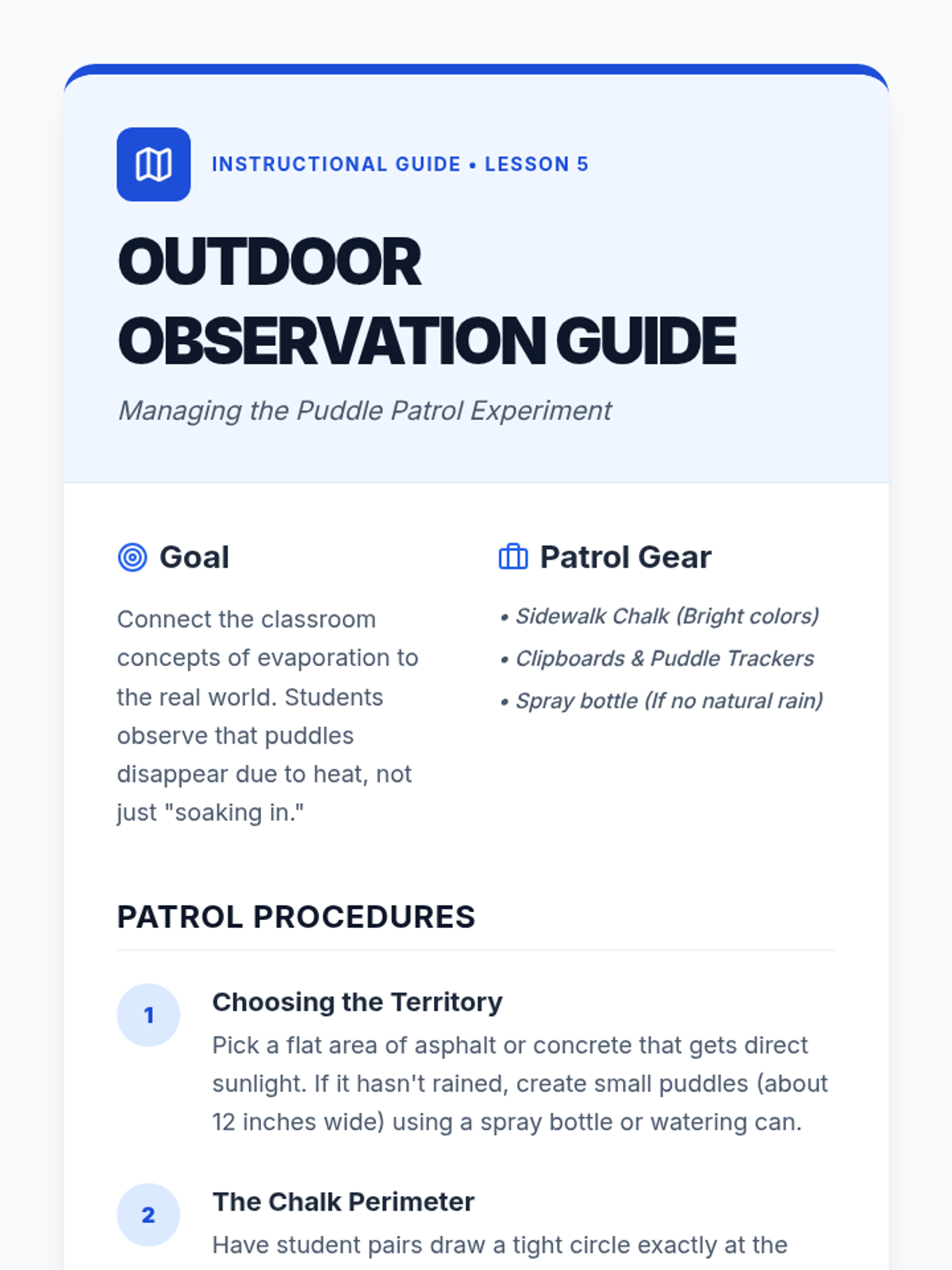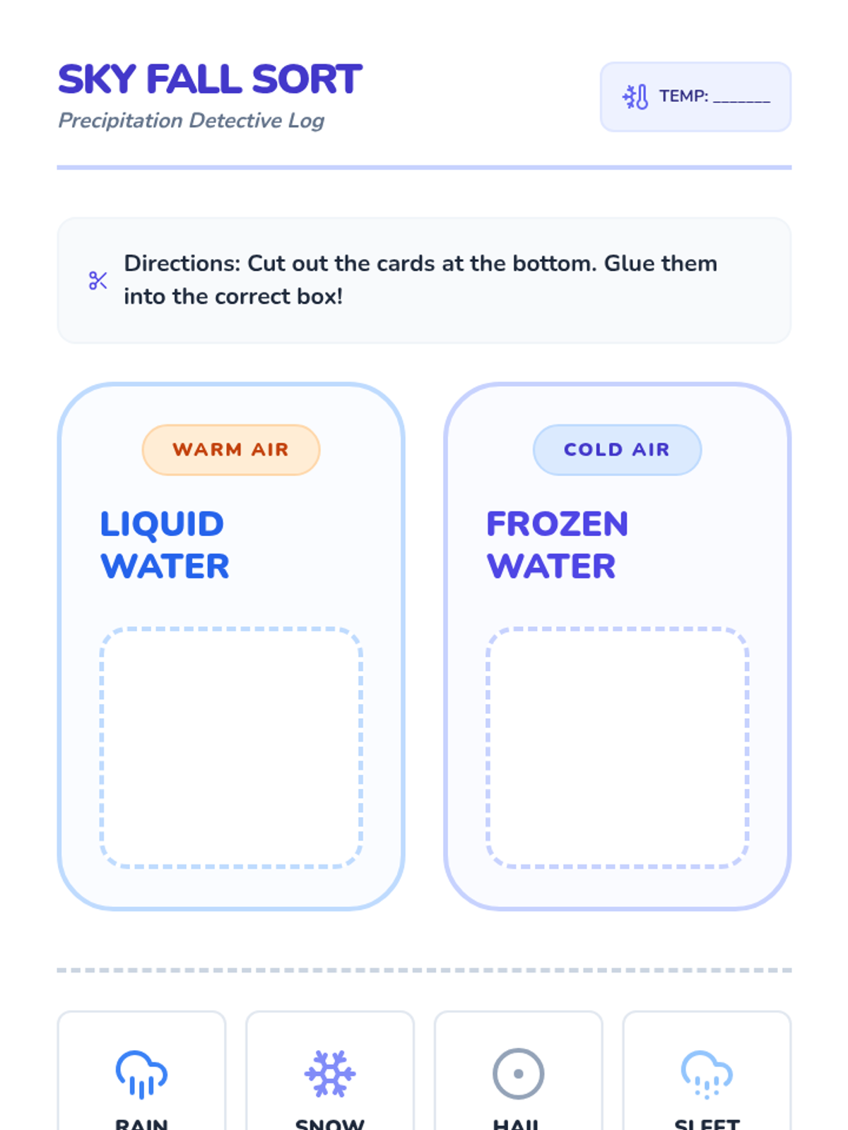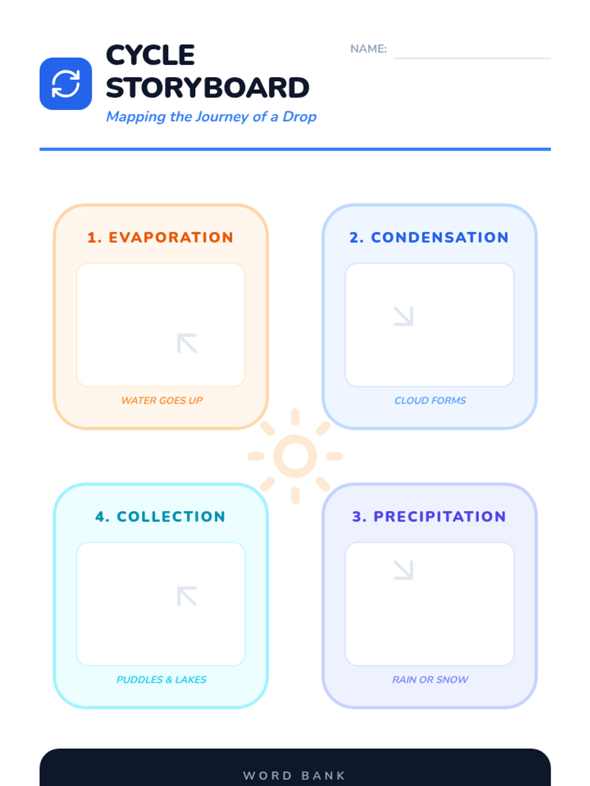 A hands-on investigation into the life of a water drop. Students explore states of matter, simulate cloud formation, categorize precipitation, and trace the water cycle journey from puddles to the sky and back.