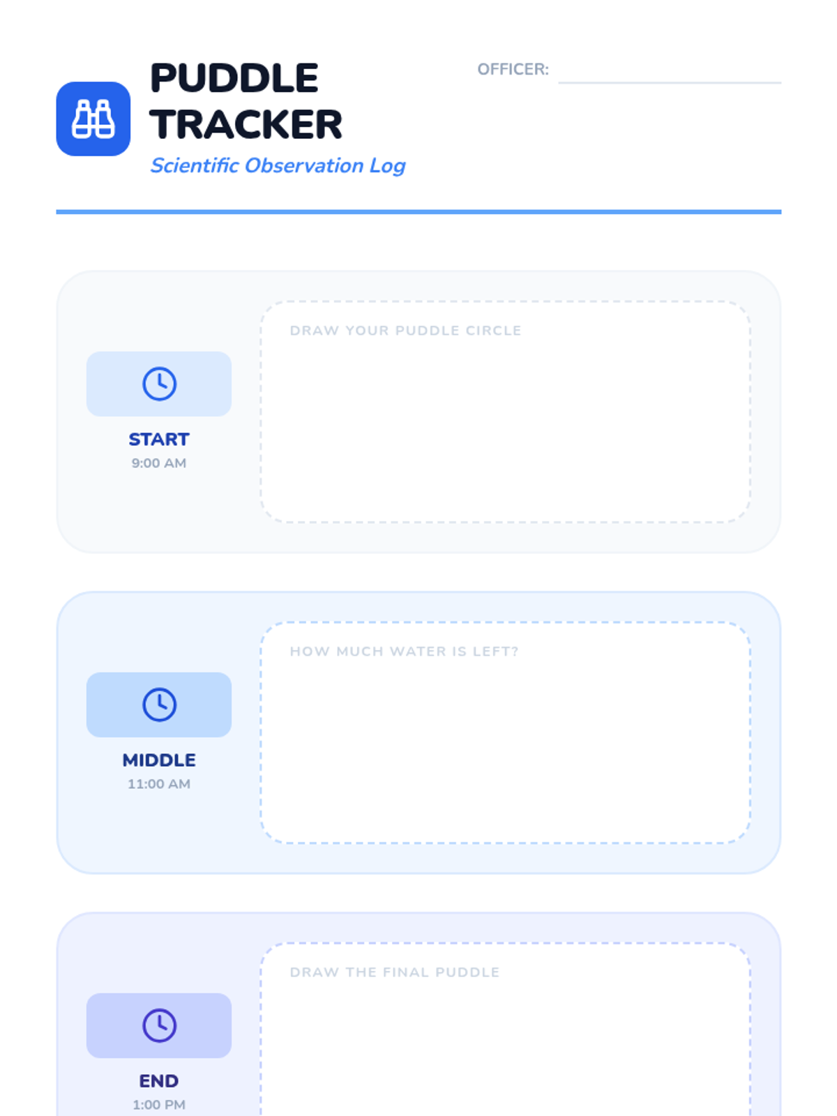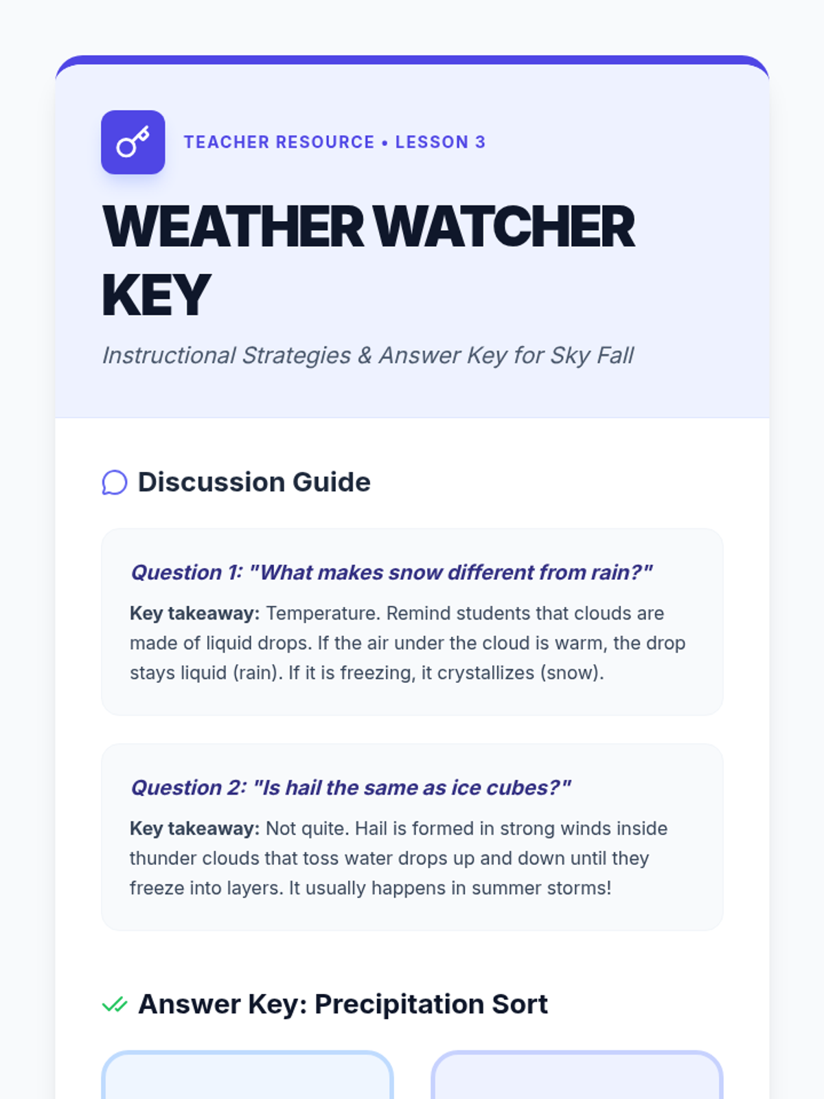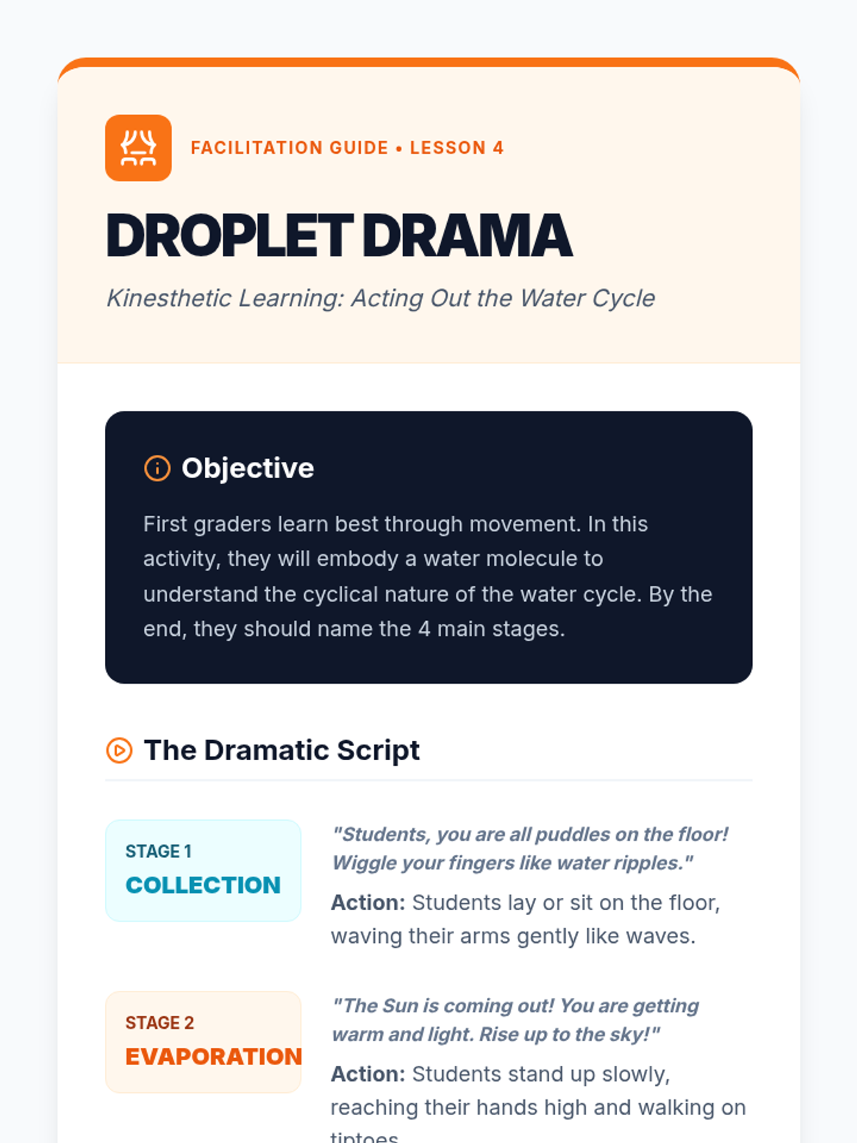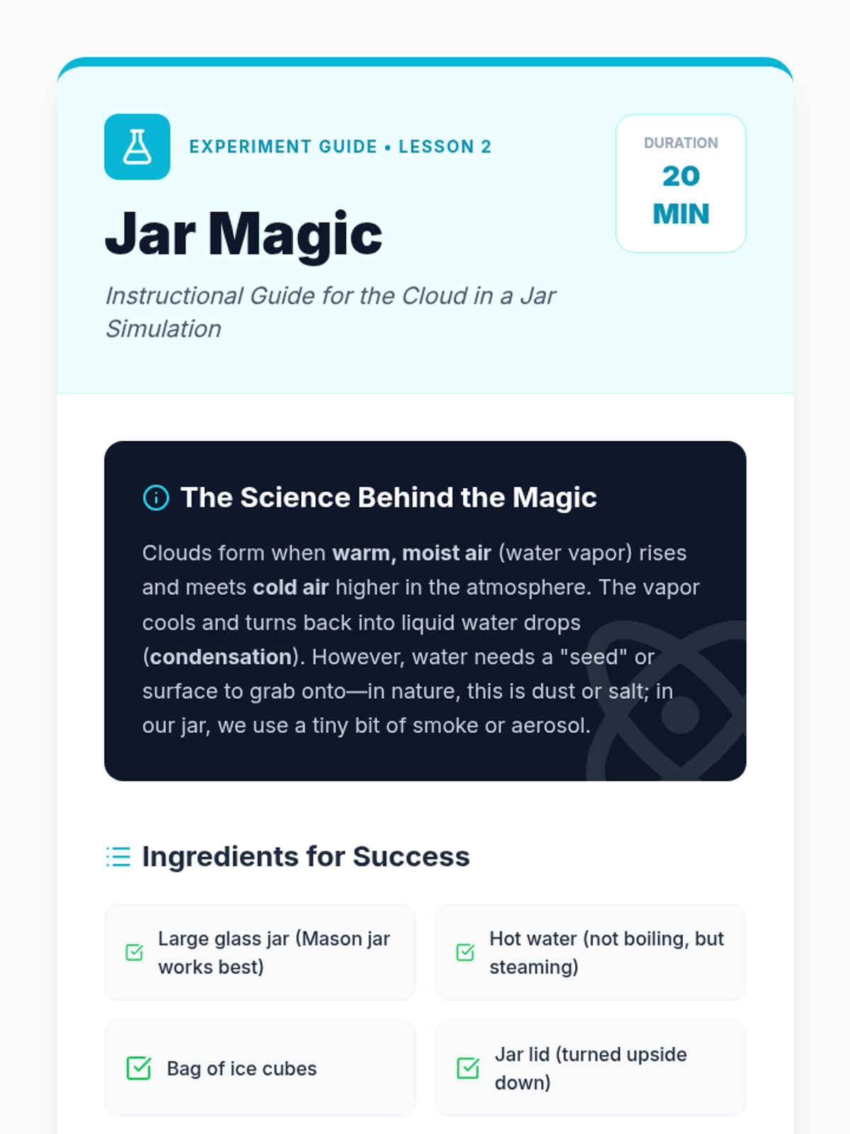 A hands-on investigation into the life of a water drop. Students explore states of matter, simulate cloud formation, categorize precipitation, and trace the water cycle journey from puddles to the sky and back.