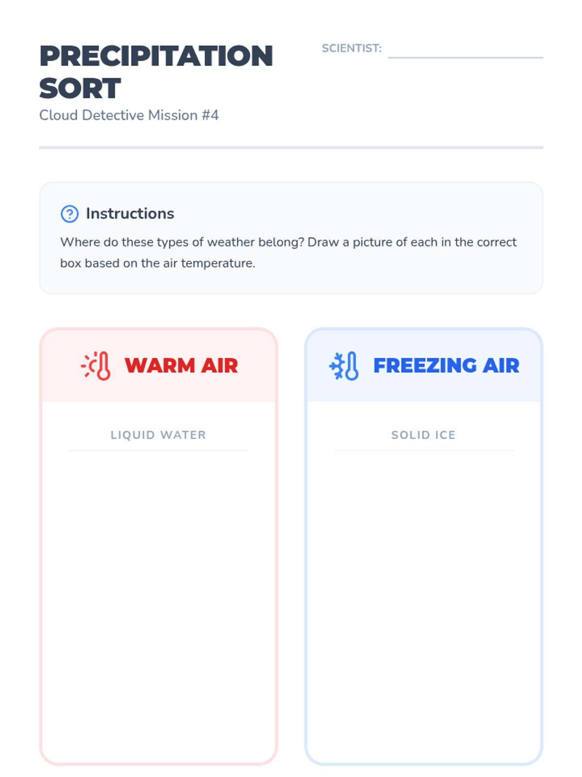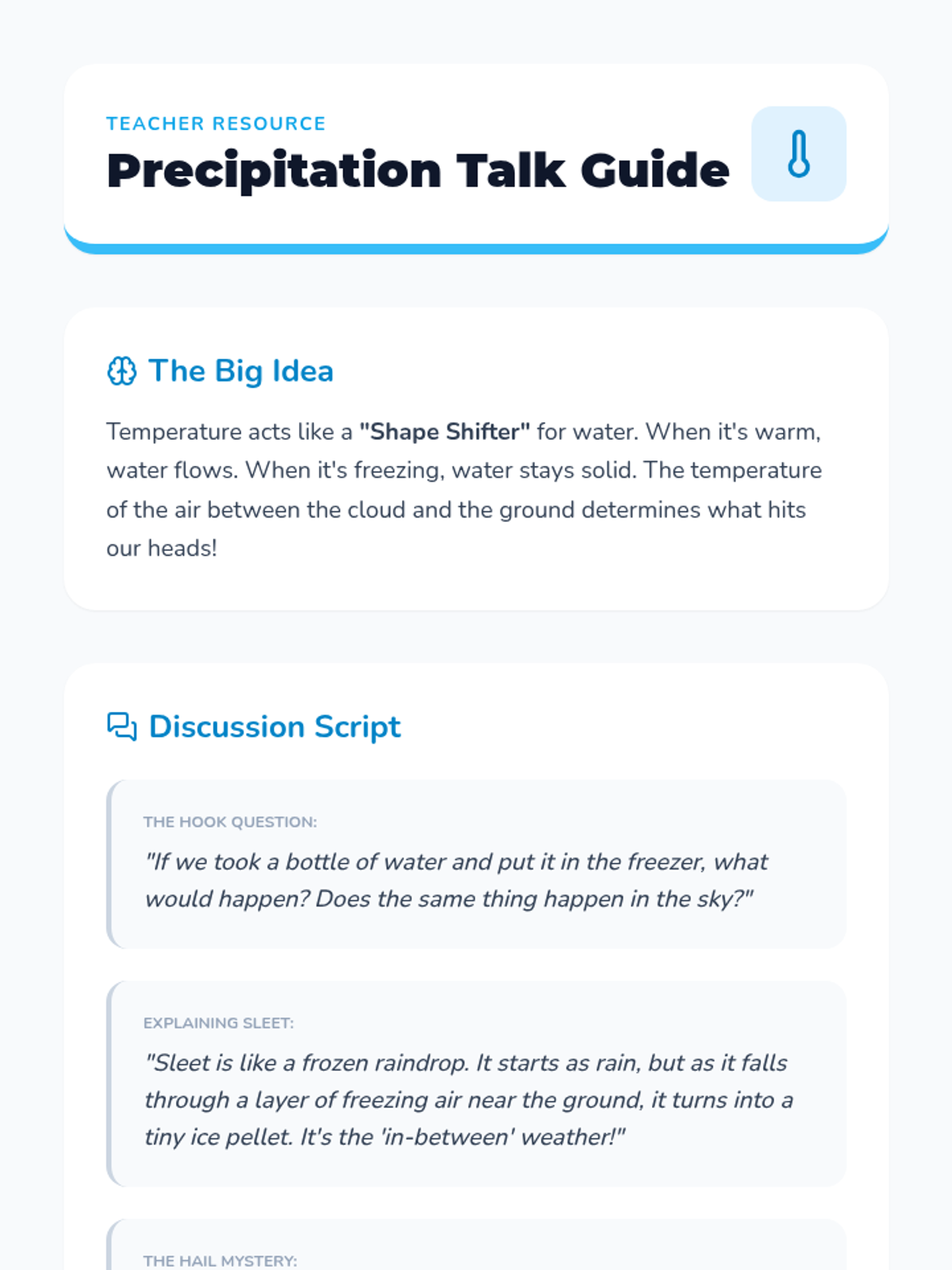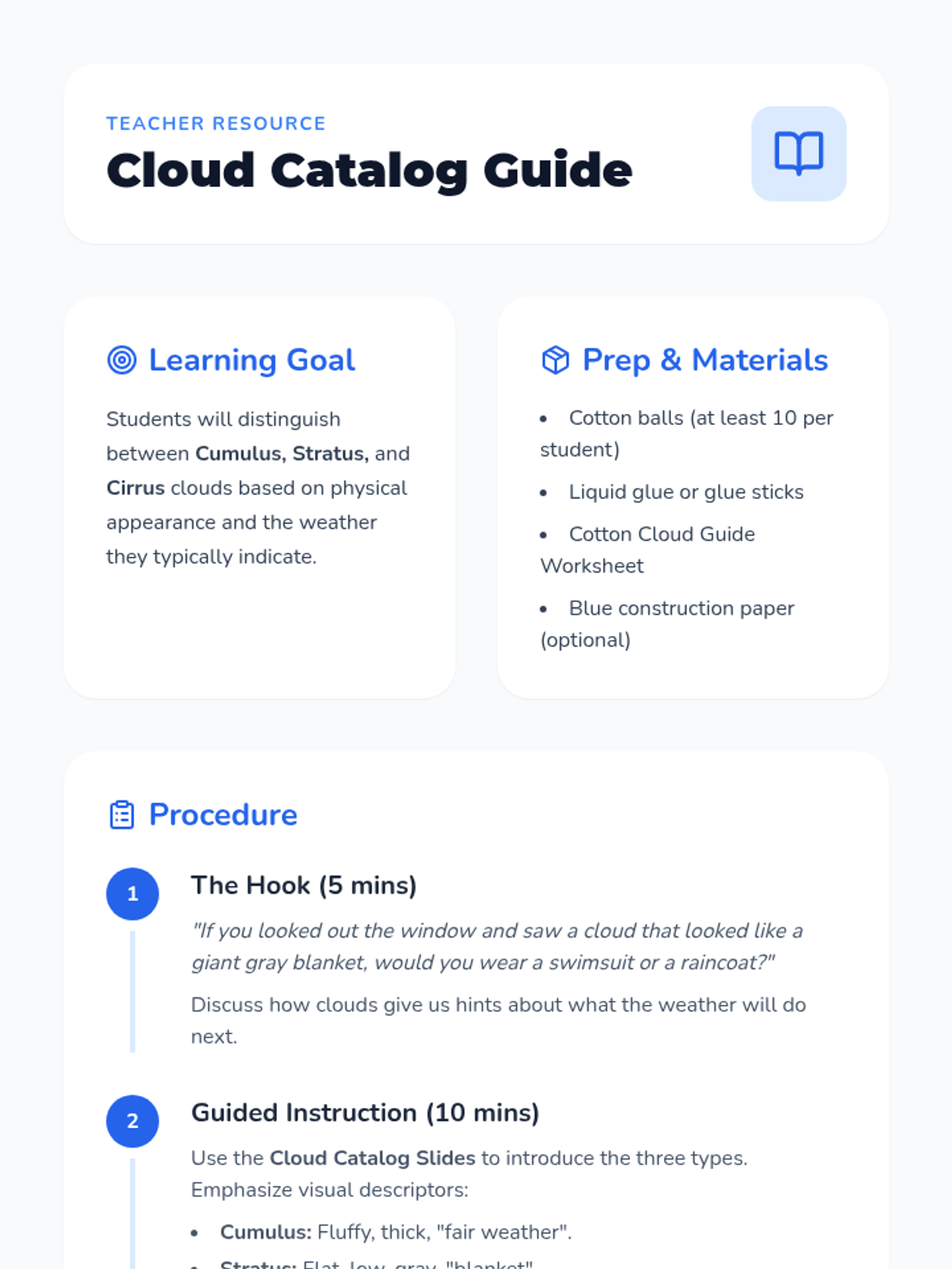 This inquiry-based sequence guides 2nd-grade students through observing clouds and understanding the water cycle. Students will identify cloud types, model precipitation, explore the water cycle, differentiate forms of falling water, and predict weather based on sky conditions.