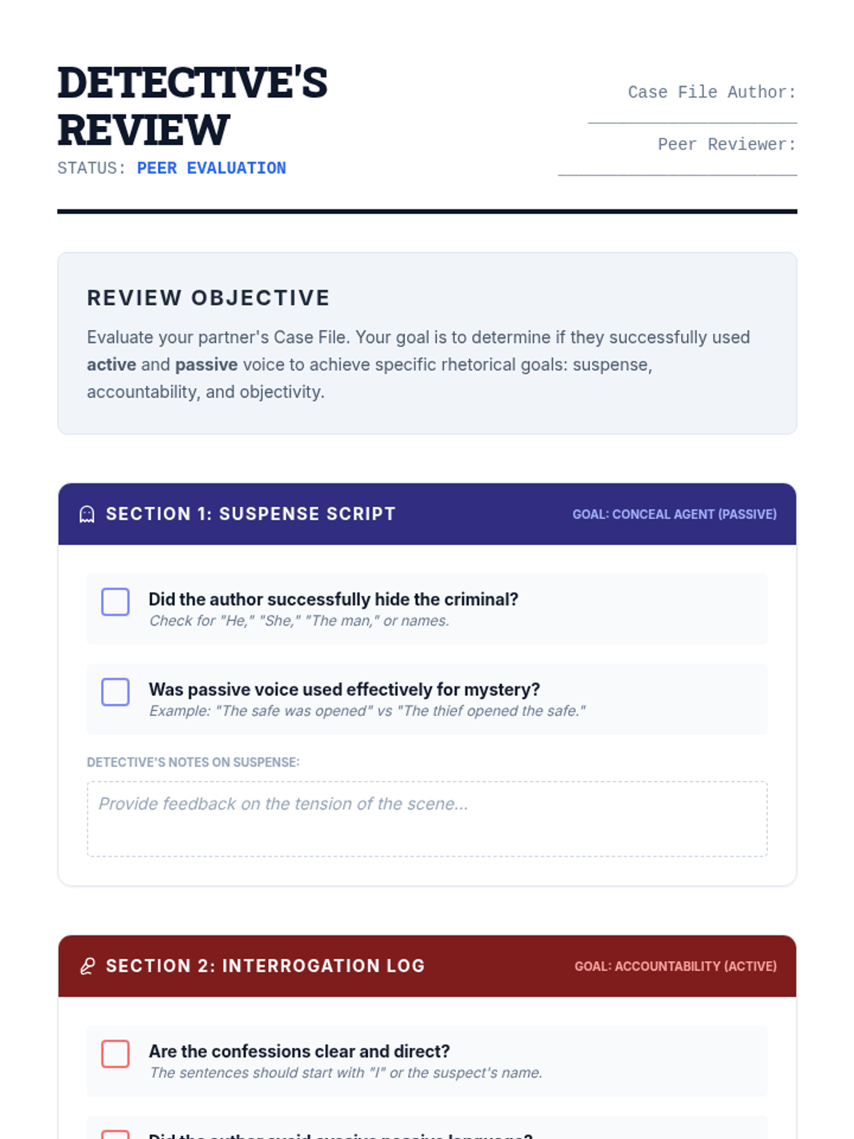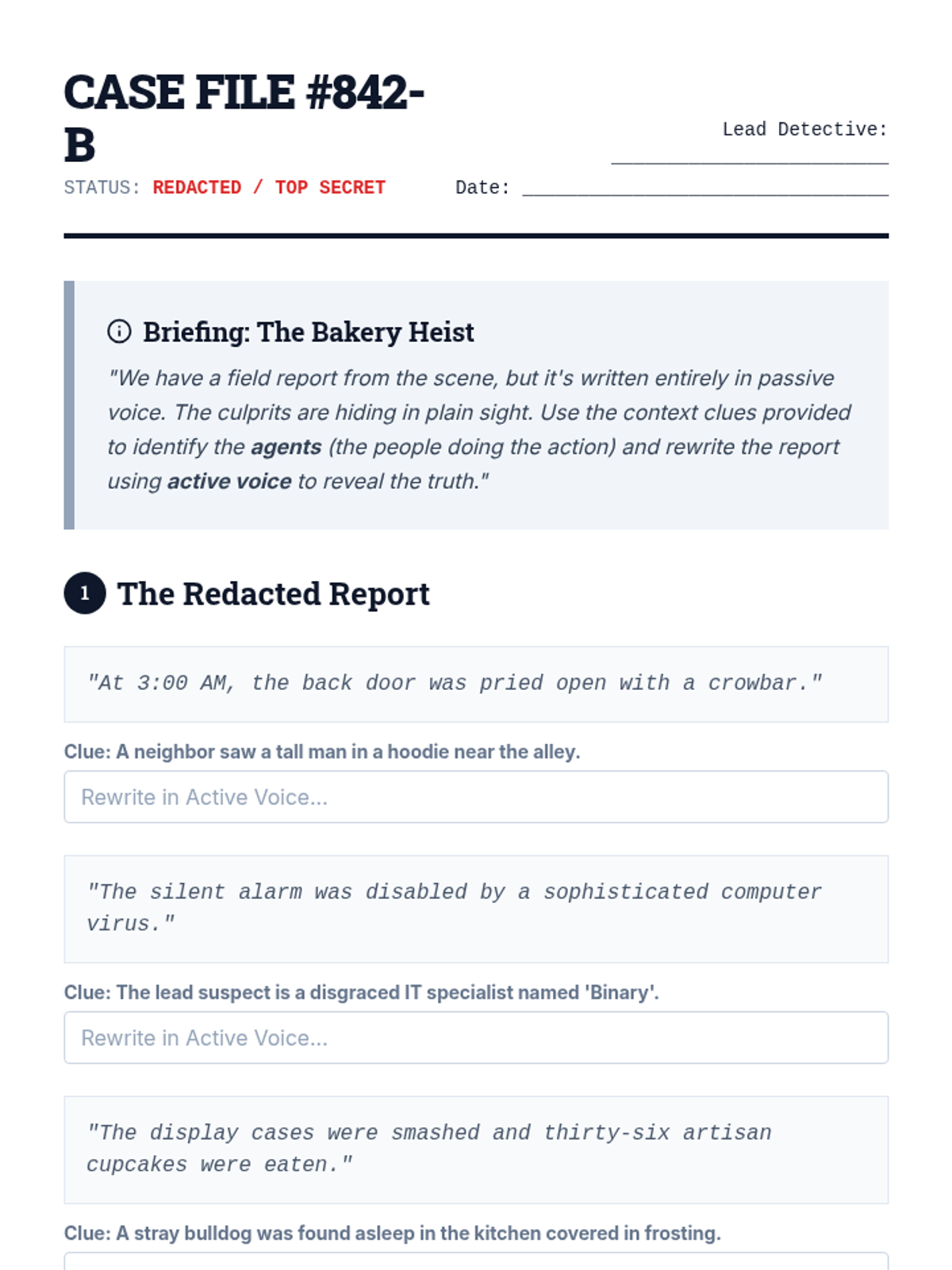 An immersive 8th-grade writing sequence exploring active and passive voice through a mystery-detective lens. Students learn to use active voice for clarity and passive voice for intentional ambiguity and technical objectivity.