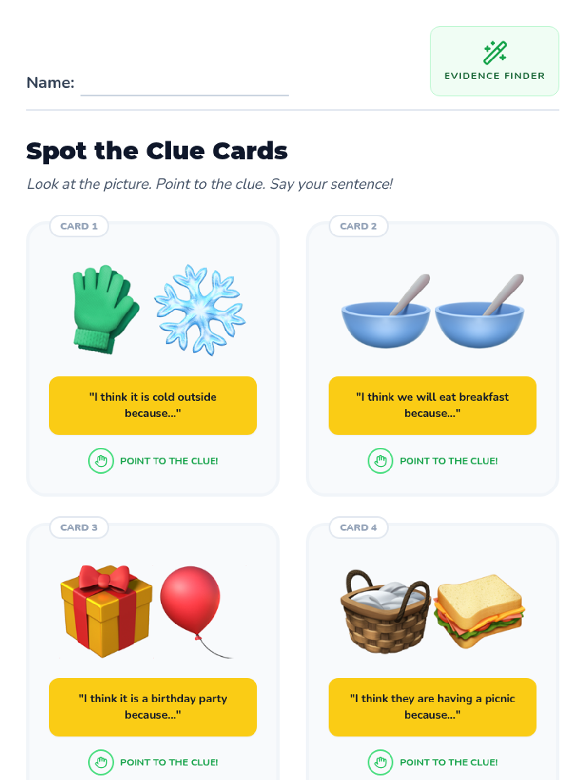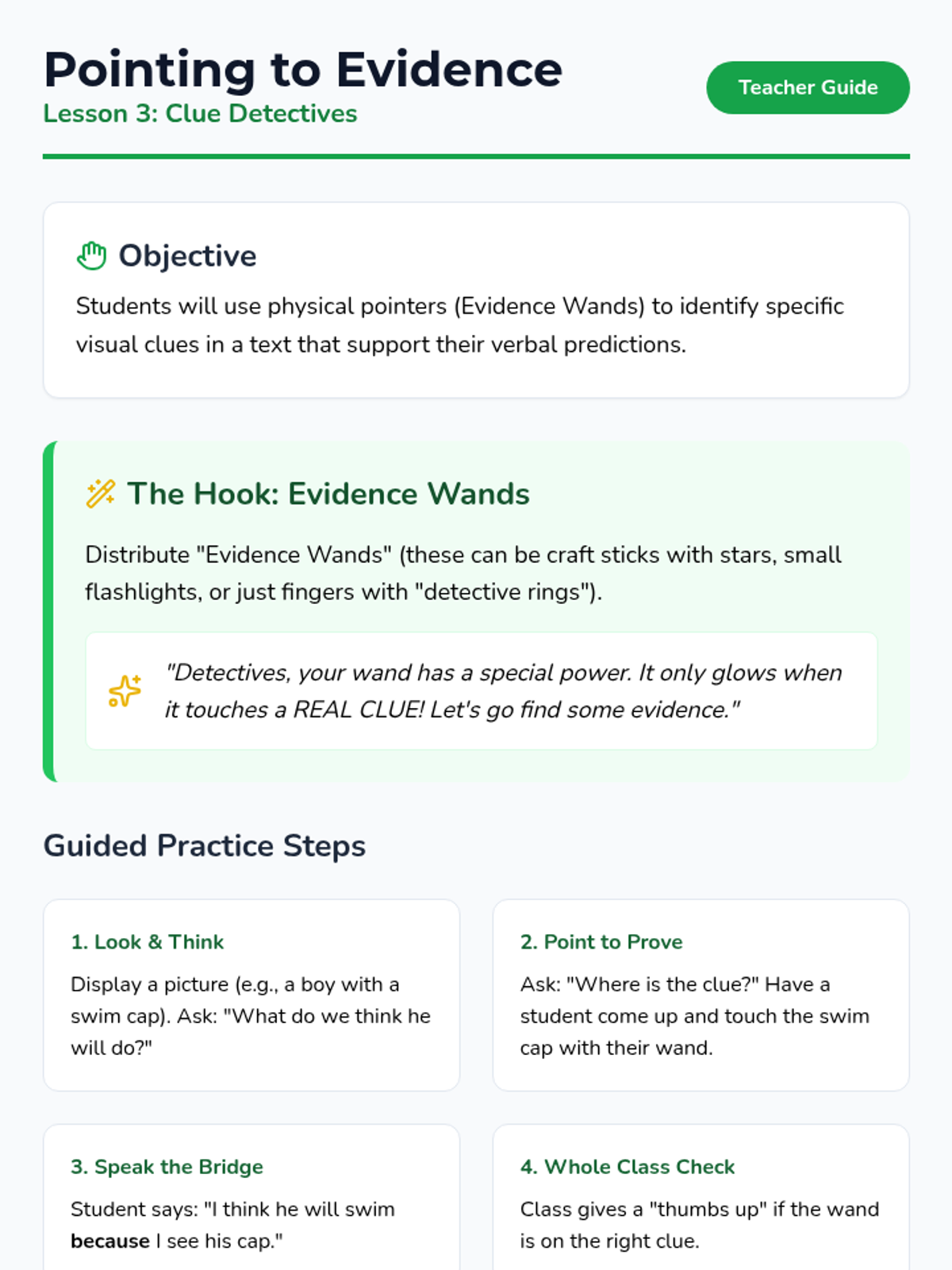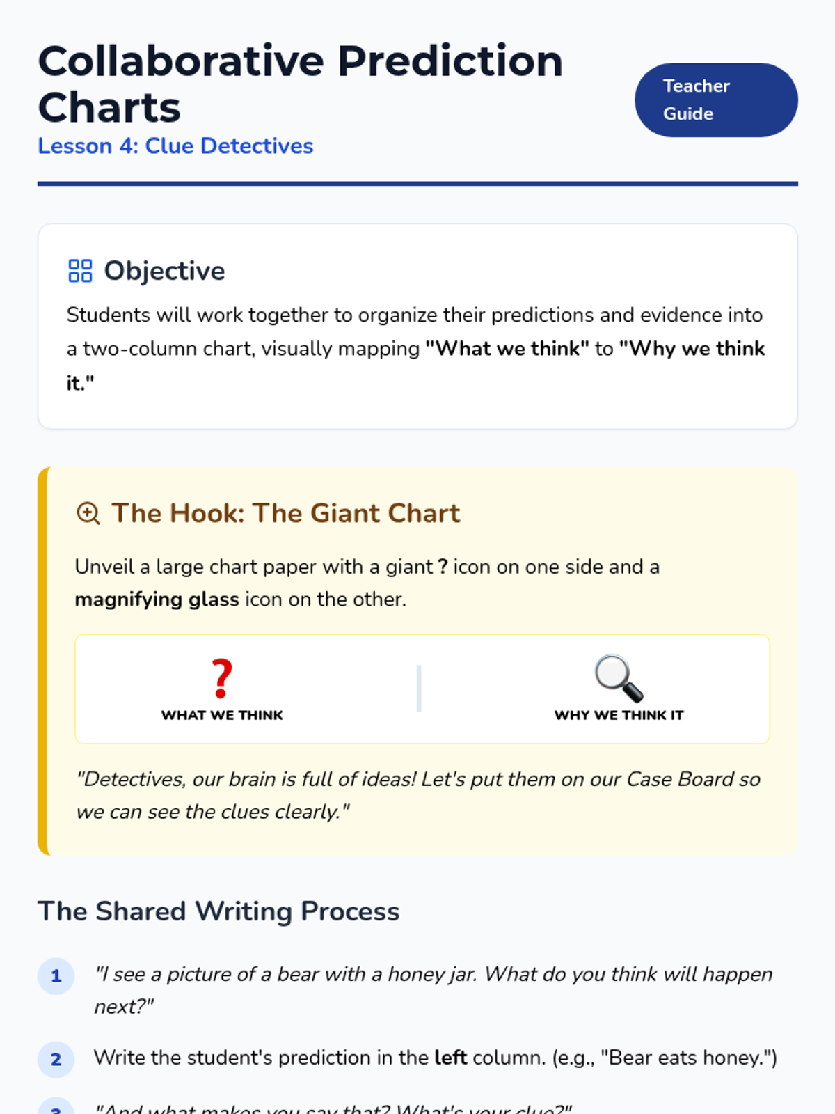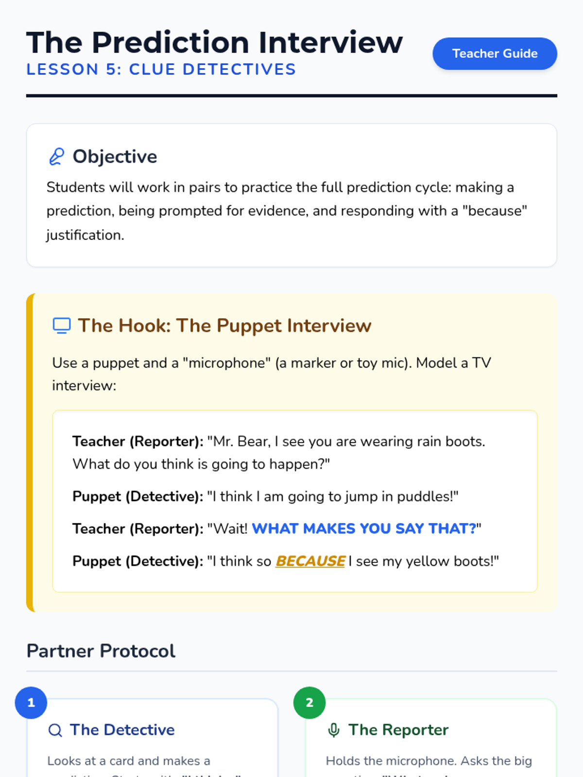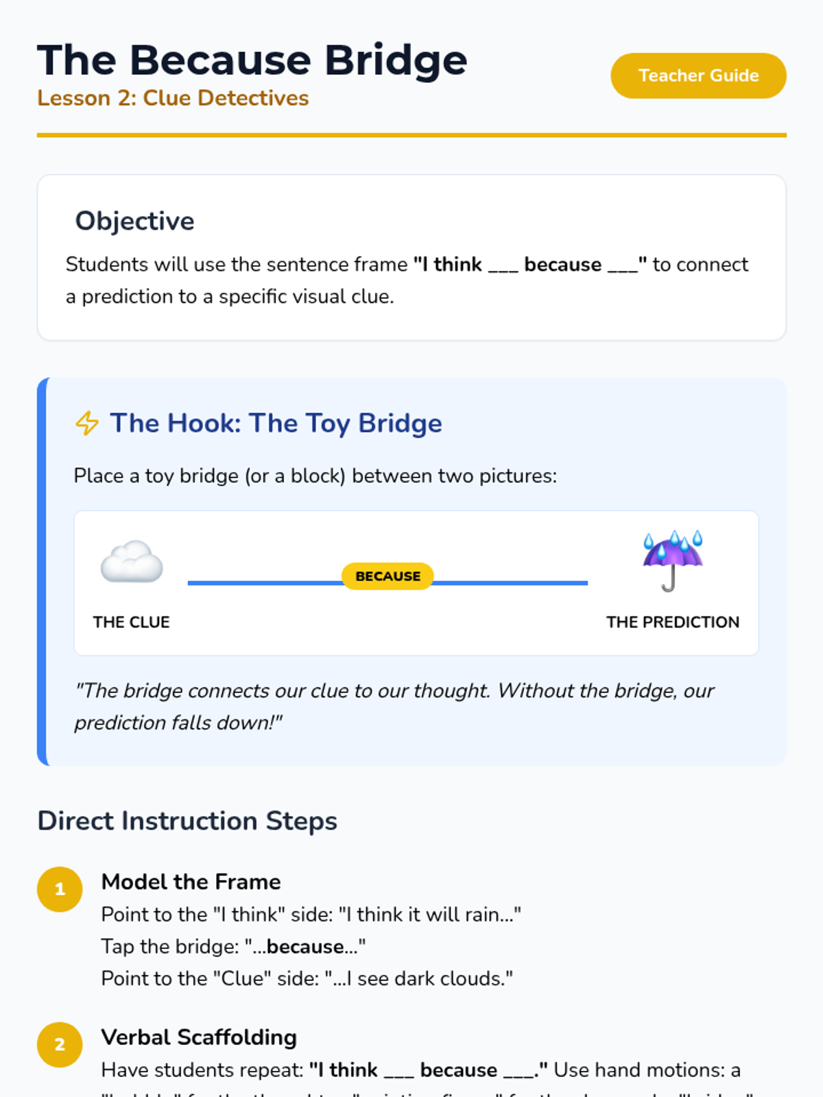 A Kindergarten sequence focused on teaching special education students how to make predictions using the 'because' bridge to connect thoughts to evidence. Students transition from wild guessing to substantiated predictions using visual aids and sentence frames.