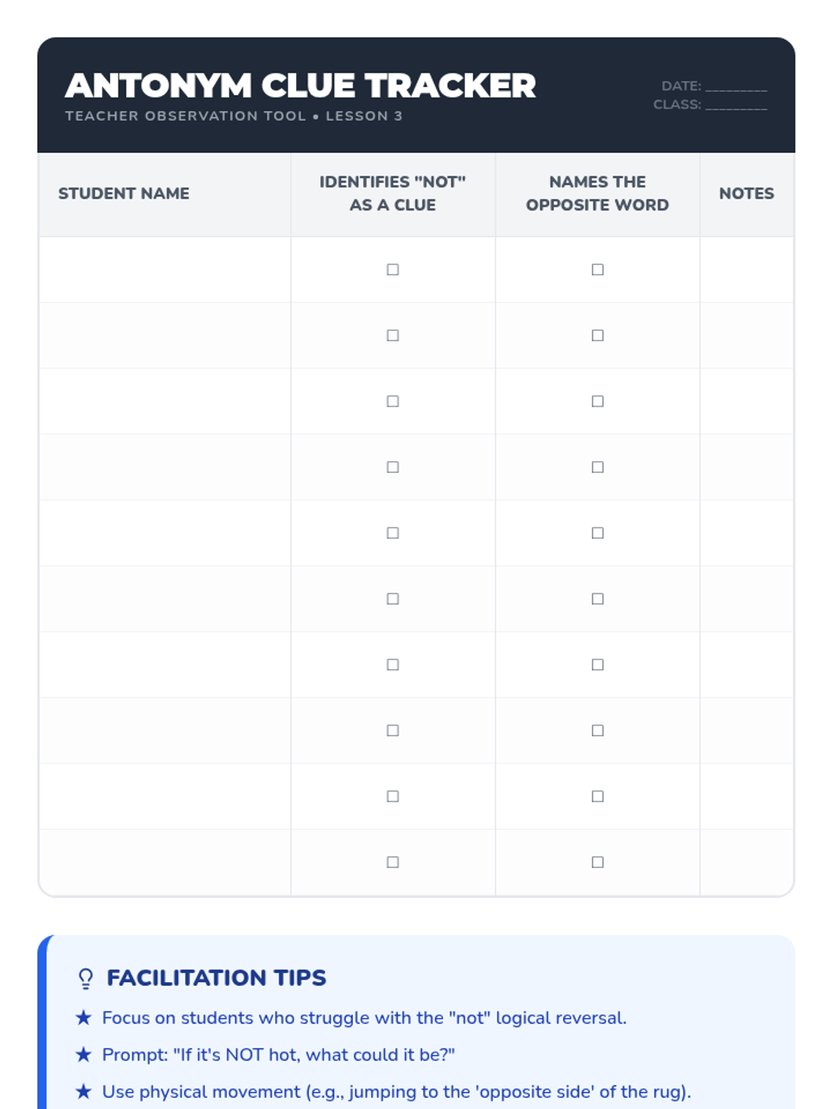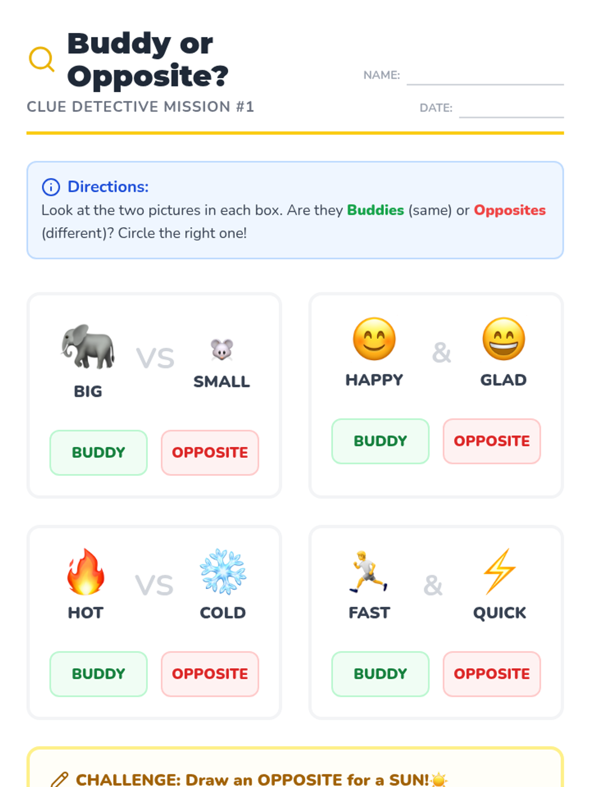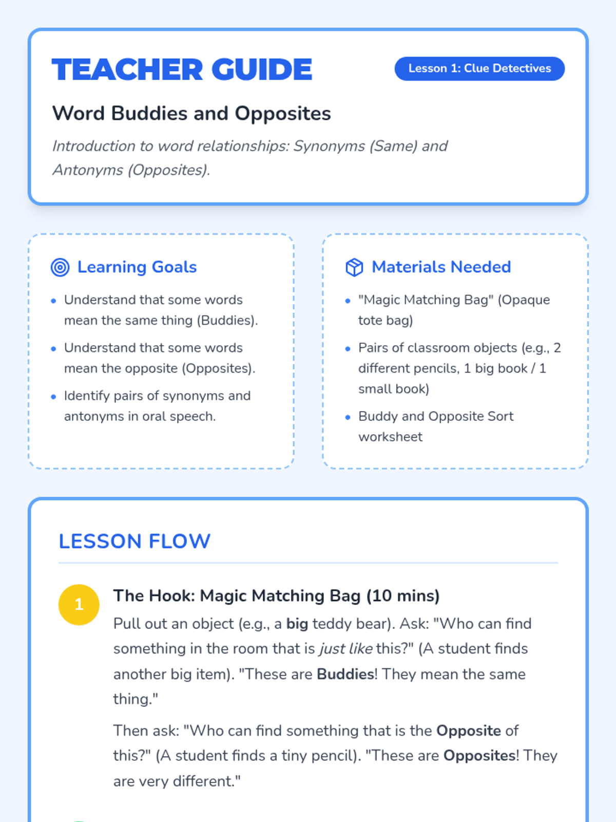 A Kindergarten sequence focused on teaching students how to use synonyms, antonyms, and example clues to decode unfamiliar words through play, movement, and detective-themed activities. Students develop foundational linguistic skills by identifying word relationships and using them as keys to unlock meaning in sentences.
