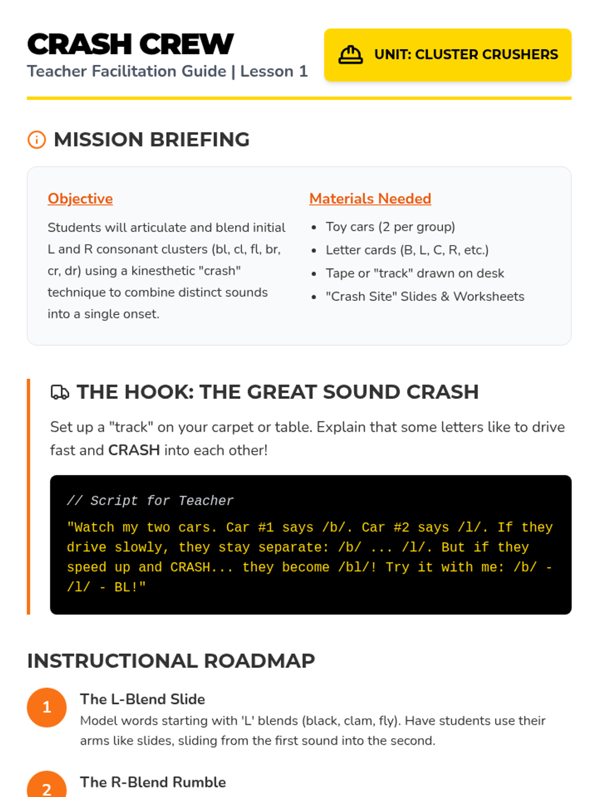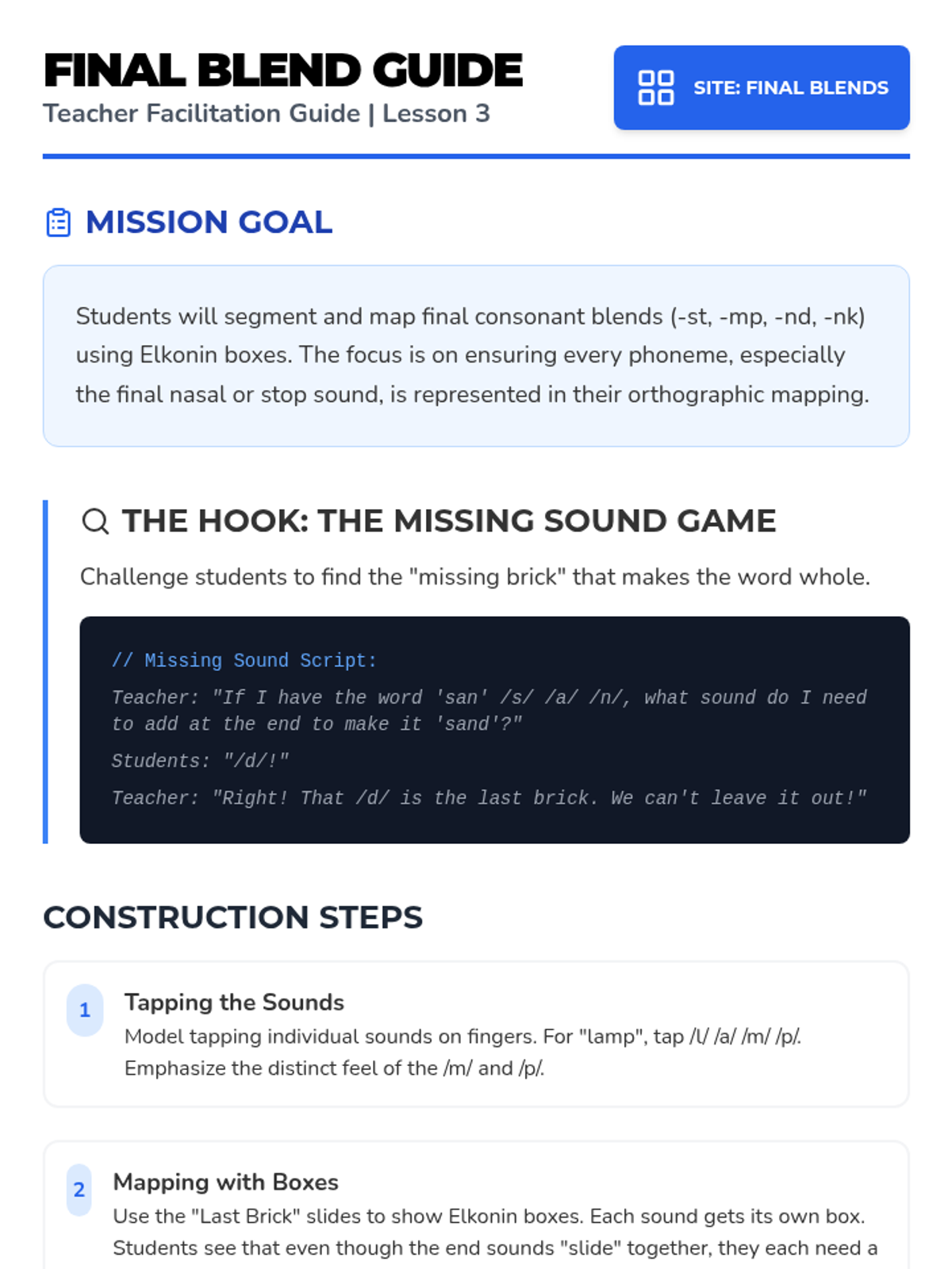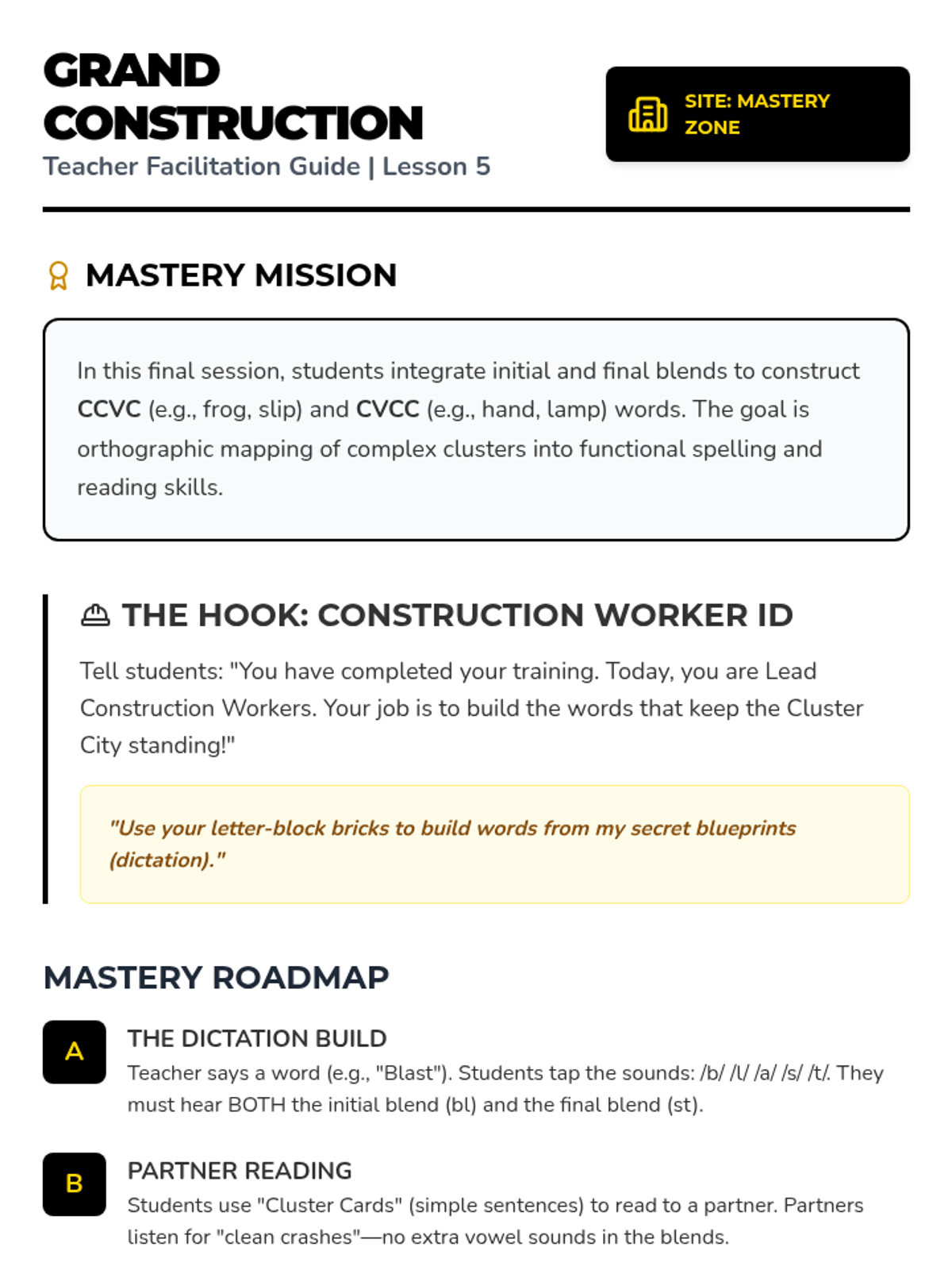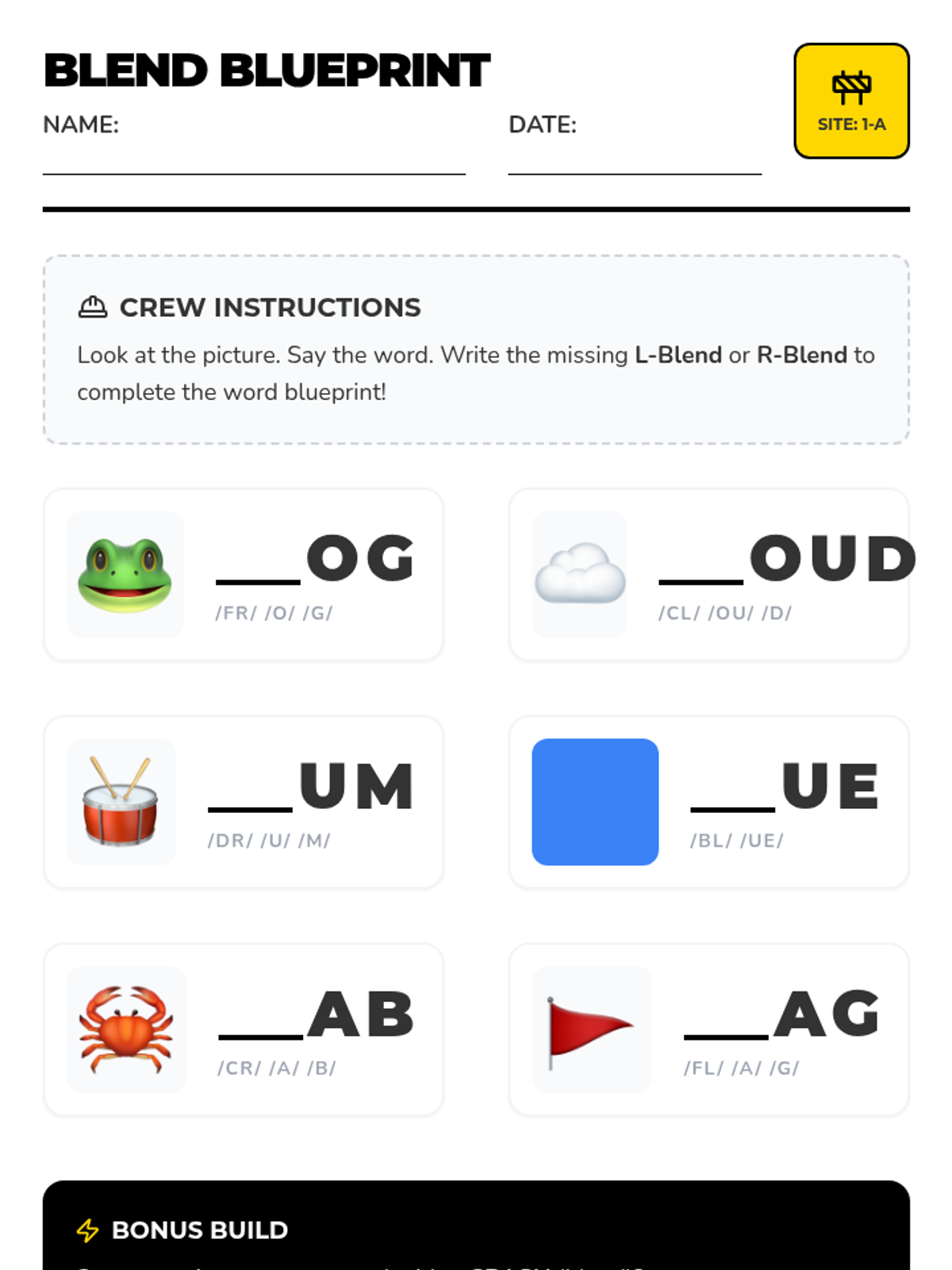 A comprehensive 1st-grade phonics sequence focused on mastering consonant blends. Students explore initial L, R, and S blends, move to final blends, differentiate blends from digraphs, and culminate in building complex CCVC and CVCC words using a 'Construction Site' theme.