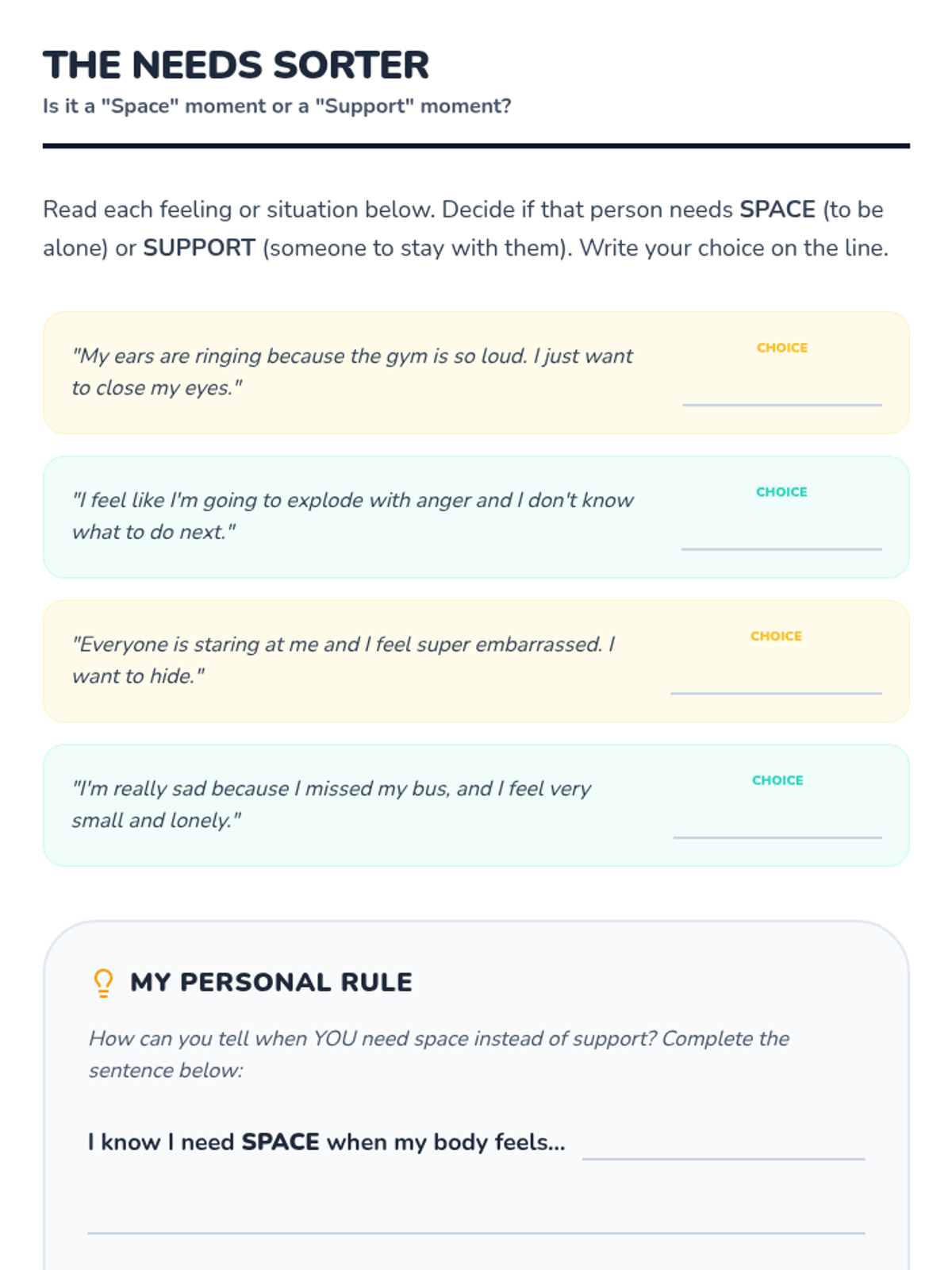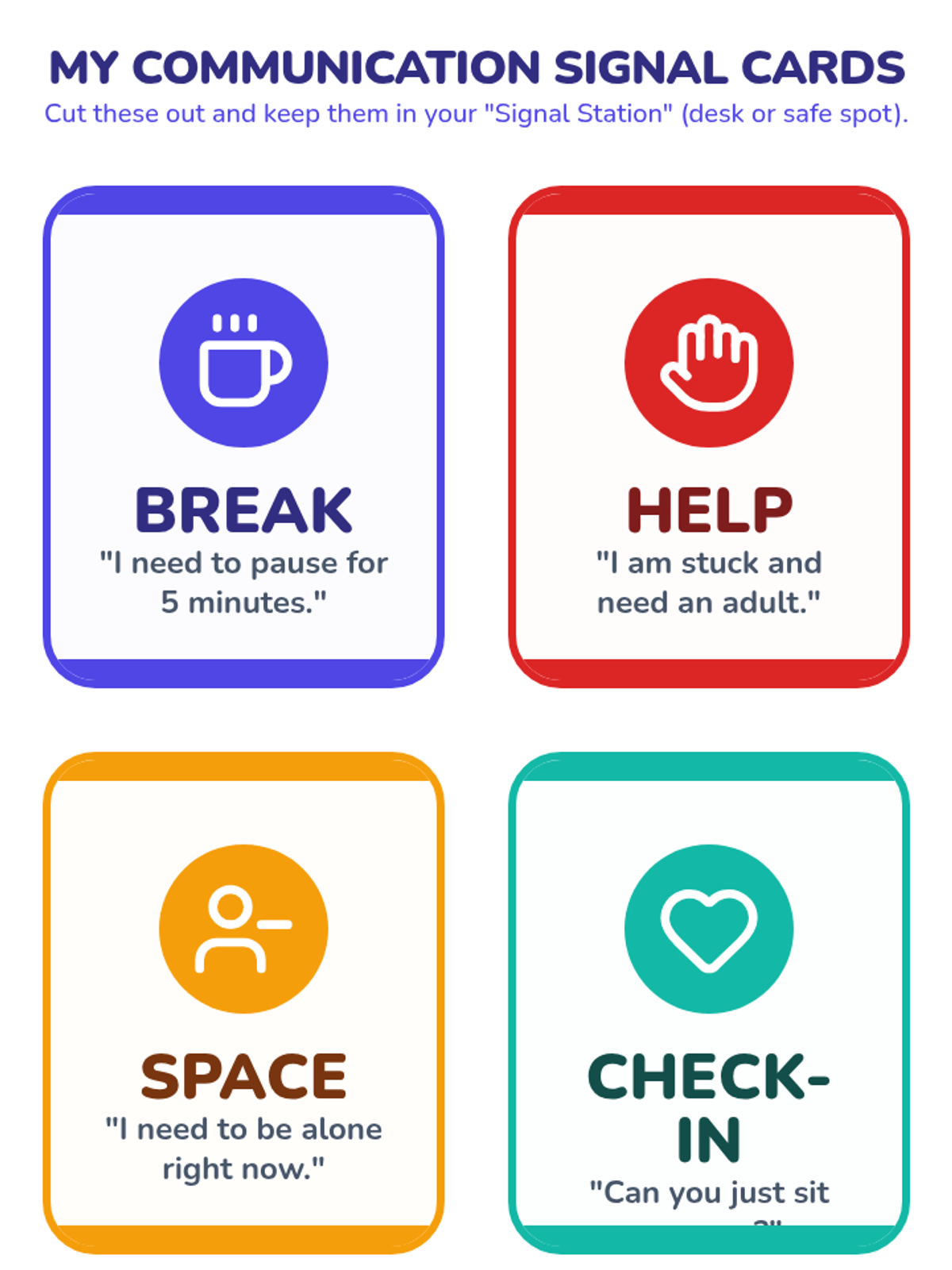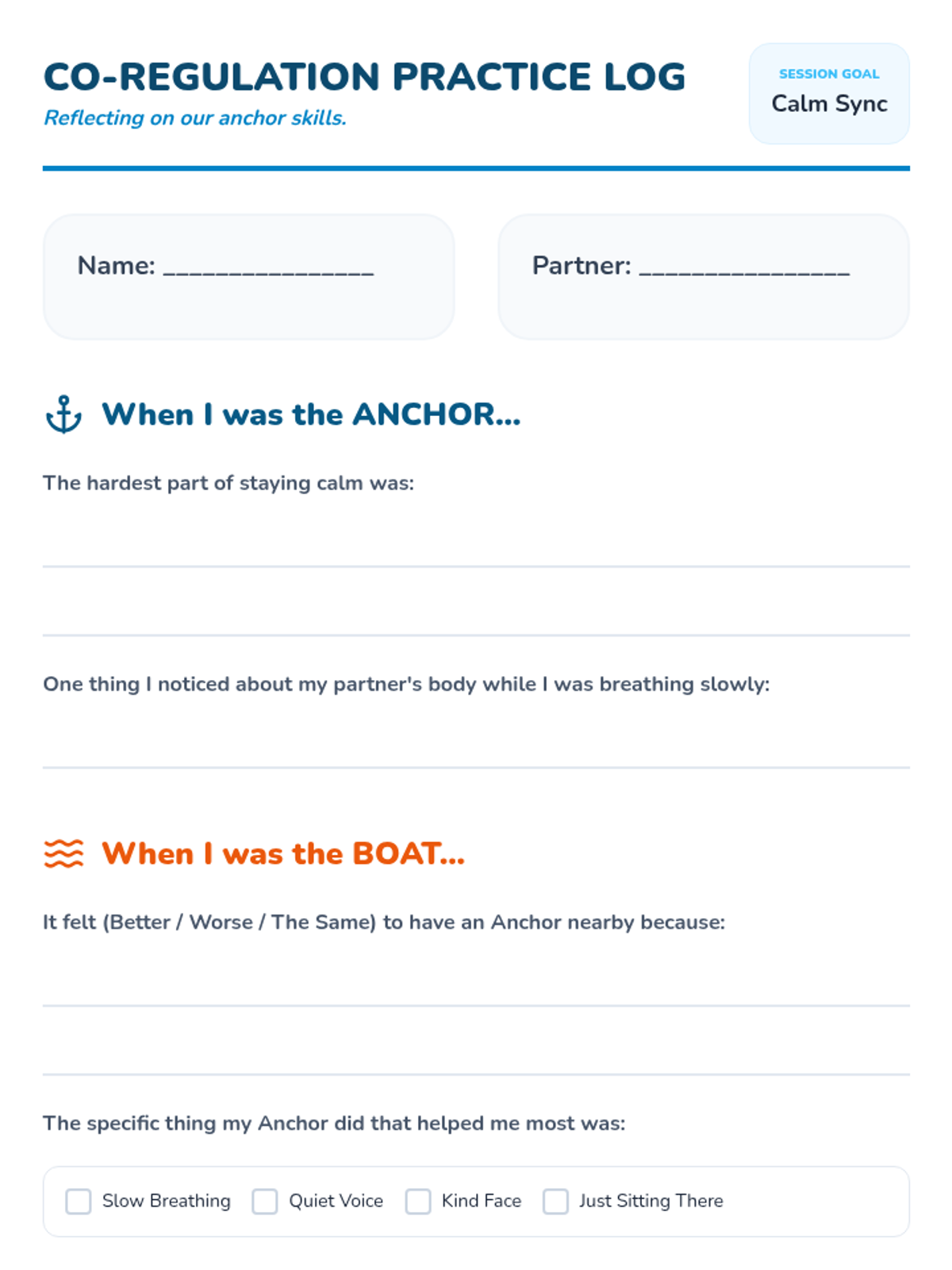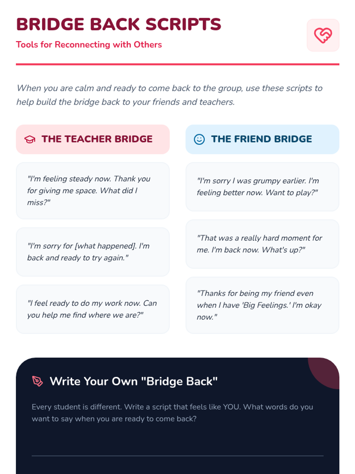 A 4th-grade sequence focused on building interpersonal recovery skills during sensory dysregulation. Students learn to use non-verbal signals, distinguish between the need for space versus support, and practice co-regulation strategies to repair relationships after high-intensity emotional events.