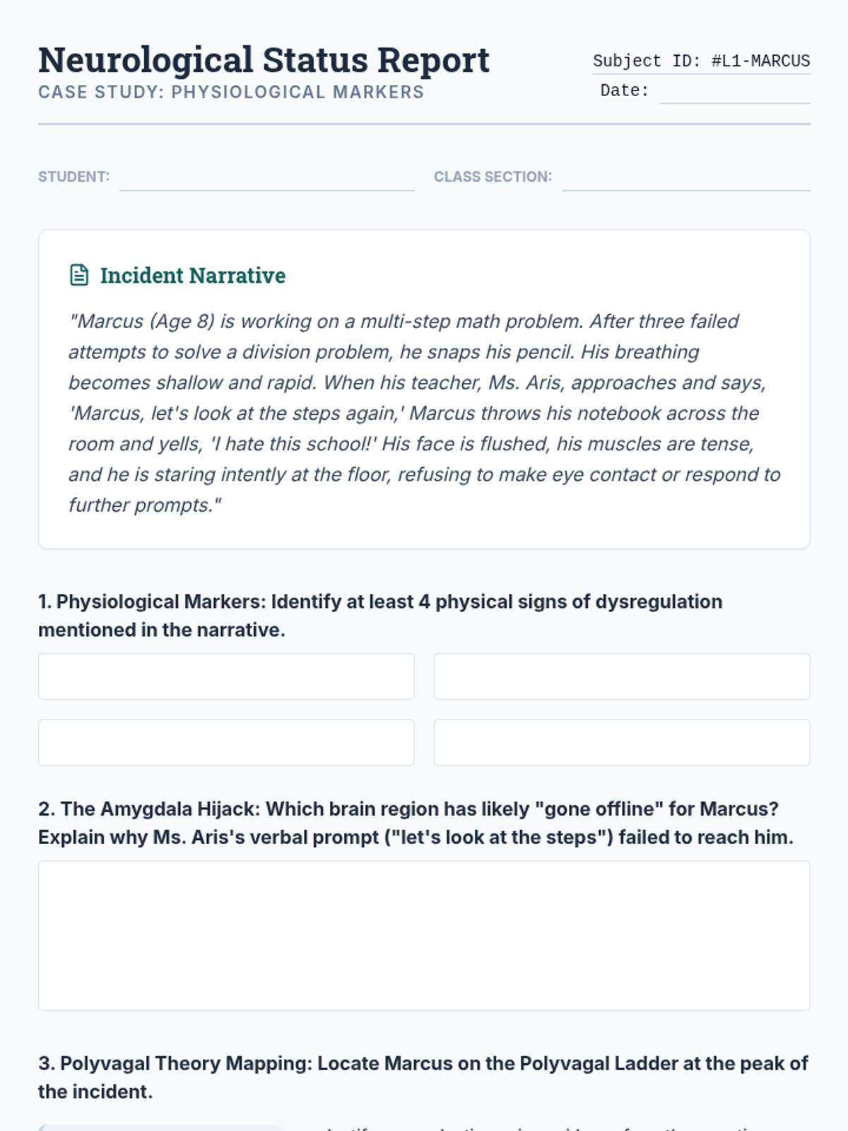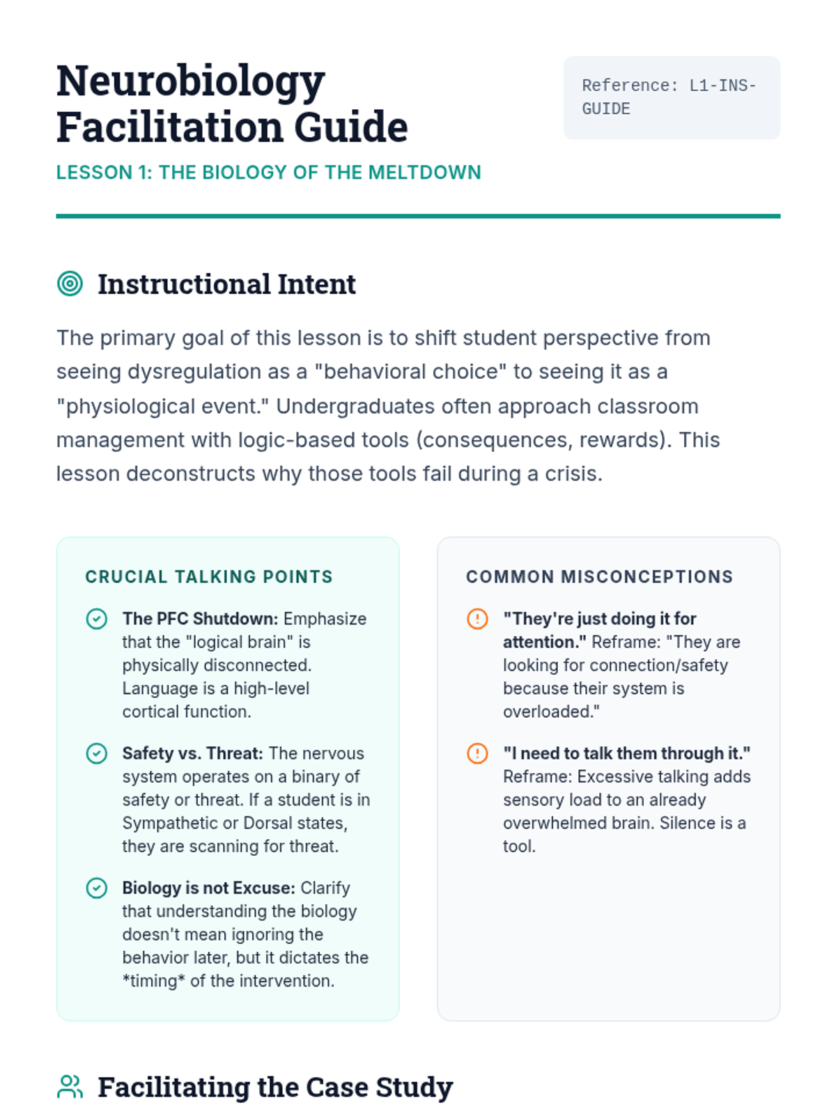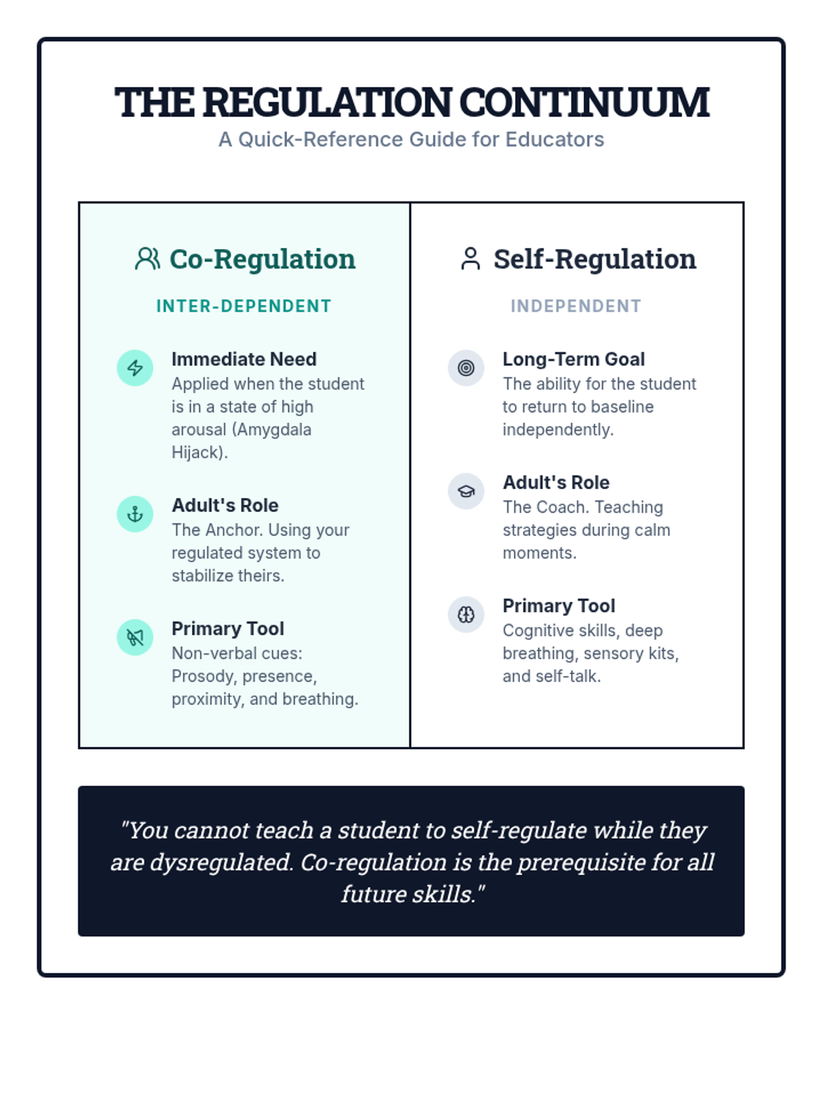 A comprehensive sequence for undergraduate education students exploring the neurobiology of dysregulation and the practical application of co-regulation strategies. Students will move from theoretical knowledge of the nervous system to mastery of non-verbal de-escalation and adult self-regulation techniques.