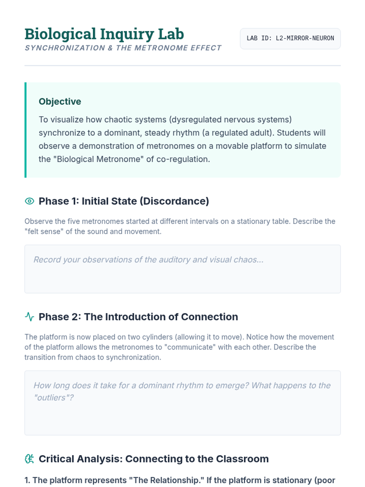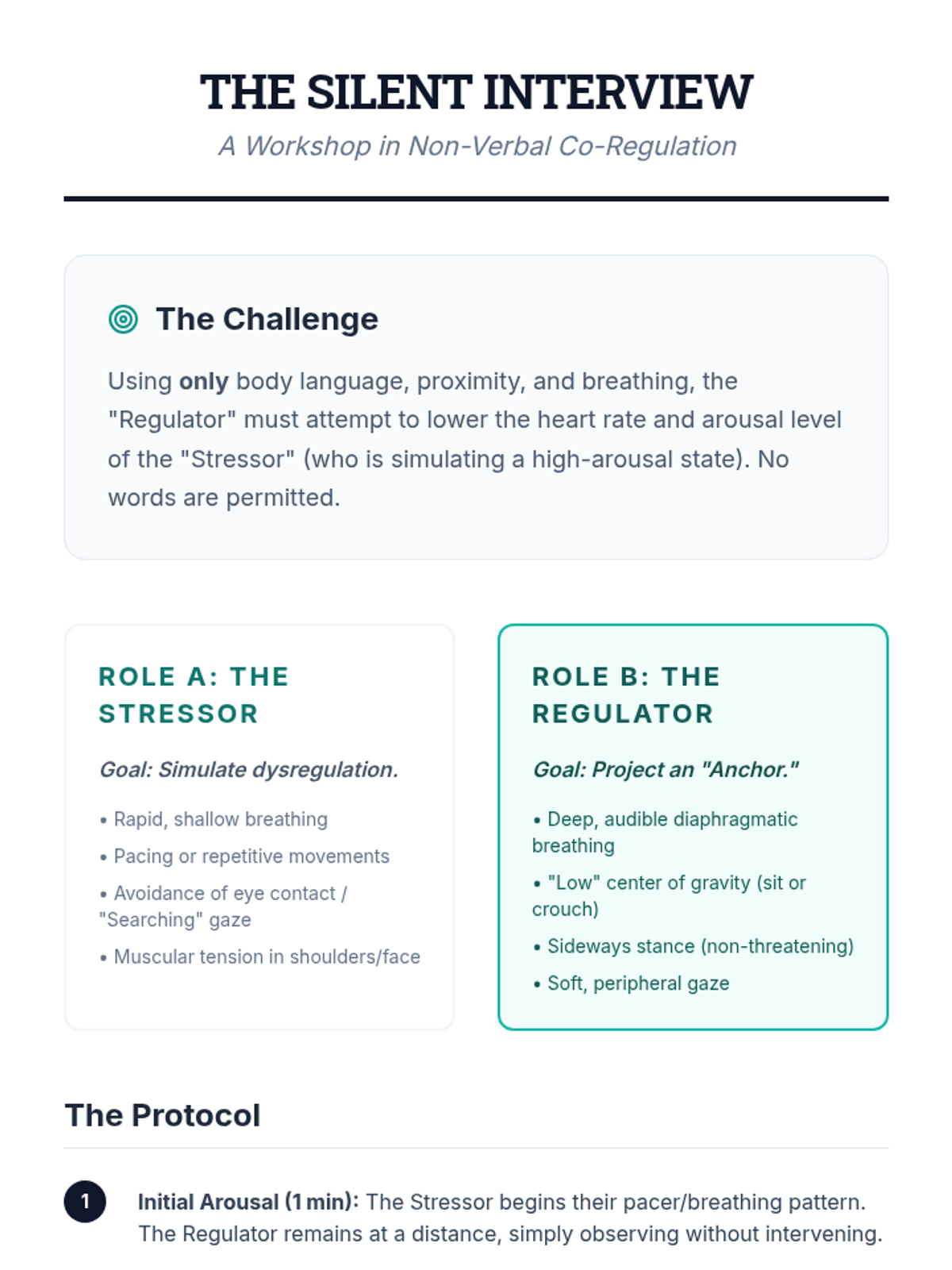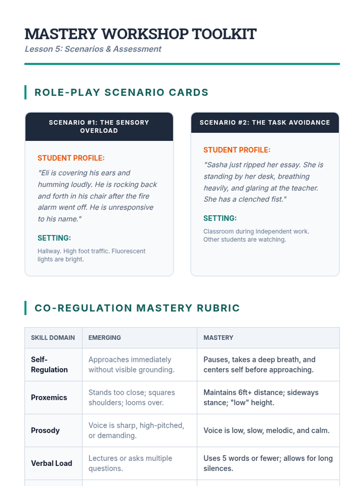 A comprehensive sequence for undergraduate education students exploring the neurobiology of dysregulation and the practical application of co-regulation strategies. Students will move from theoretical knowledge of the nervous system to mastery of non-verbal de-escalation and adult self-regulation techniques.