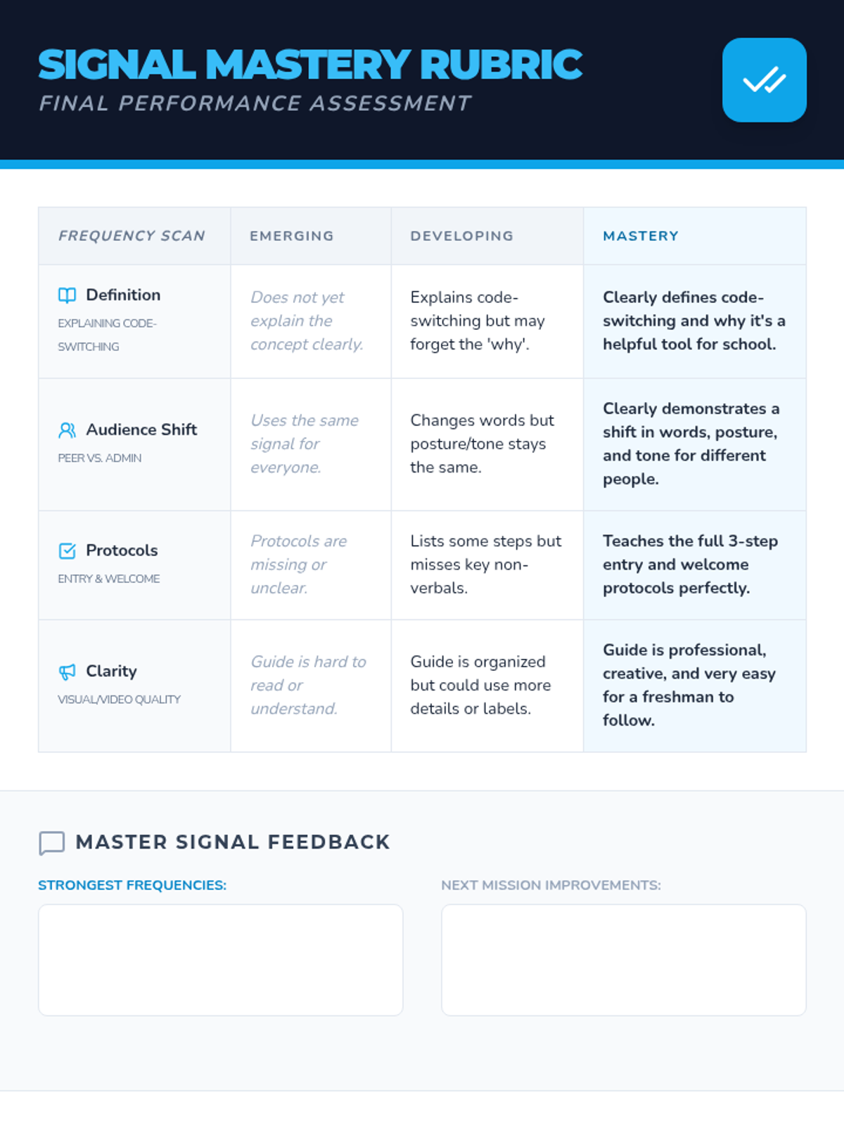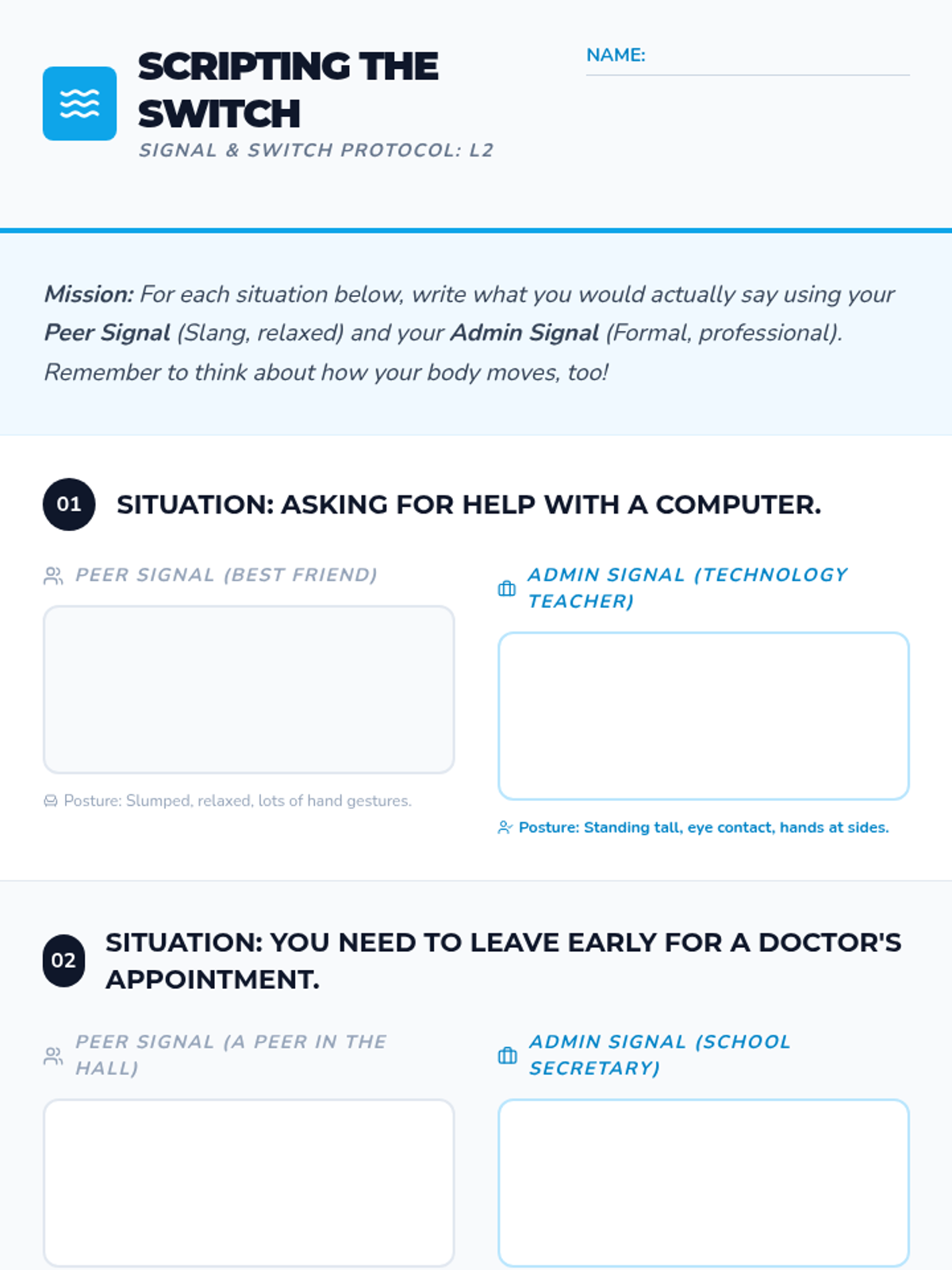 This sequence helps 10th-grade students understand and practice code-switching in school environments. It validates their natural peer language while teaching the skills needed to adapt their communication for authority figures and formal situations.