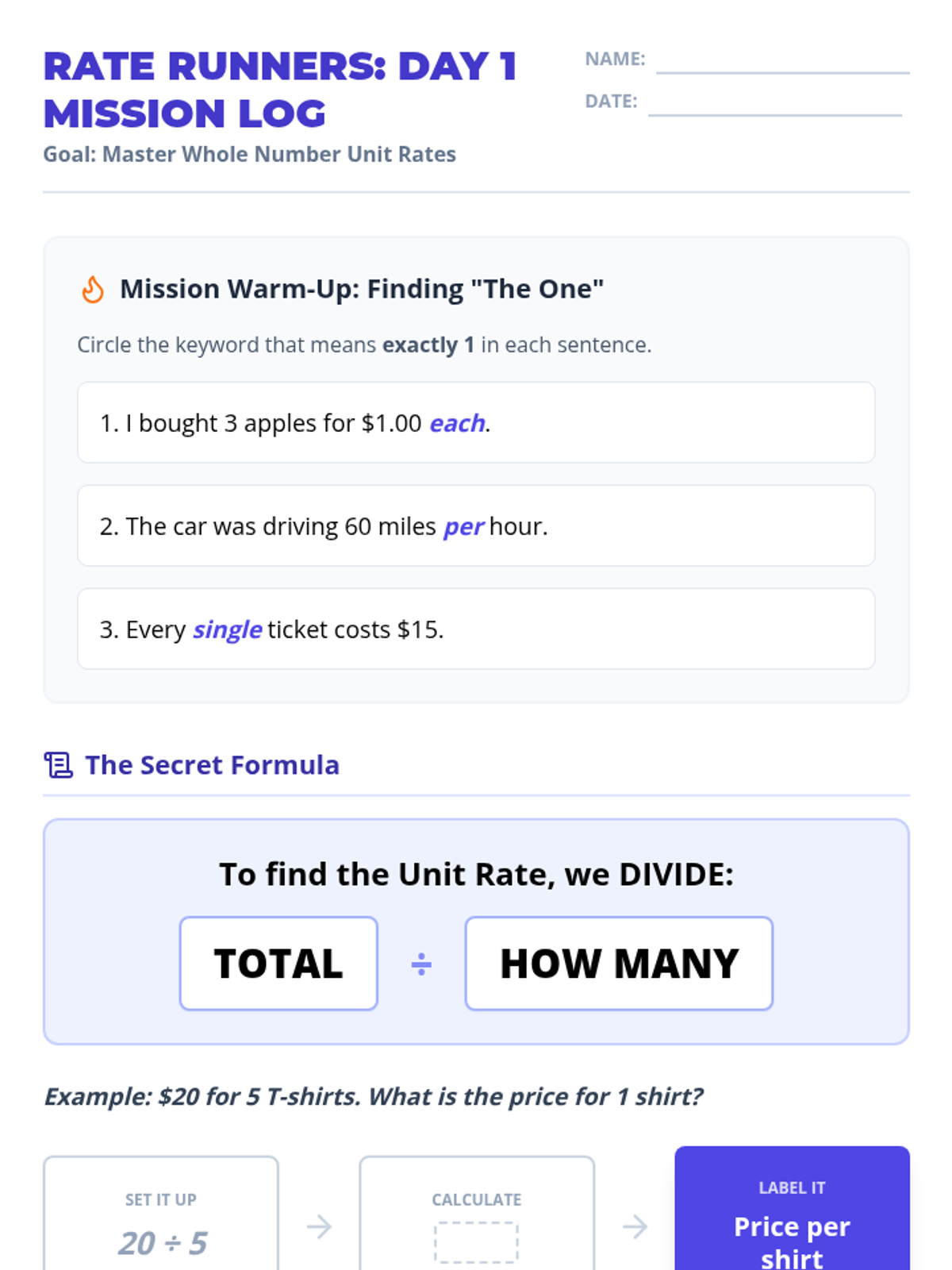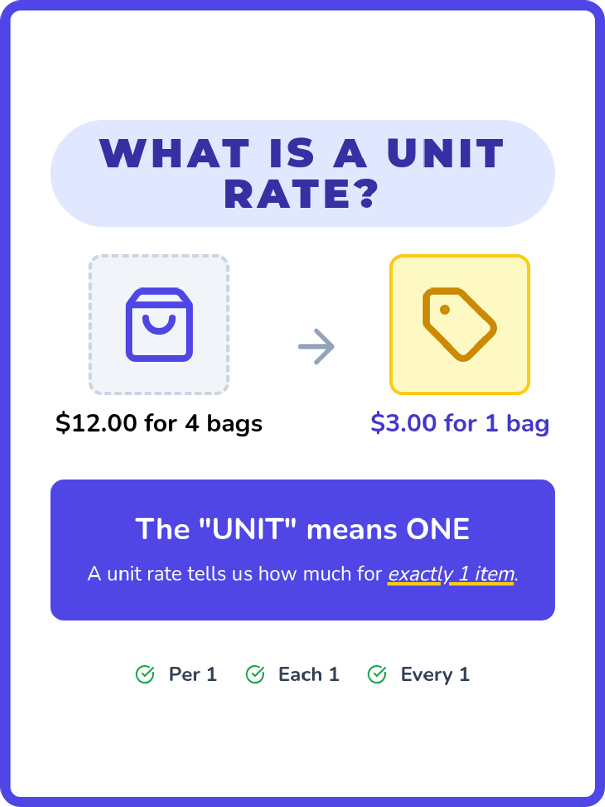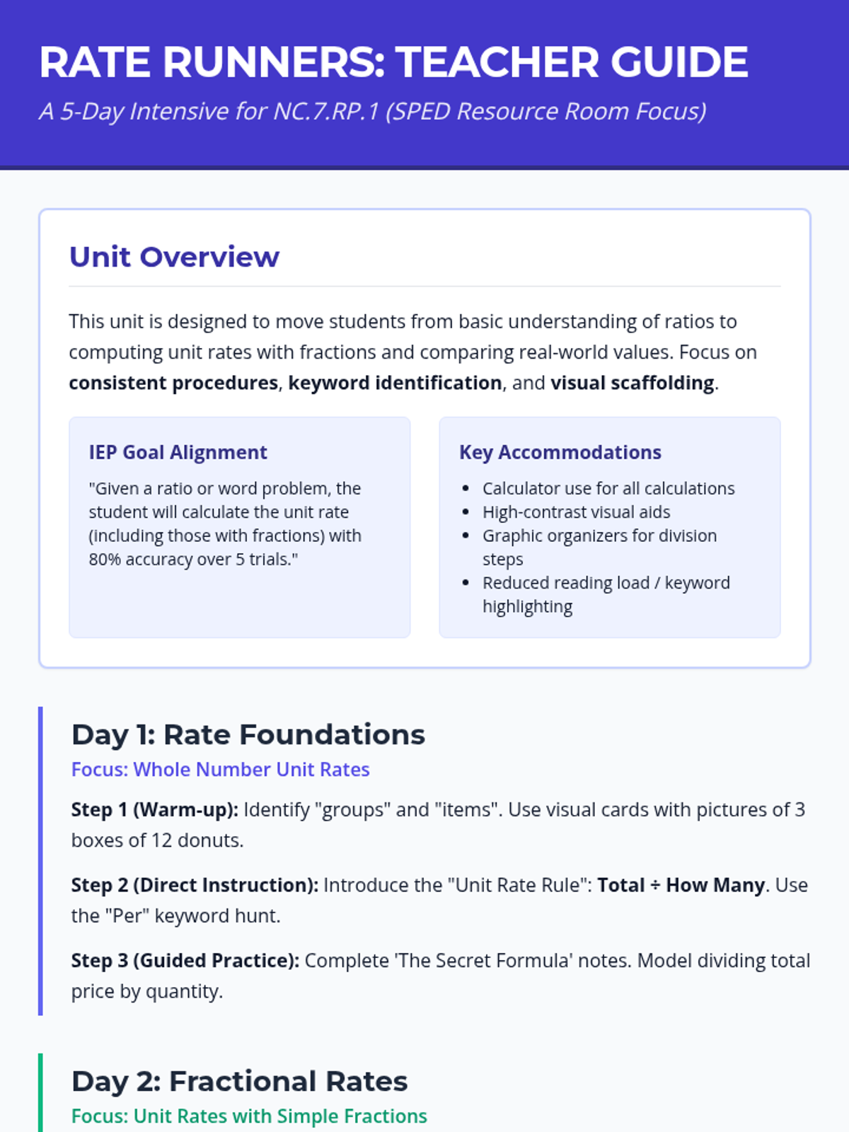 A 5-day intensive test prep unit for NC.7.RP.1 focused on unit rates. Designed specifically for special education resource rooms with heavy scaffolding, visual aids, and real-world shopping and measurement applications.