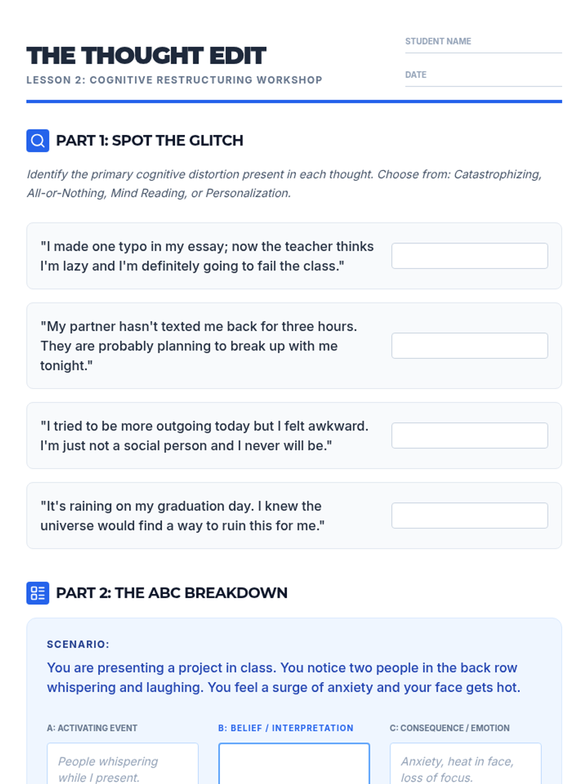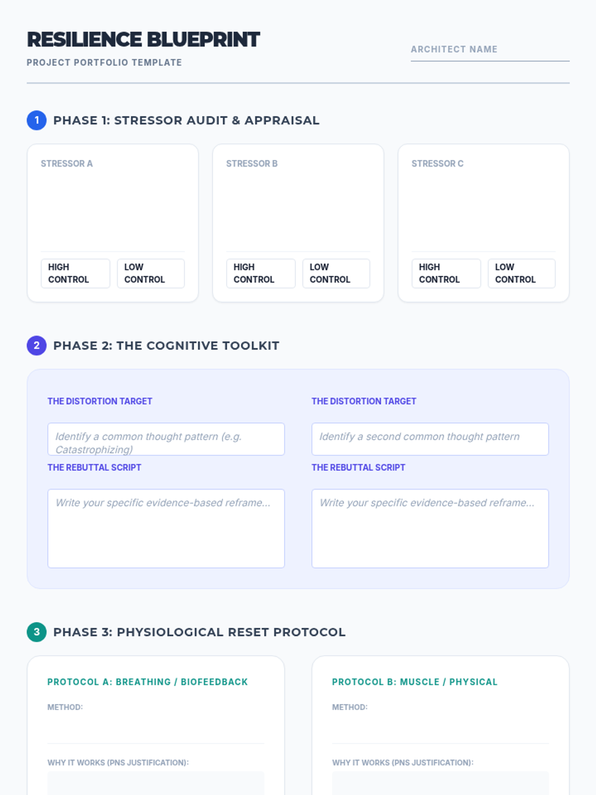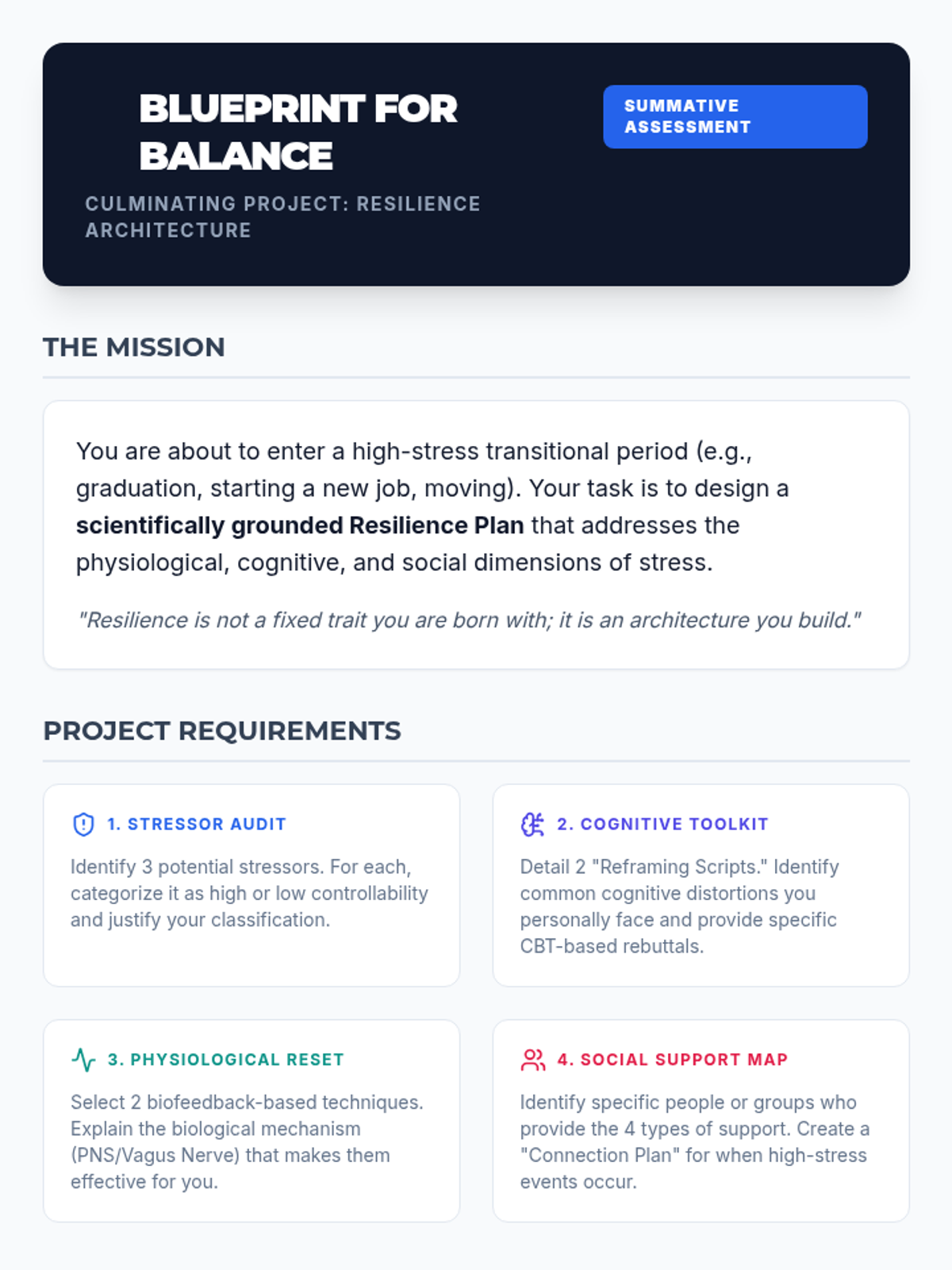 A comprehensive psychology unit for 12th graders focused on evidence-based coping mechanisms, cognitive restructuring, and the development of personal resilience plans. Students move from understanding physiological stress to applying CBT techniques and social support theories.
