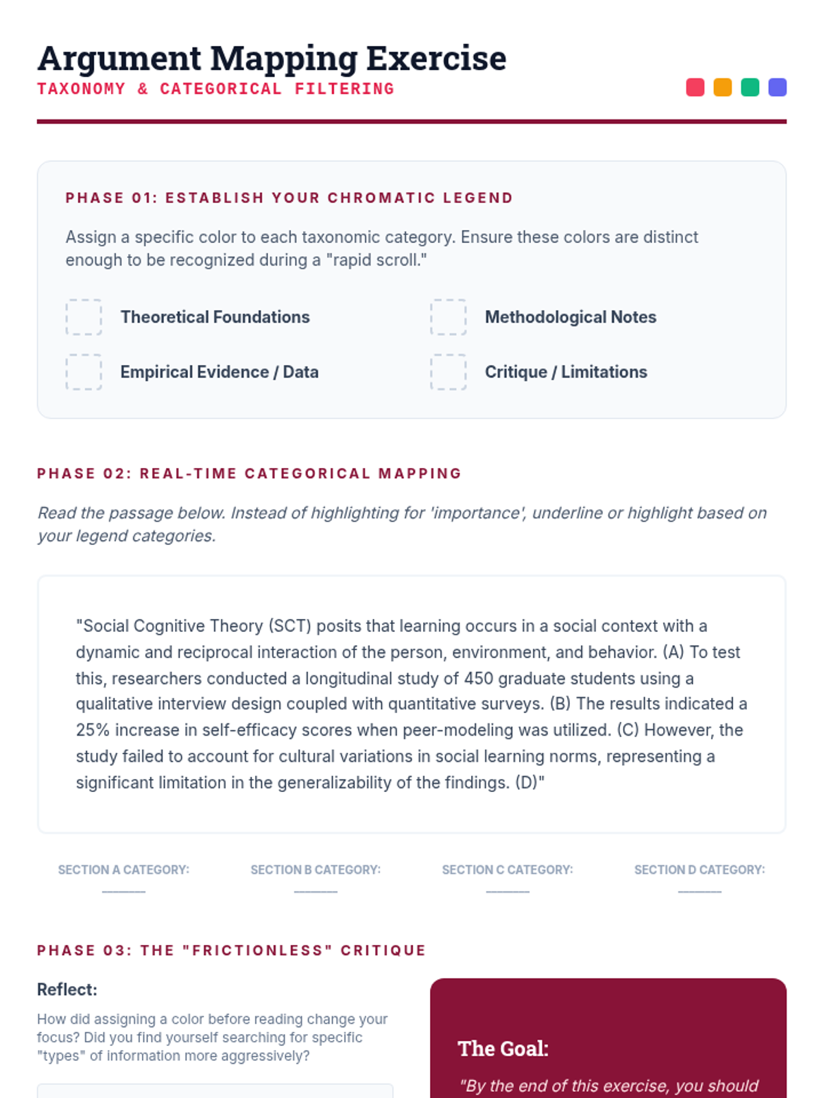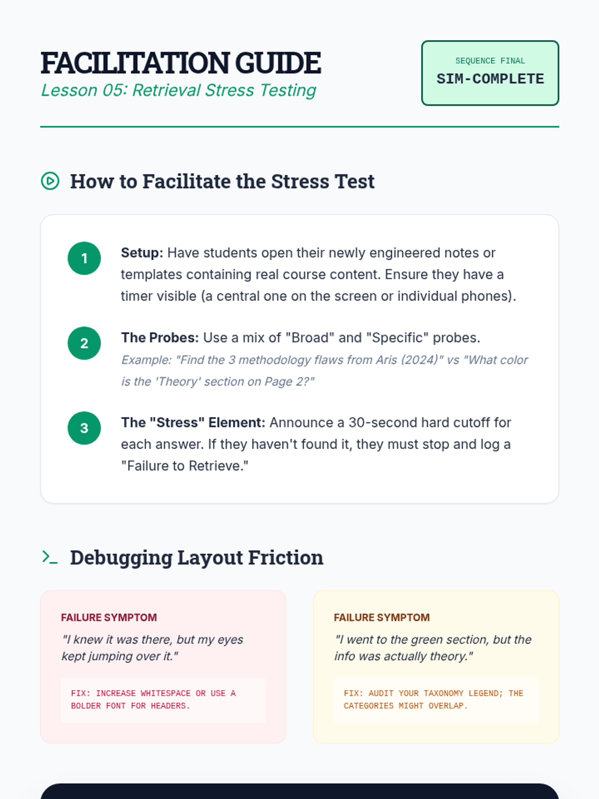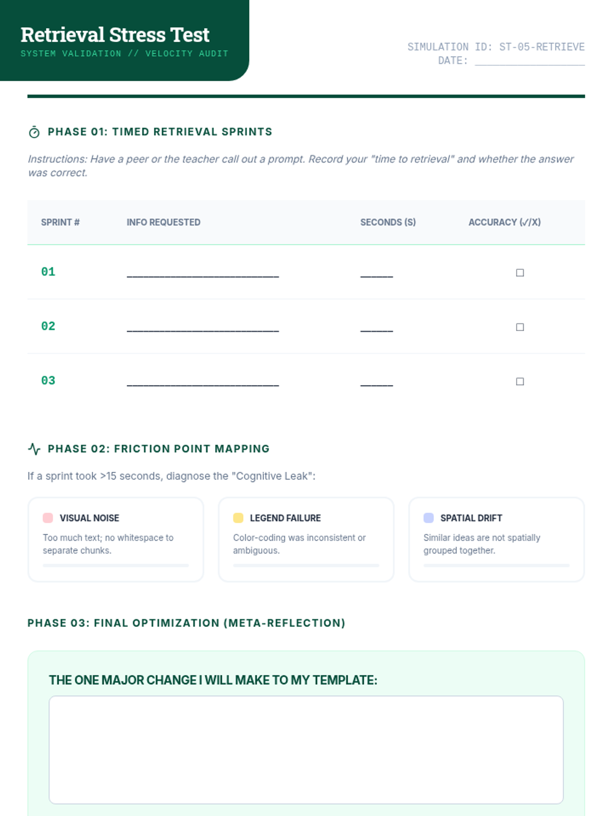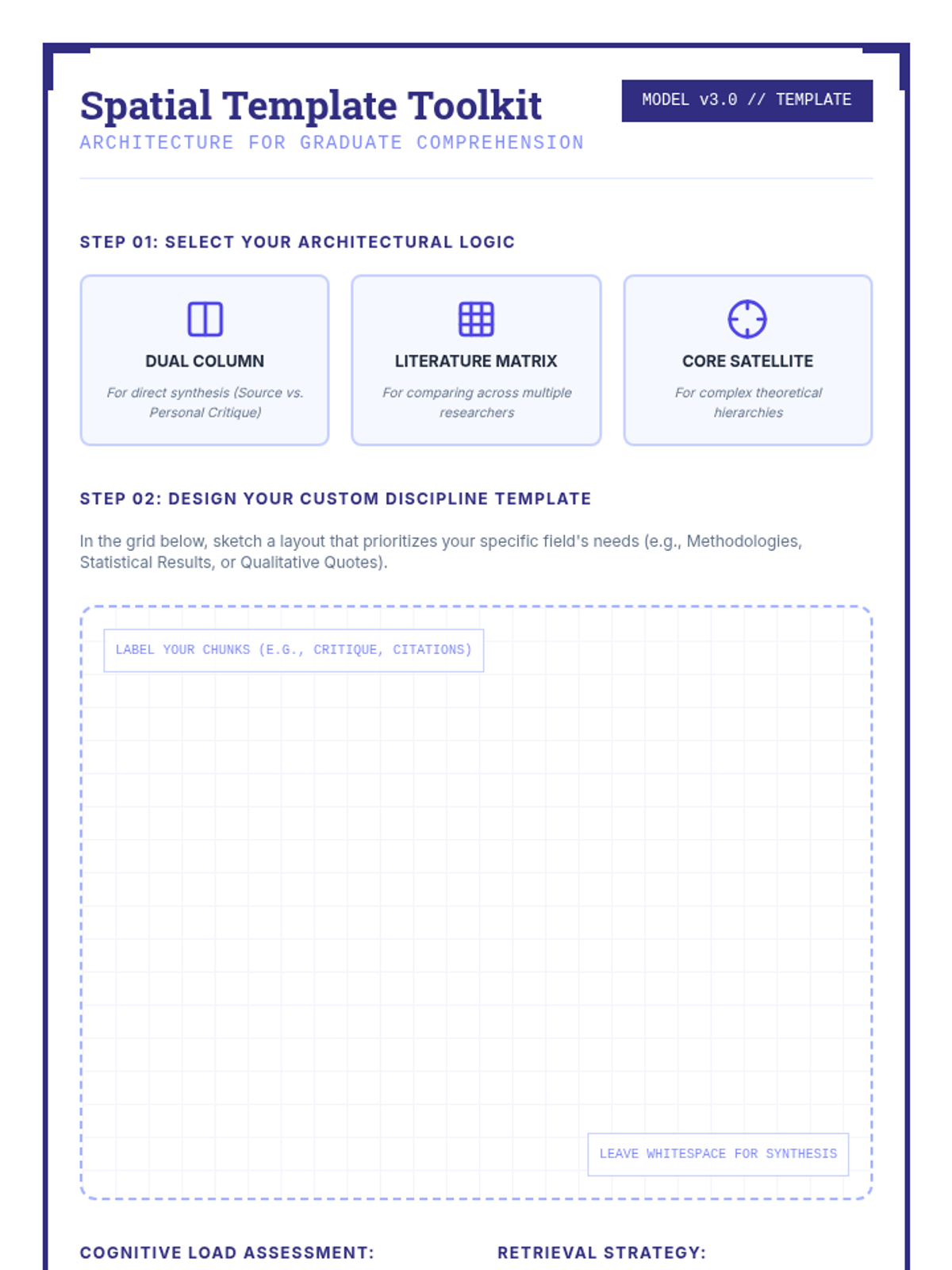 This sequence for graduate students focuses on reducing cognitive load through visual layout strategies, dual coding, and spatial organization. Students learn to re-engineer academic notes into templates that bypass working memory bottlenecks and enhance retrieval.