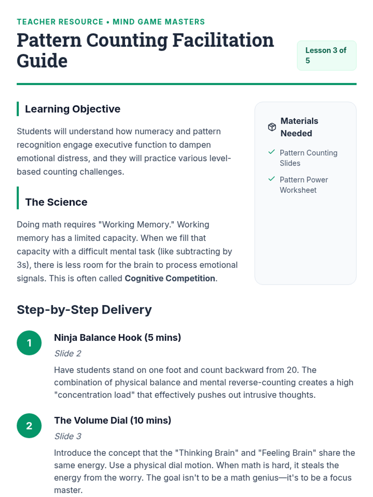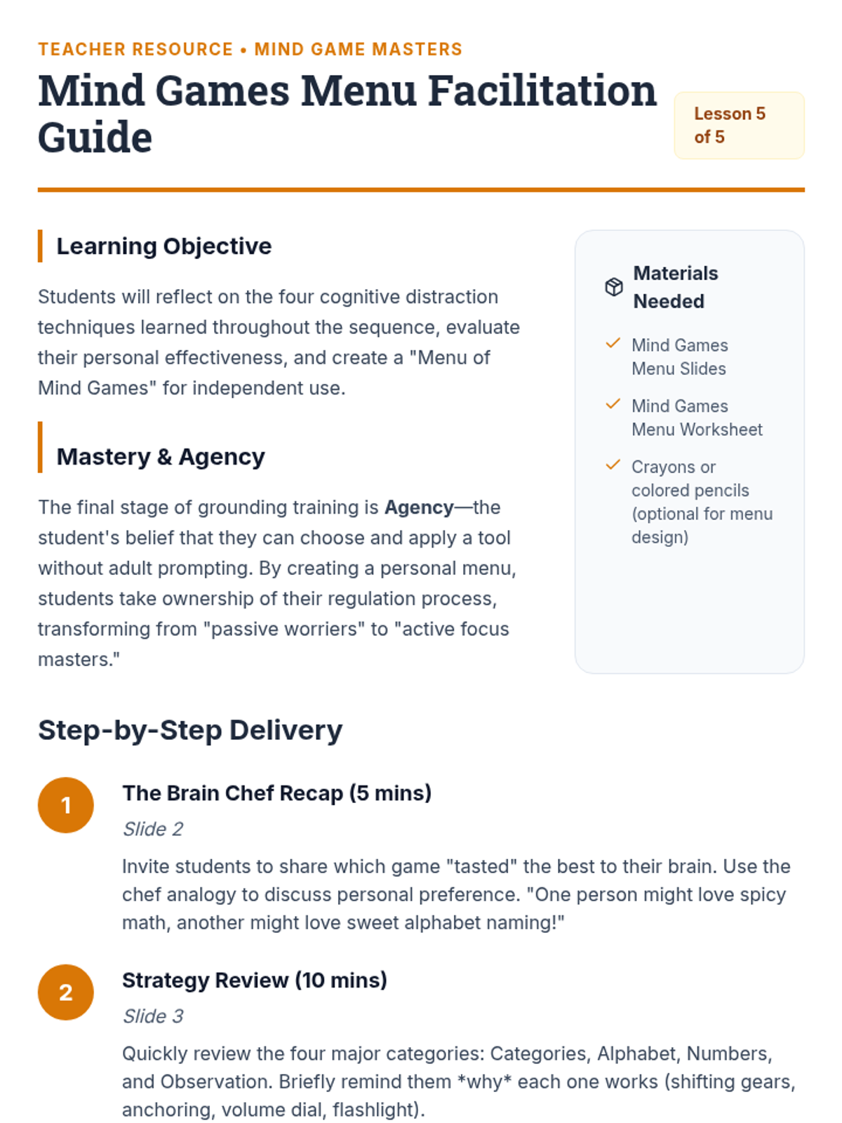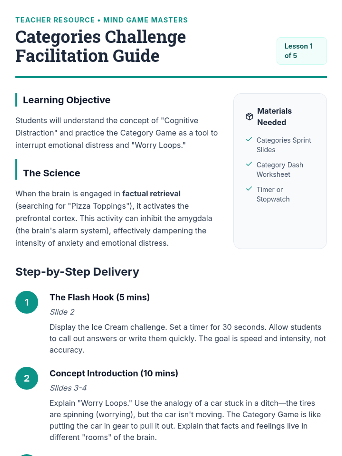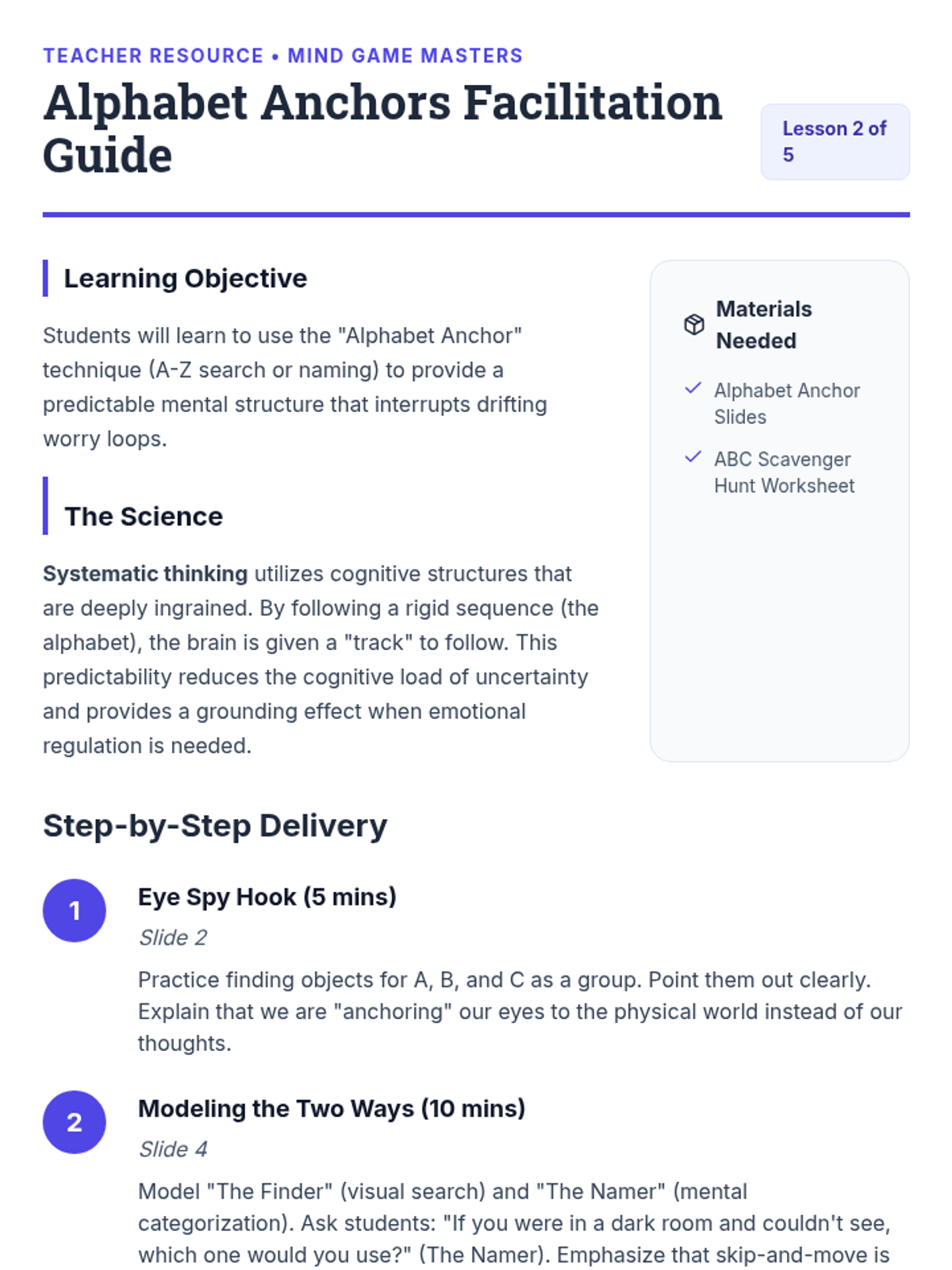A 5-lesson sequence for 3rd graders focused on cognitive distraction techniques. Students learn to use mental games like categorization, alphabet searches, and math patterns to redirect focus away from anxiety loops and back to the present moment.
