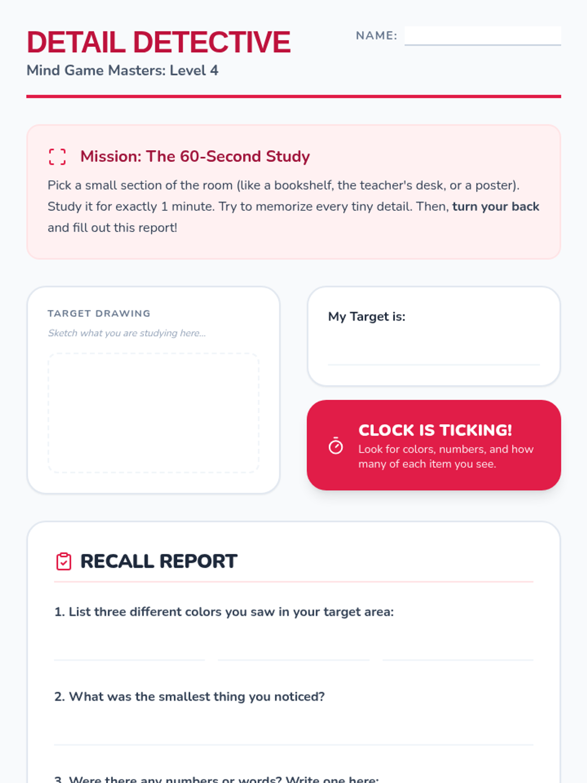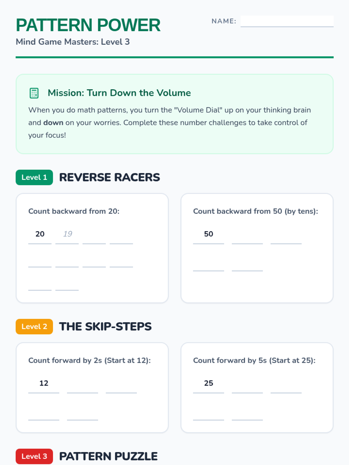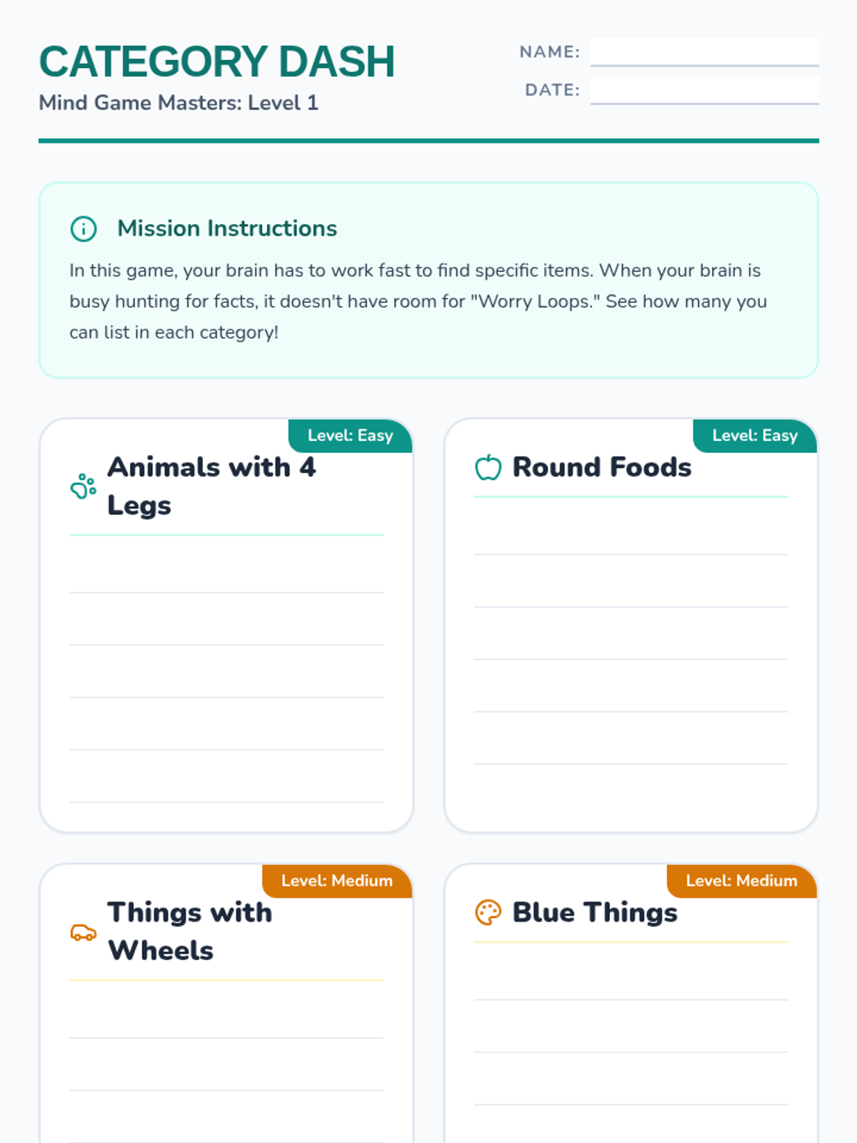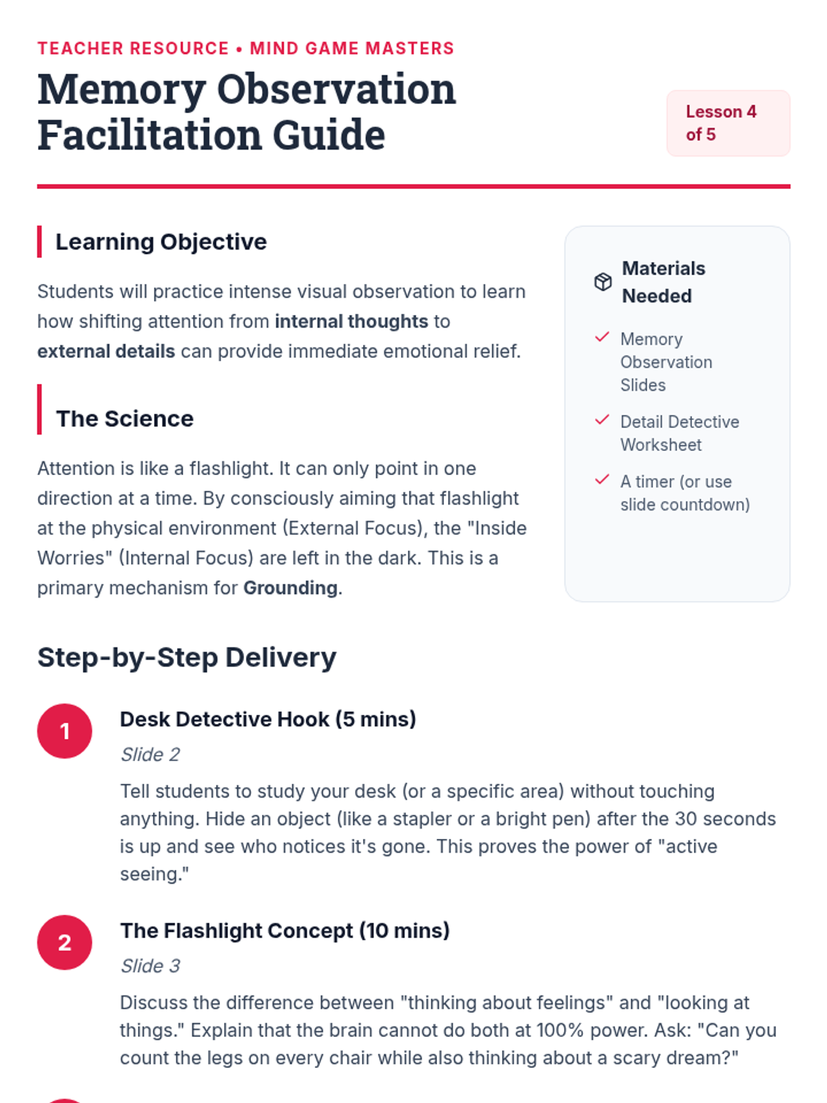 A 5-lesson sequence for 3rd graders focused on cognitive distraction techniques. Students learn to use mental games like categorization, alphabet searches, and math patterns to redirect focus away from anxiety loops and back to the present moment.
