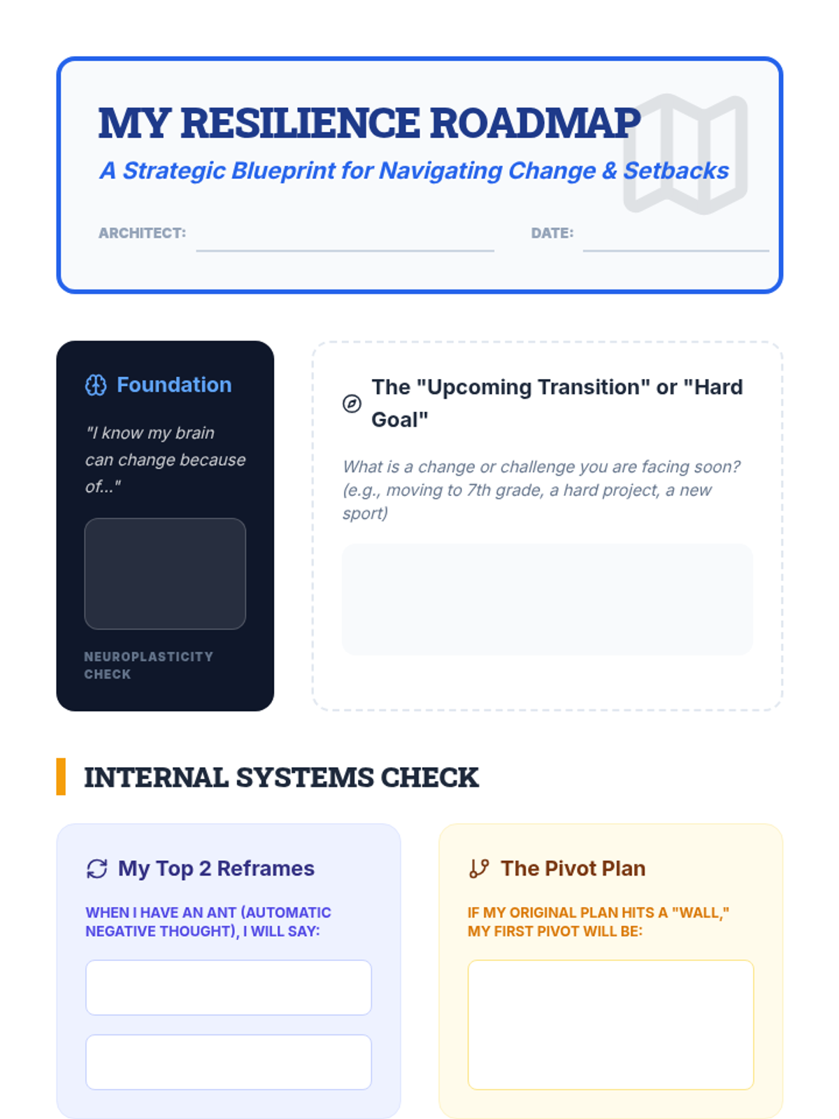 A comprehensive inquiry-based sequence for 6th graders exploring the science and practice of cognitive flexibility. Students learn about neuroplasticity, analyze historical pivots, reframe internal self-talk, and develop actionable strategies for navigating transitions and setbacks.