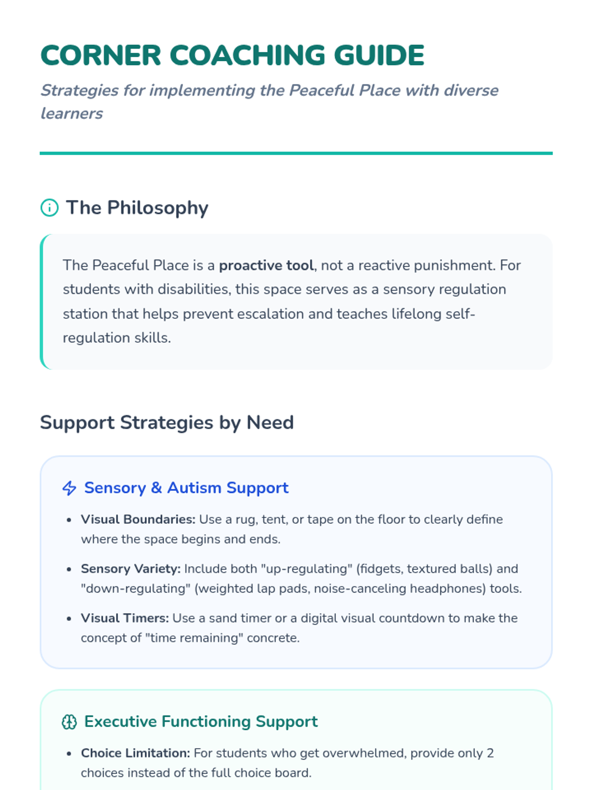 A dedicated training module focusing on executive function skills for K-2 students. Includes lessons on Focus (The Flashlight), Inhibition (The Stop Signal), Initiation (The Start Engine), Working Memory (The Recorder), Planning (The Mapmaker), Flexibility (The Play-Doh), and Emotional Control (The Volume Remote).